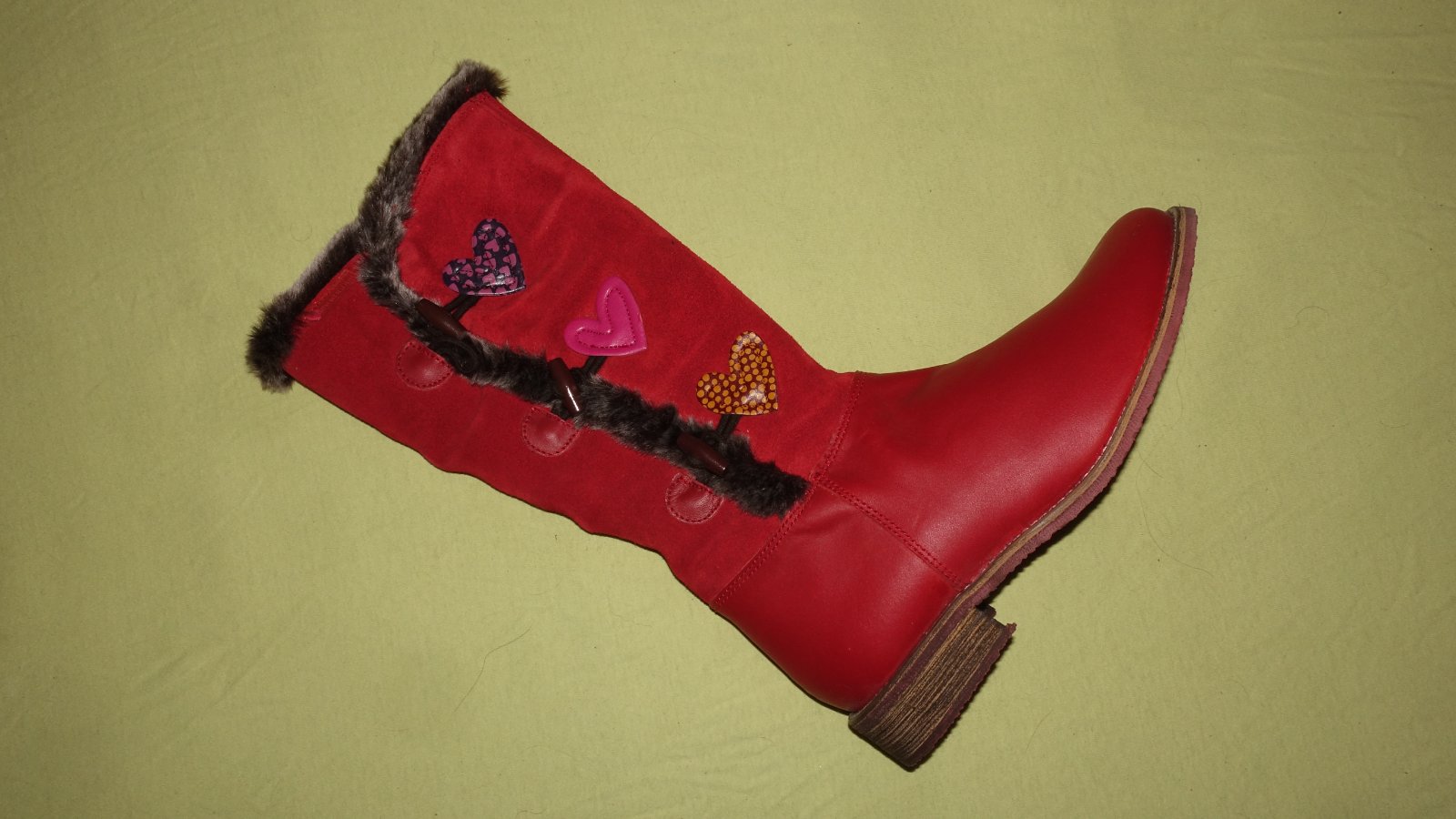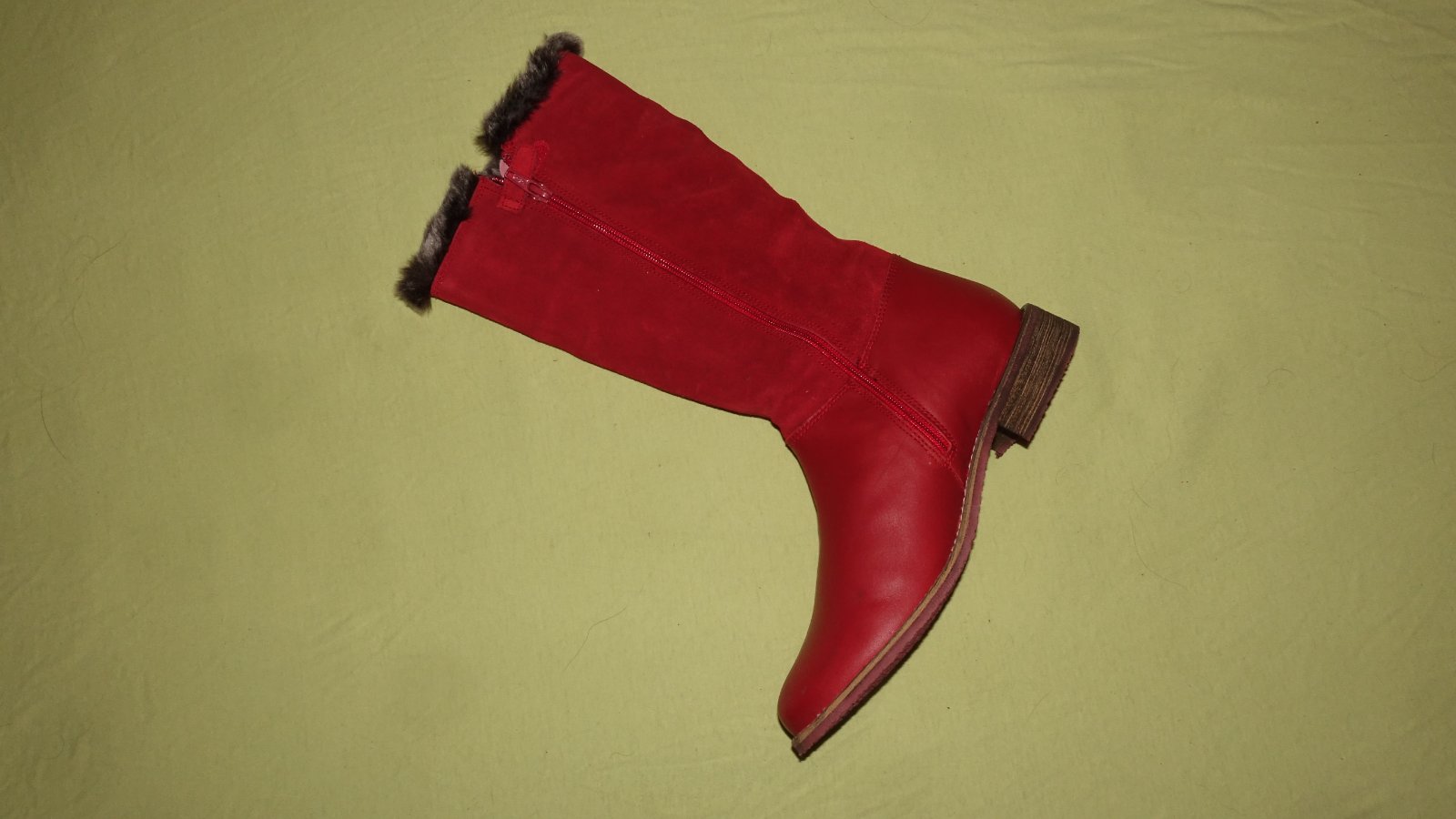 Nadherne kozene cizmicky- nove, v krabici (krabica je uz ale potrhana). Maju na sebe par tmavsich fliacikov, ale kedze su samotne tmavsie, vobec to nie je vidno. Su nadherne, zvnutra maju taky flis, nie su vsak do treskucej zimy.