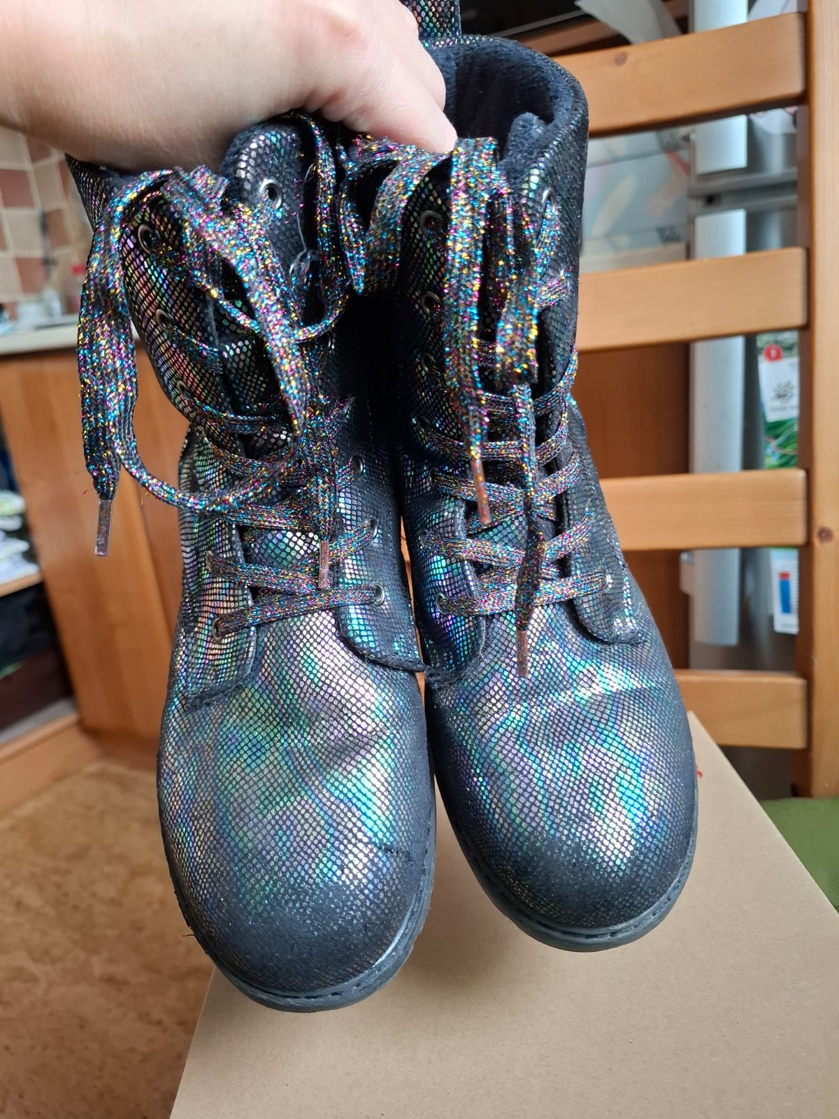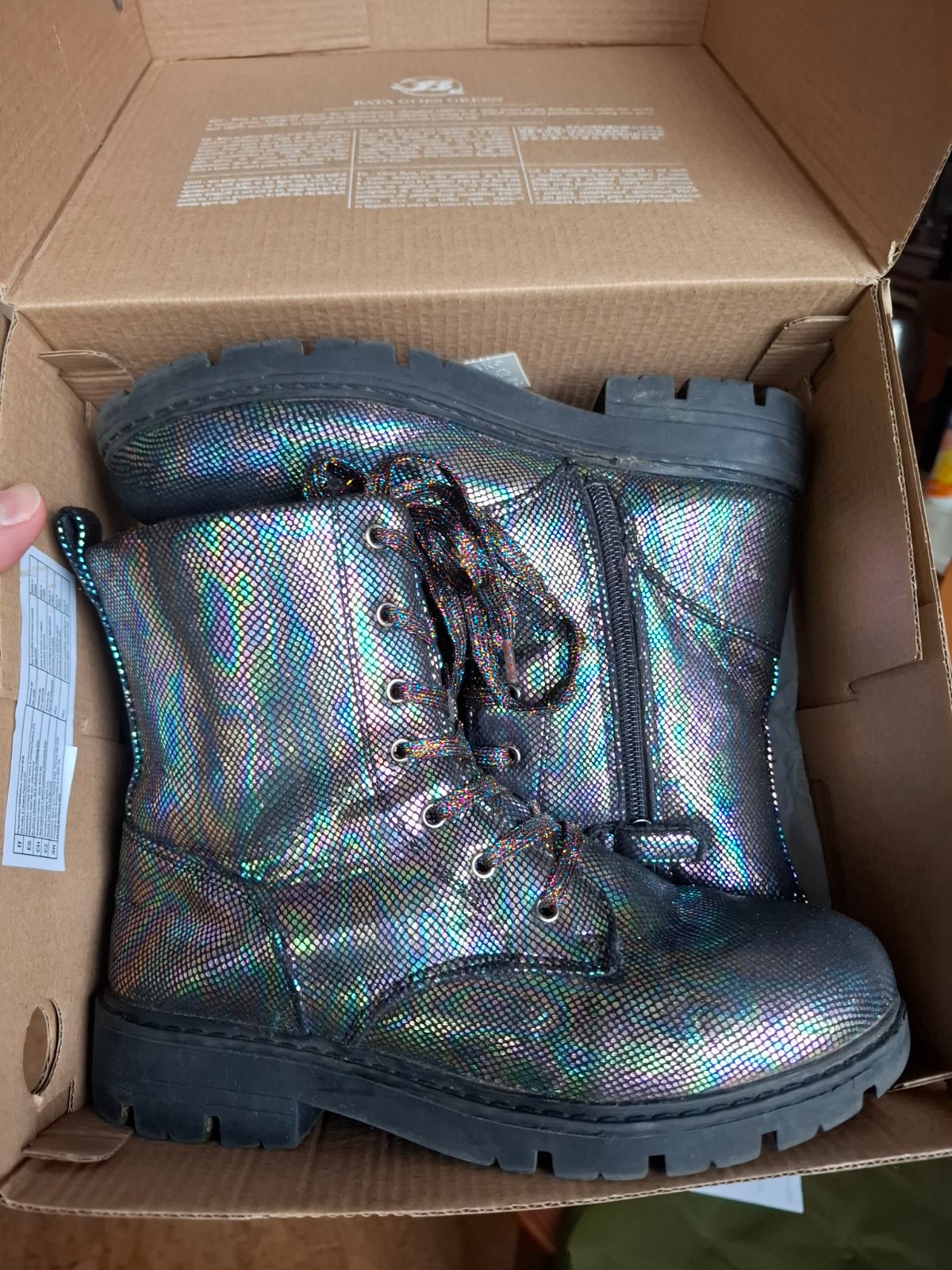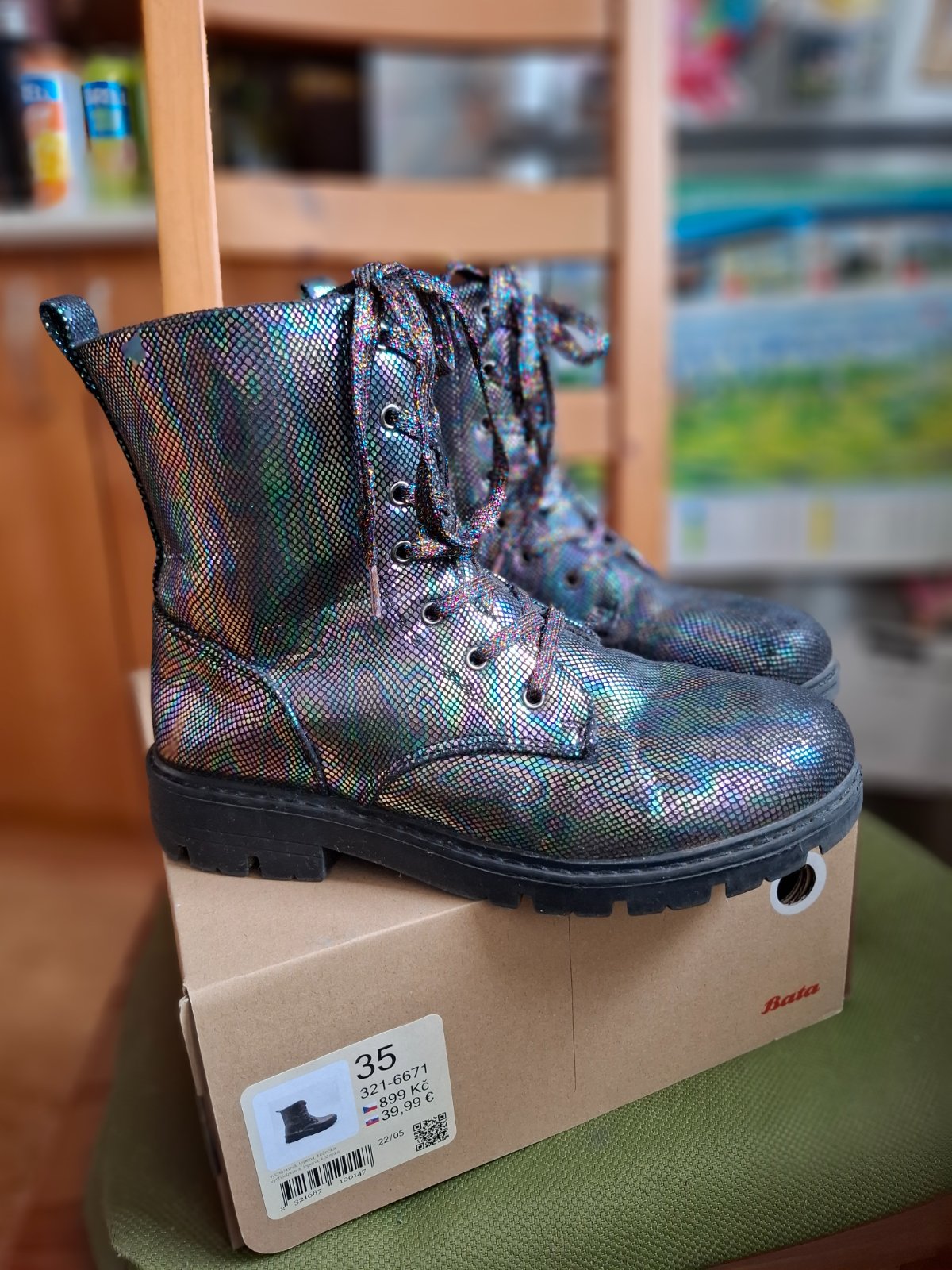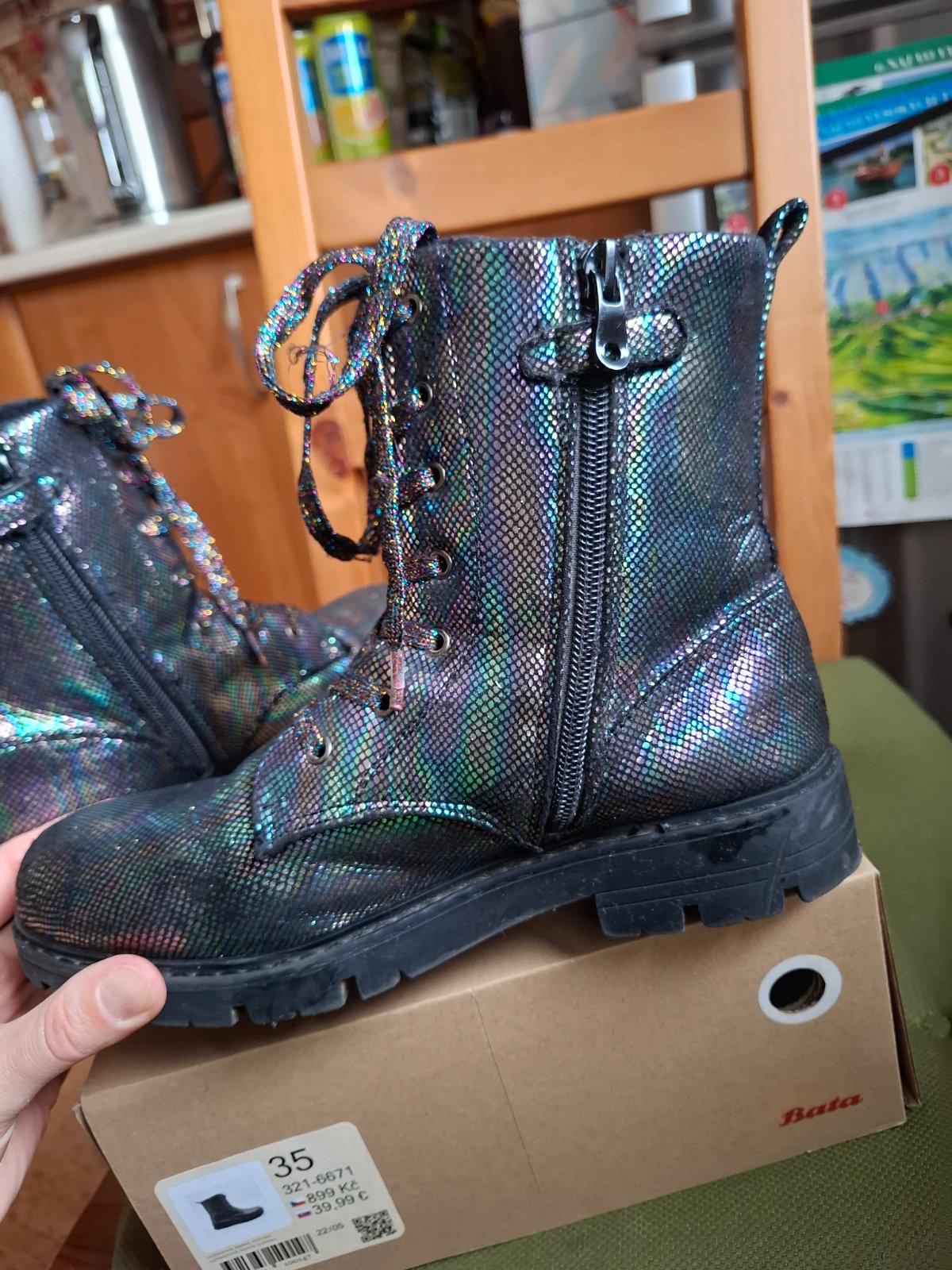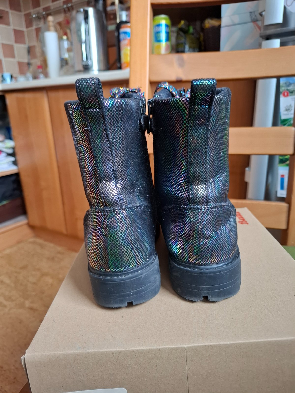 Predám krásne topánky/čižmičky po dcérke. Značka Baťa, veľkosť 35, makkučké, zateplené, farba je neskutočná. Vyzerajú ako šupinky z ryby, viď foto. Zapínanie na zips a dá sa utiahnuť aj šnúrkami. Boli skvelé. Veľmi dobrý stav, všetko funkčné, bežné známky nosenia.