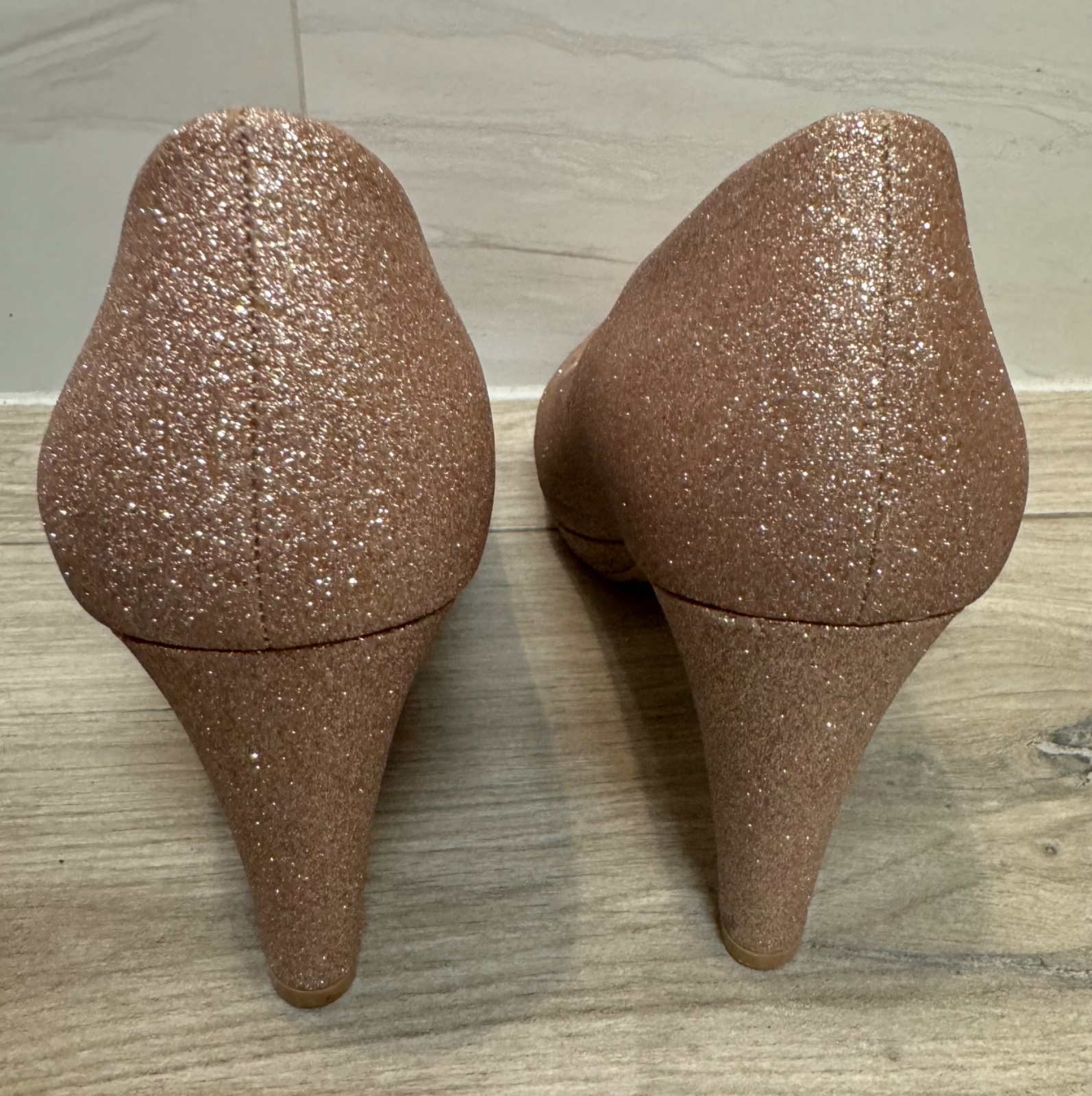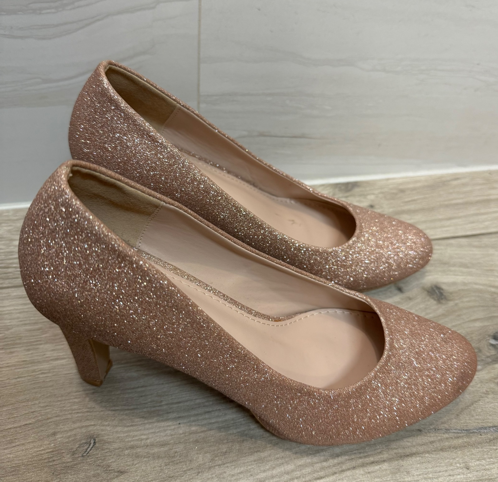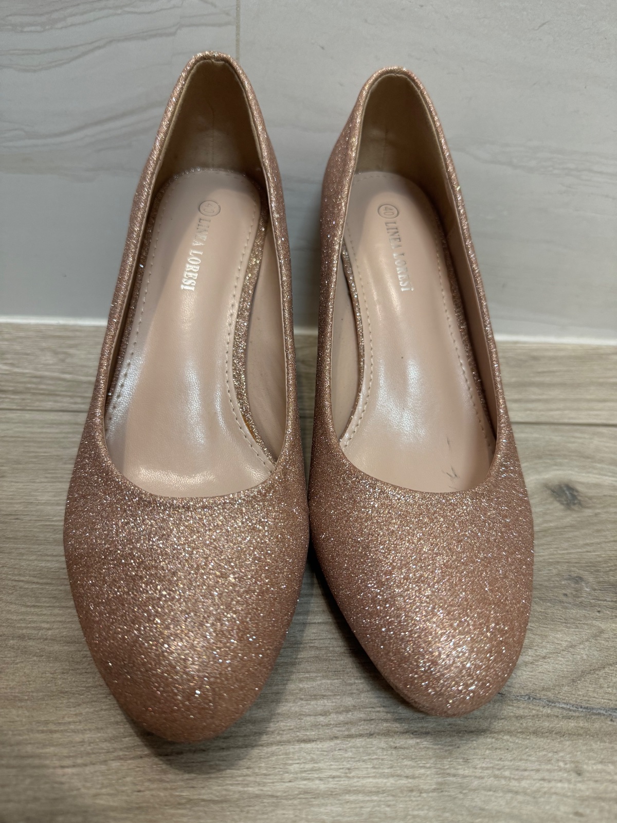Trblietkavé lodičky v jemnej bledoružovej farbe. Raz obuté, bez poškodení. Zn. Linea Loresi. Výška podpätku 9 cm, predná platforma 1 cm.