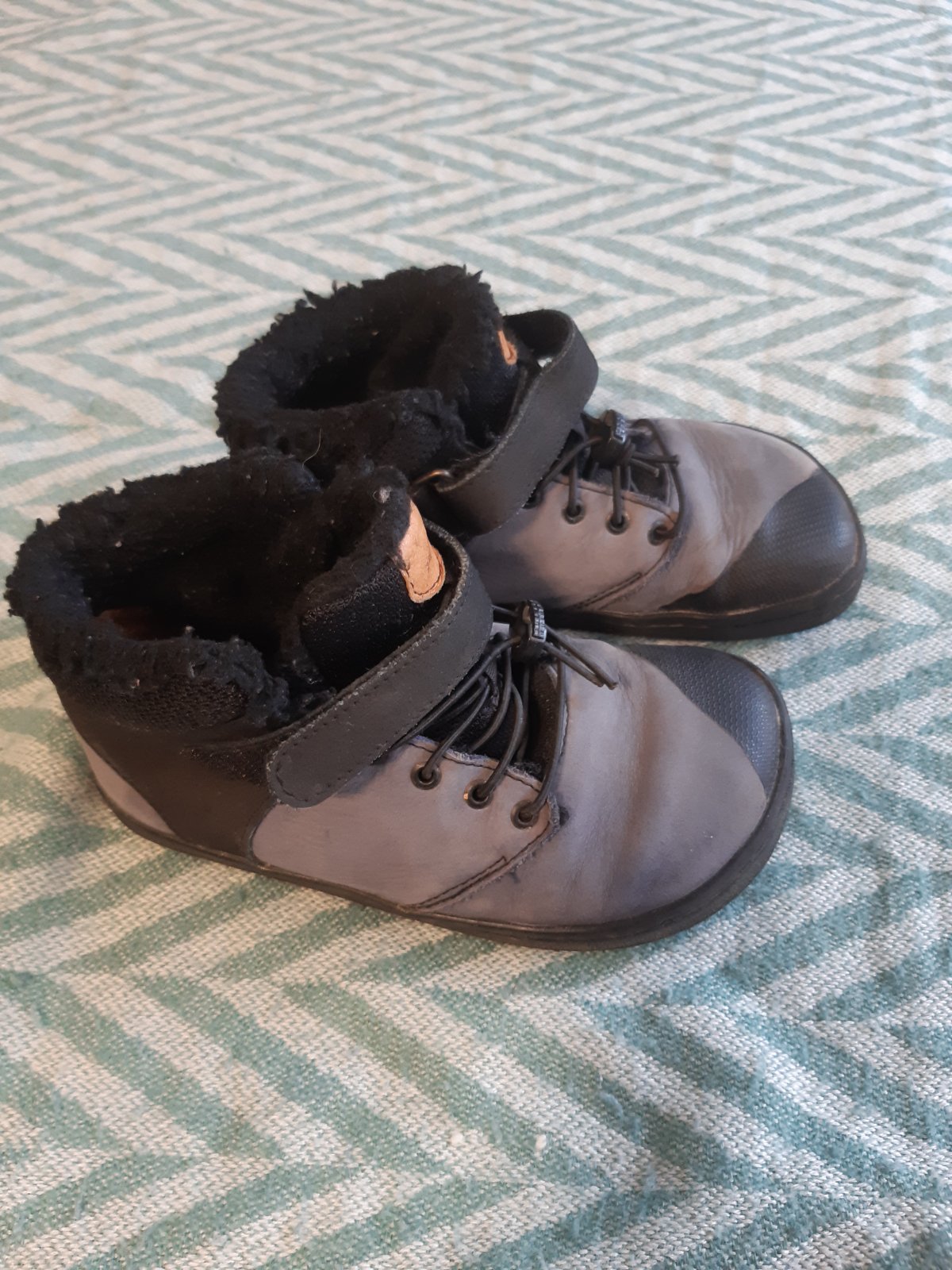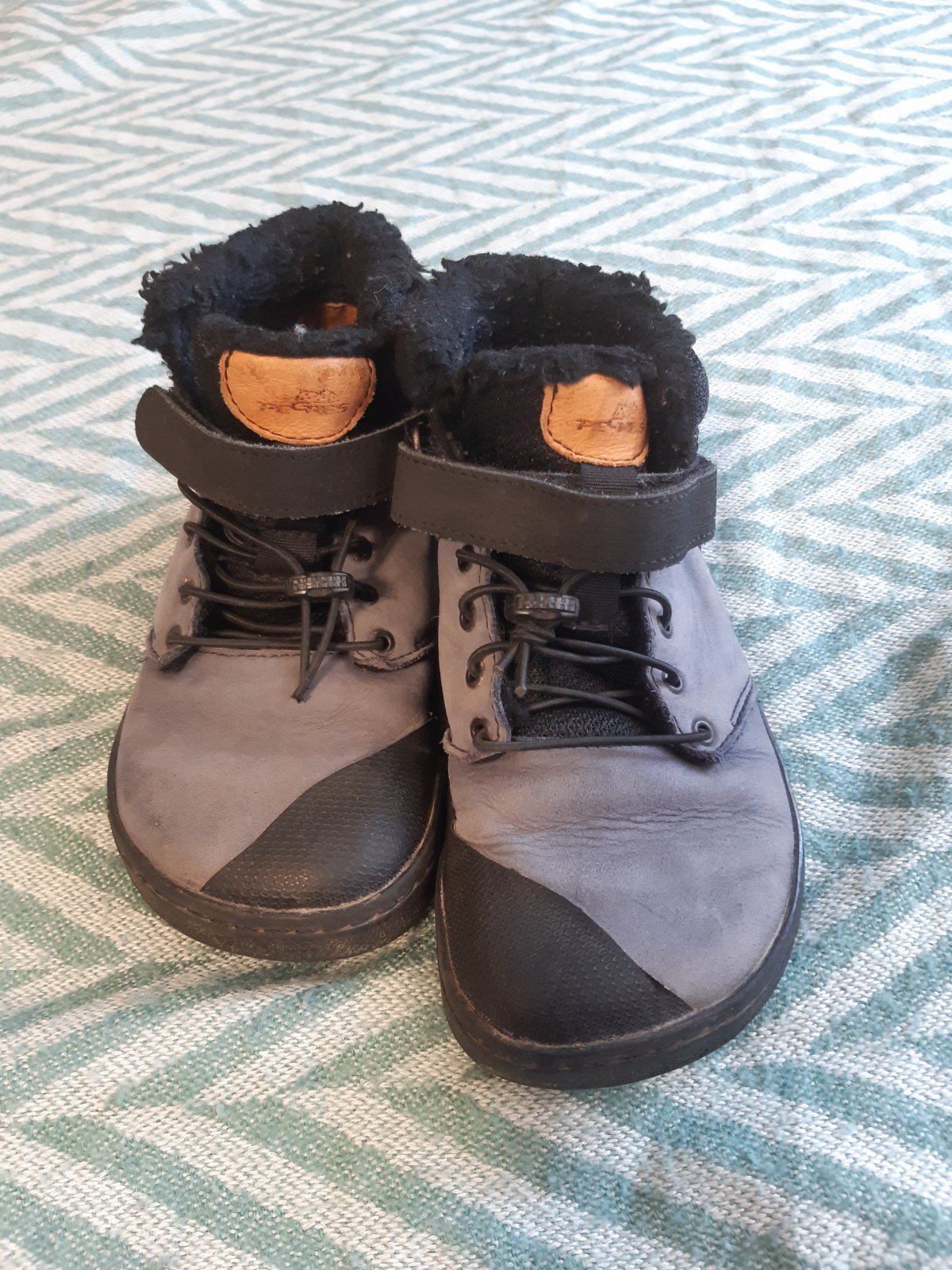Pegres BF40 barefoot zimné topánky, šedomodrá farba. Ľahké a flexibilné. Zvršok z nubukovej kože doplnenej asfalticom (na kraji trošku odchlípený na pár miestach - bez vplyvu na funkciu/len estetická vec - zohľadnené v cene), podšívka a stielka je zateplená umelou kožušinkou. Pružná rýchlošnúrka, zapínanie na suchý zips. Nadštandardné široká špička, ideálna pre dominantné palce, vhodné pre normálne až širšie nohy, možno utiahnuť aj na úzke členky.