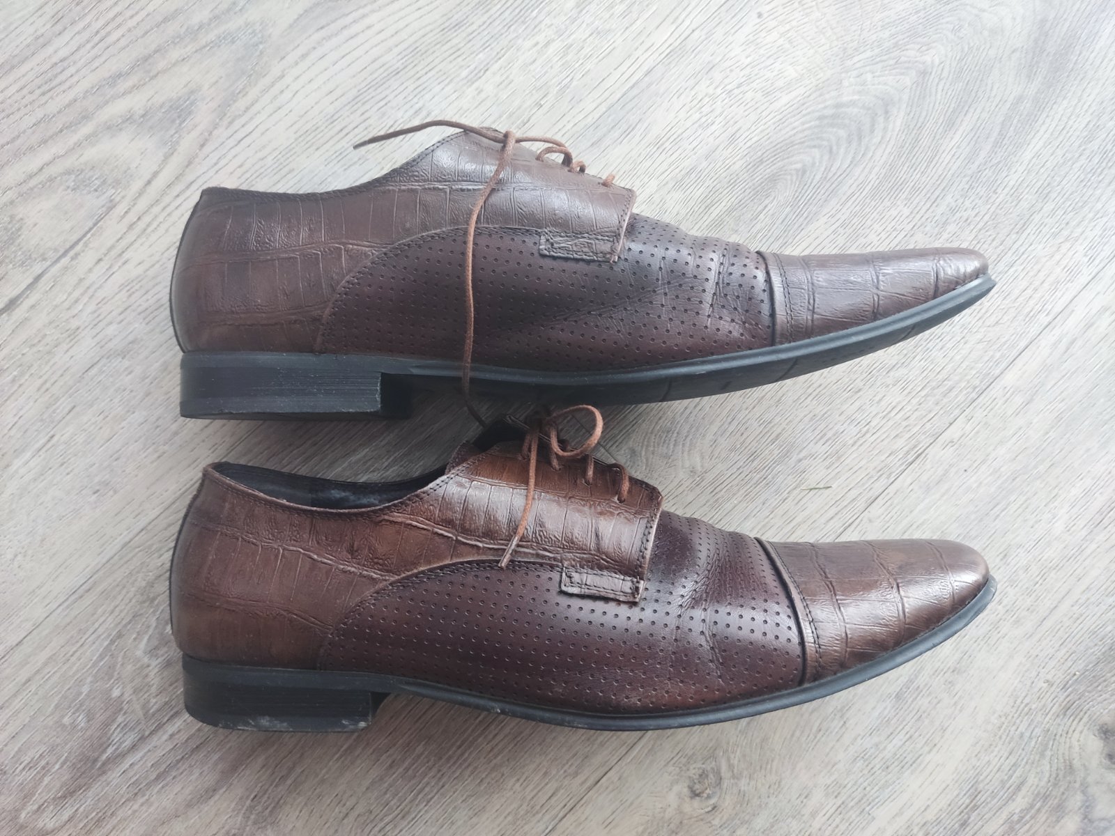 Elegantné kožené topánky.Veľkosť 46. Svetlé akoby škvrny na pravej špičke sú od výroby, je to farba kože. Nie je to poškodenie. Naživo to nepôsobí tak svetlo ako na fotke. Cena 7€.
