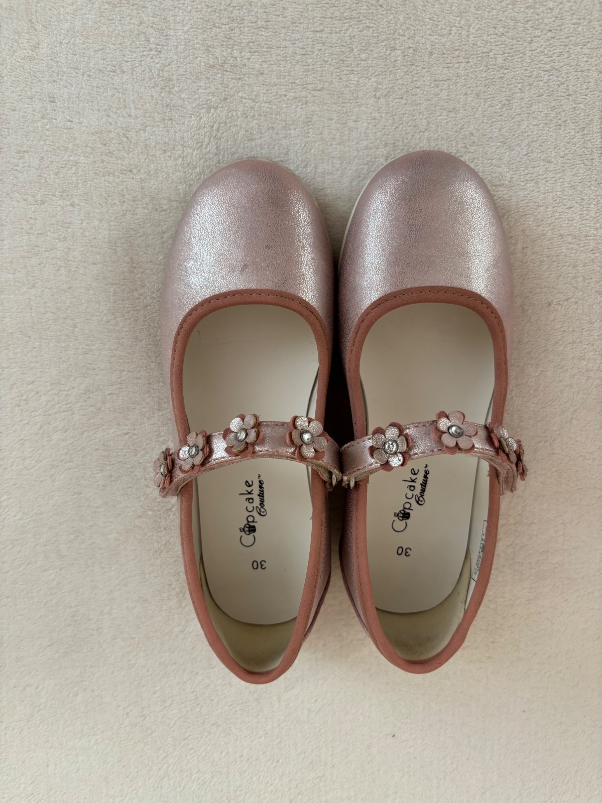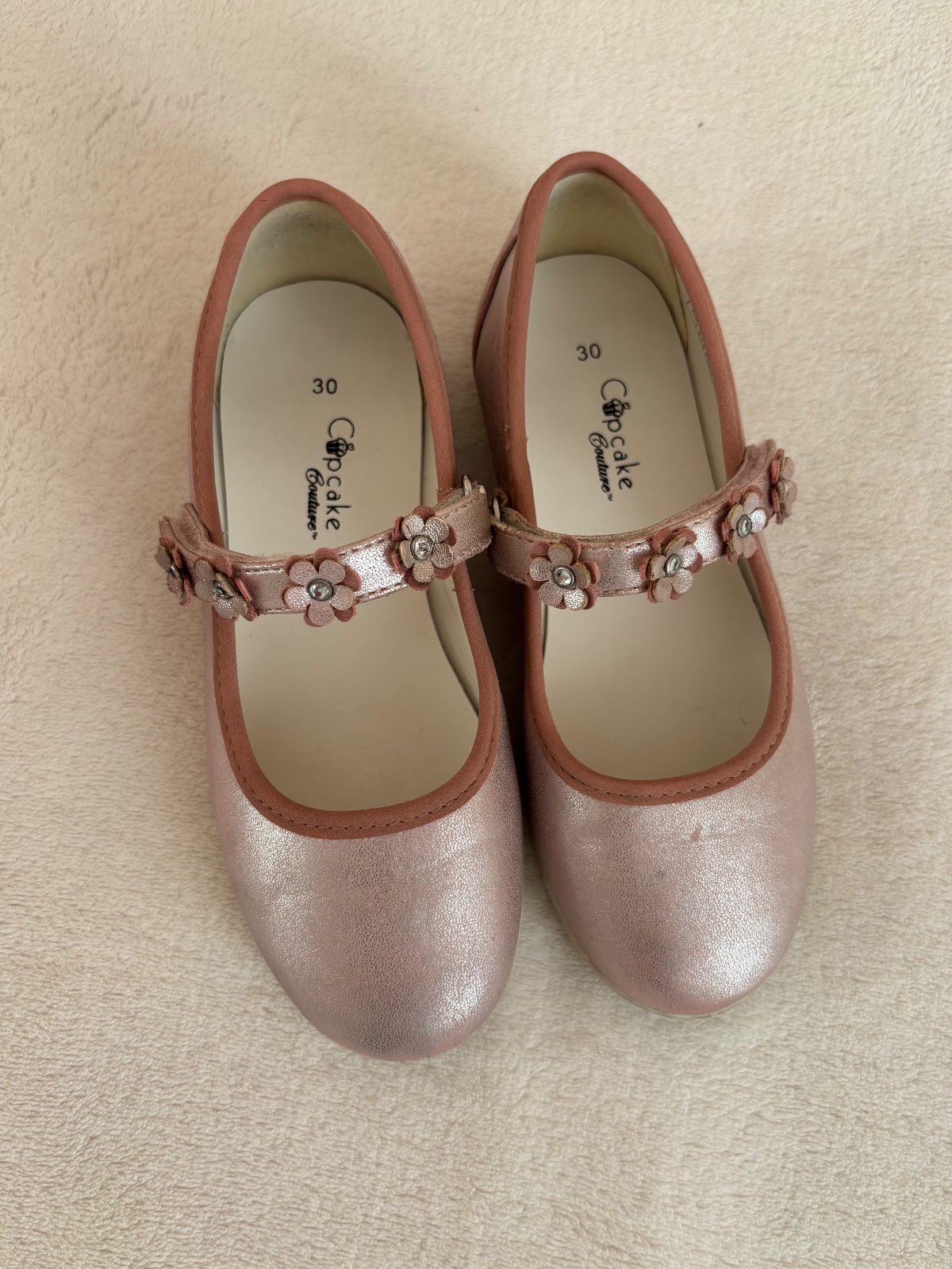 Ponúkam milé balerínky veľkosť 30, dcéra ich mala párkrát obuté: začiatok a koniec školského roka, divadlo. Sú trblietavé, ale na niektorých miestach sú trblietky mierne odraté, viď. ľavá topánočka. Parádu ale ešte narobia.
