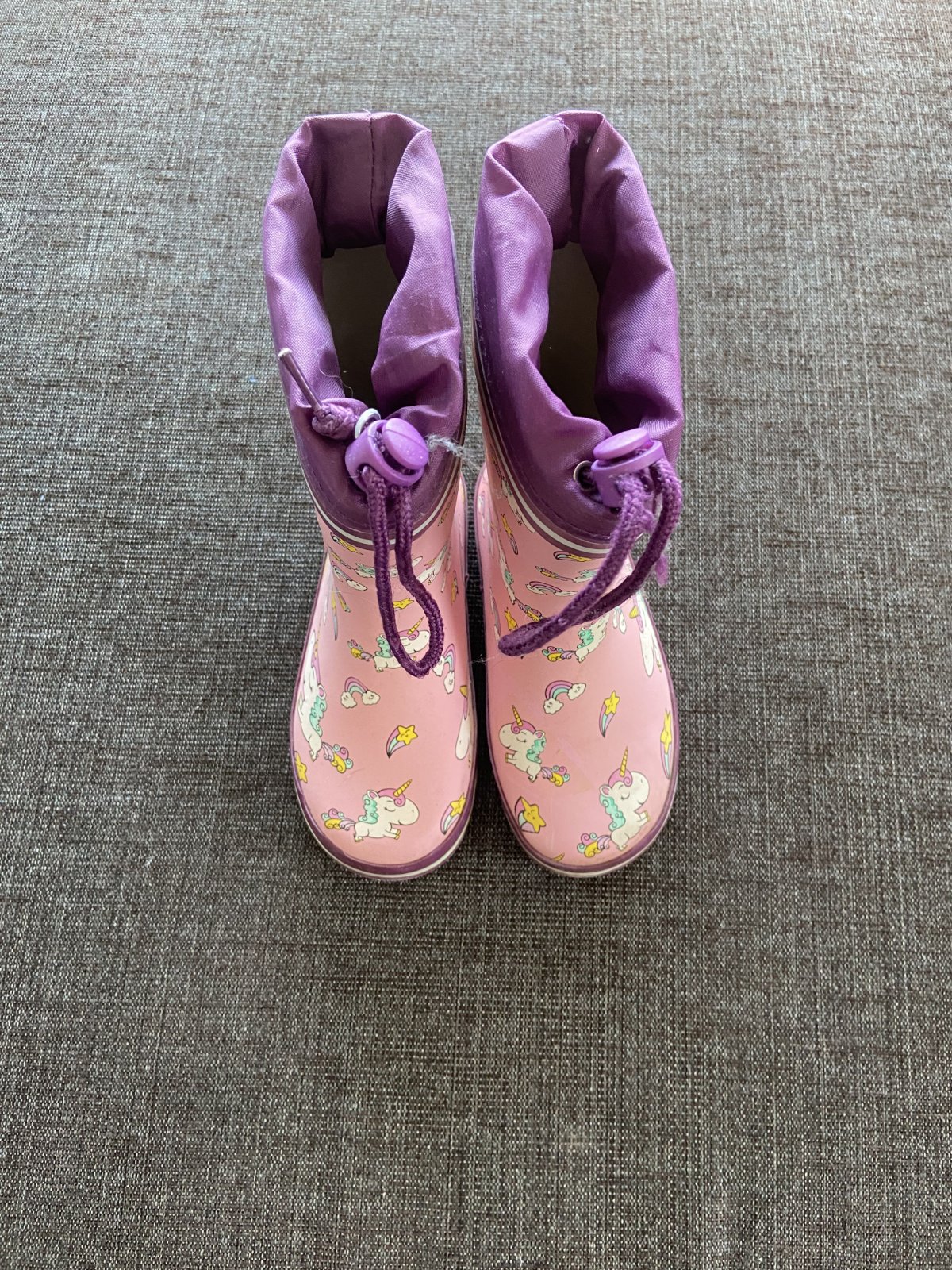 Peknučké a u nás veľmi obľúbené gumáčiky s obrázkami jednorožcov. Na vrchu takmer nie je vidieť nosenie, ale vpredu sú troška šuchnuté a spodok pri päte odhaľuje, že boli nosené veľa :) Ale stále vedia poslúžiť, aj parádu v škôlke spraviť. Dajú sa hore zatiahnuť, sú praktické a dcérka tvrdila, že aj pohodlné :) Cena bez pošty