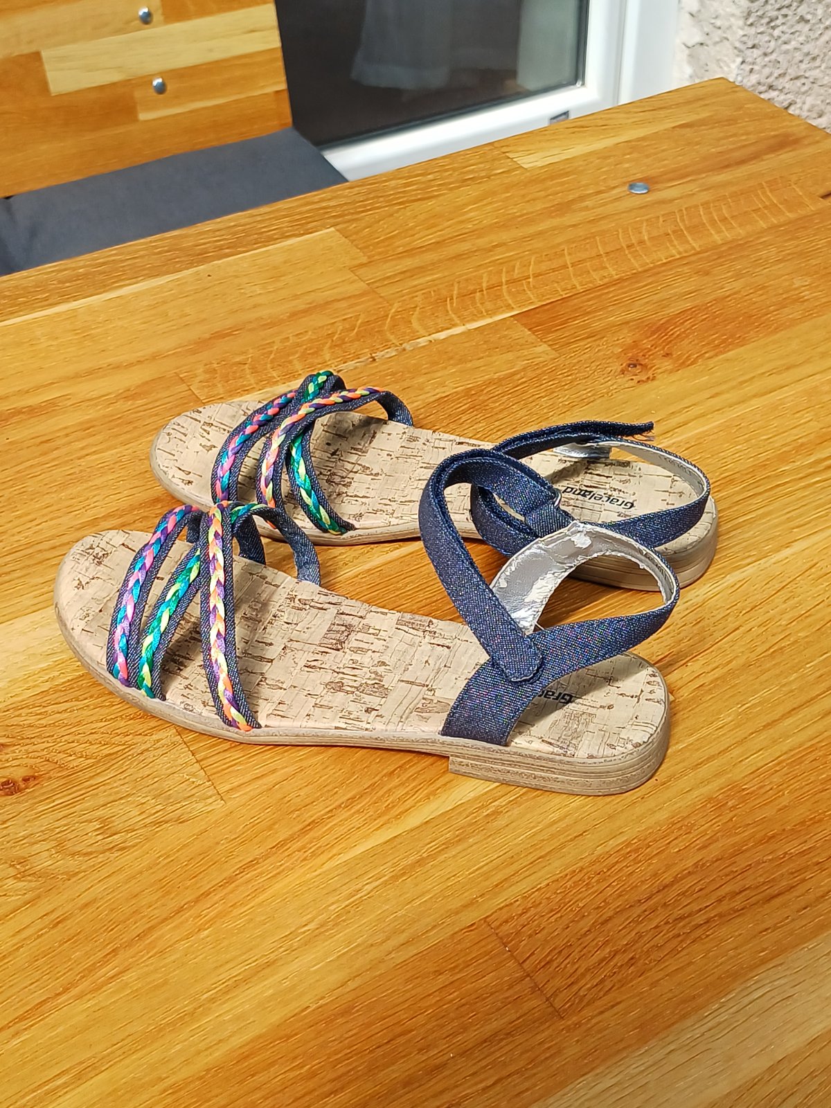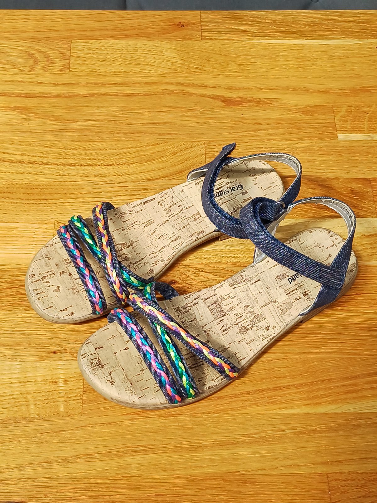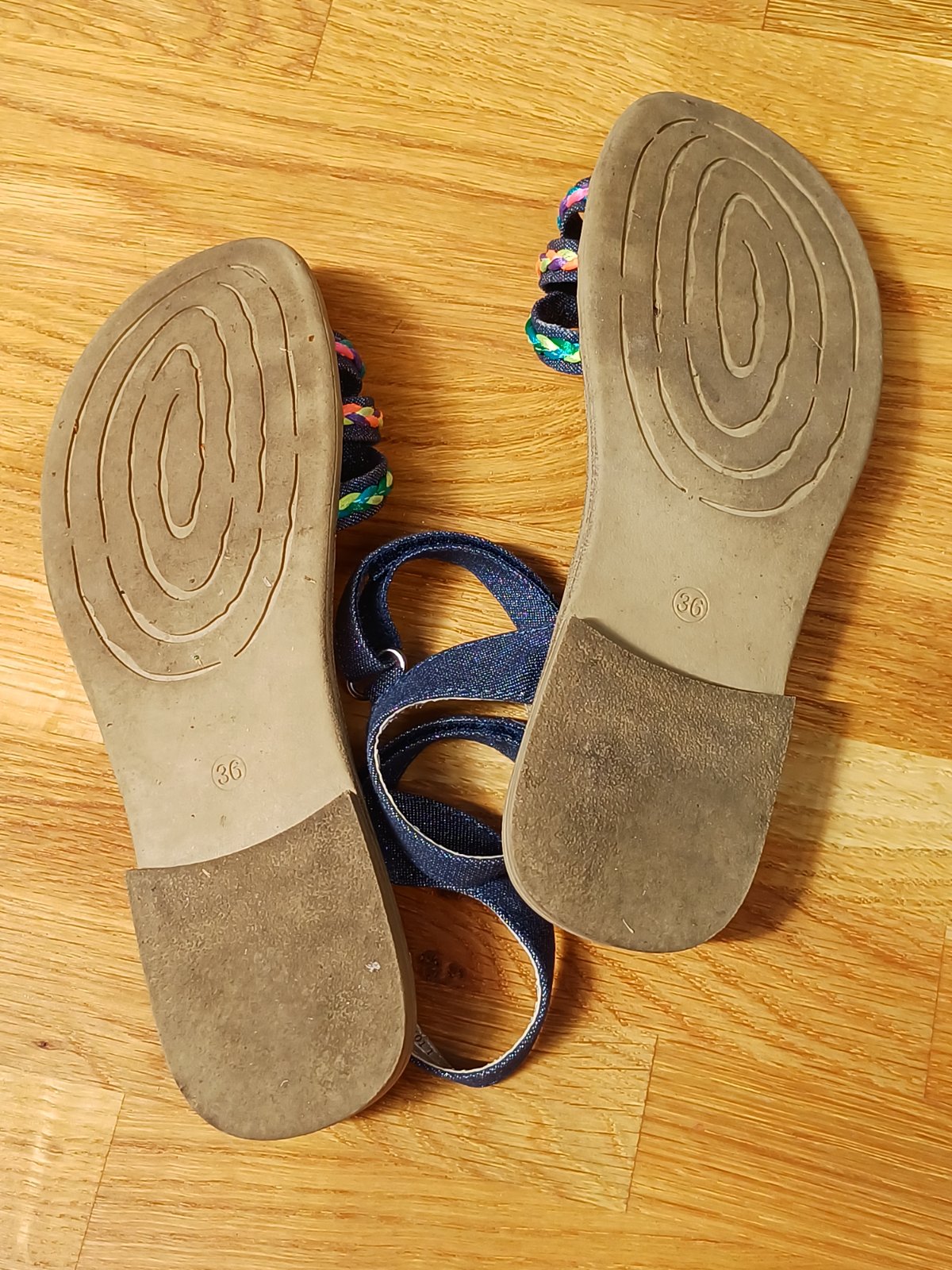 Vzhľad rifľoviny, nosené príležitostne, dobrý stav, olupovanie zvnútra na remienkoch (viď foto), zapínanie na suché zipsy - stále pevne držiace, vnútorná dĺžka 23,5 cm.