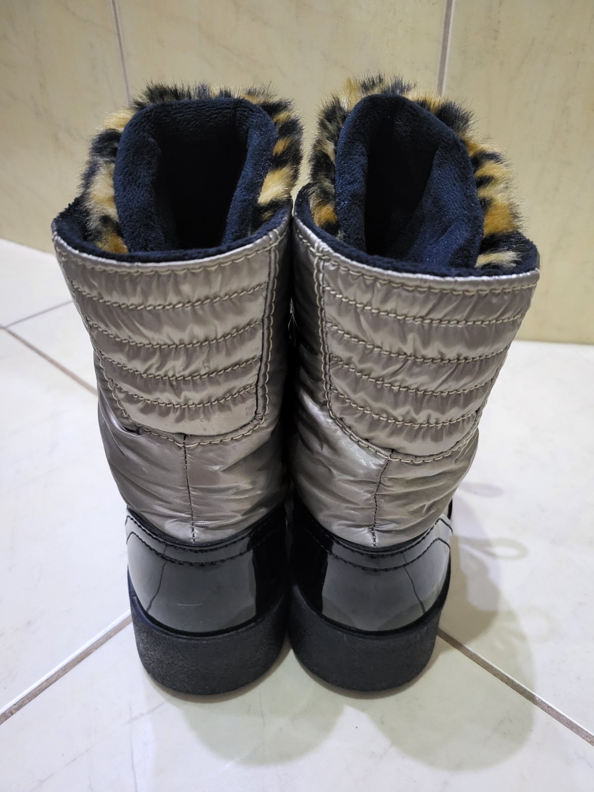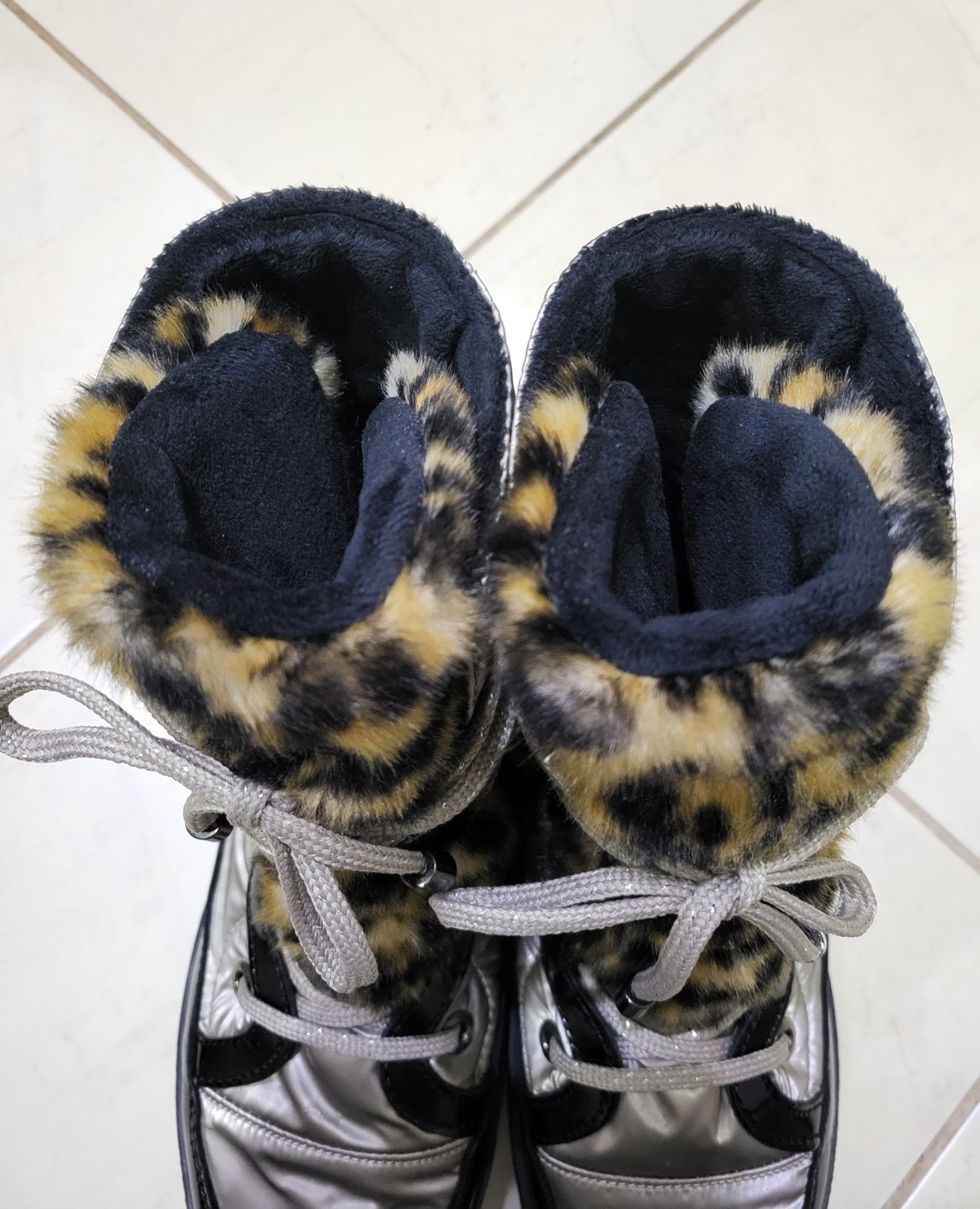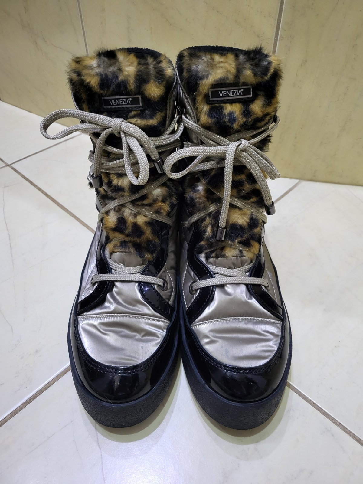 Kombinácia kožušinky a čiernej lakovanej kože.