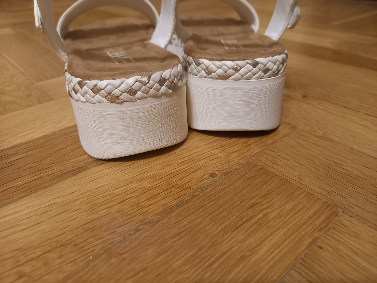 Biele sandálky s drevenou podrážkou z pravej kože. Značka Lilian Mari. Vnútorná dĺžka vnútornej bielej kože 24cm (úplne nadoraz má drevená podrážka 25cm), opätok 13cm, platforma 2cm. Obuté iba párk...