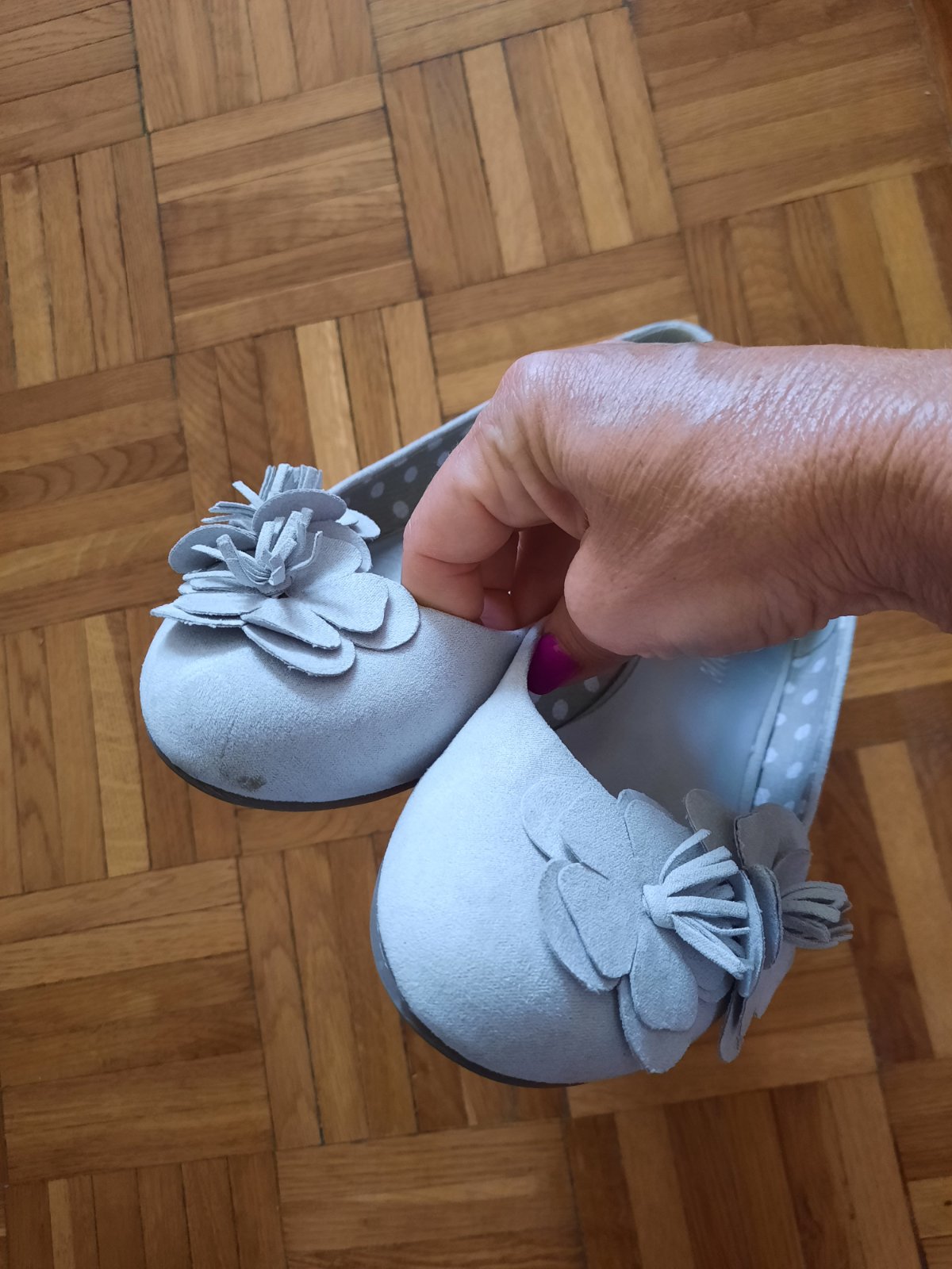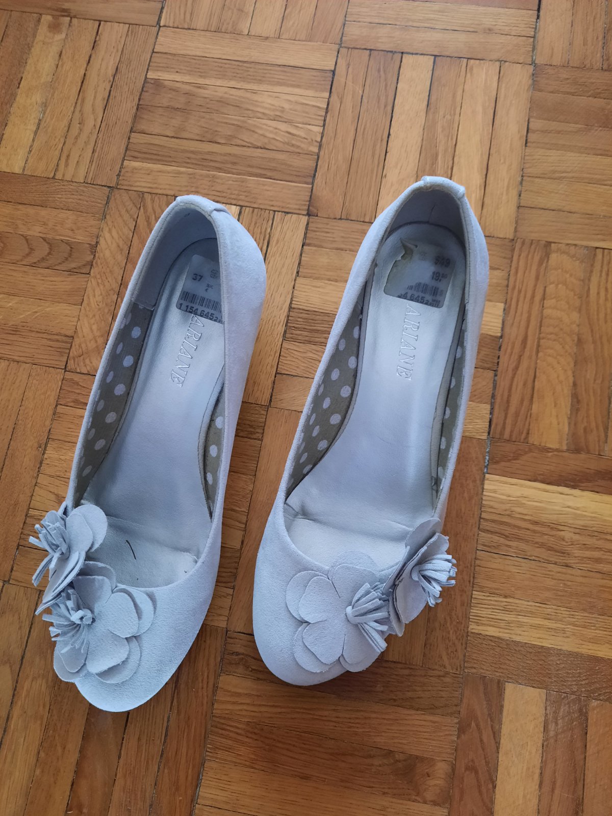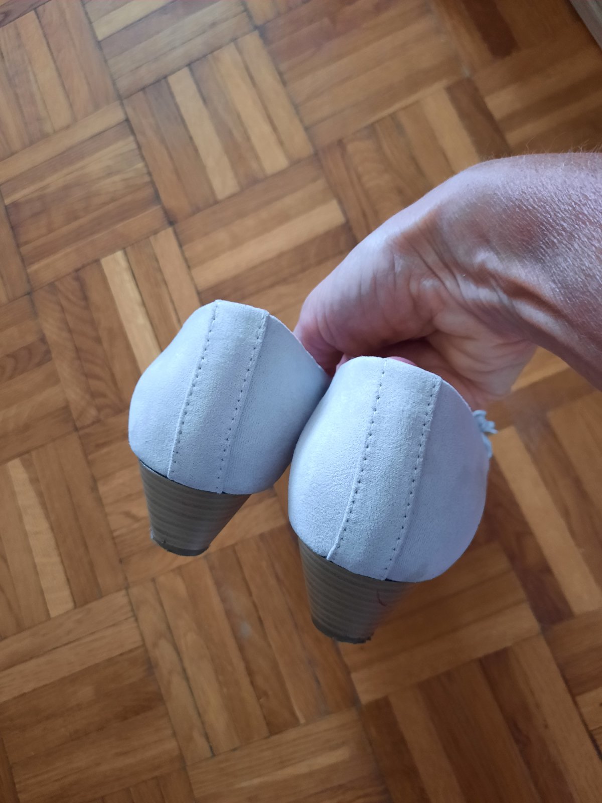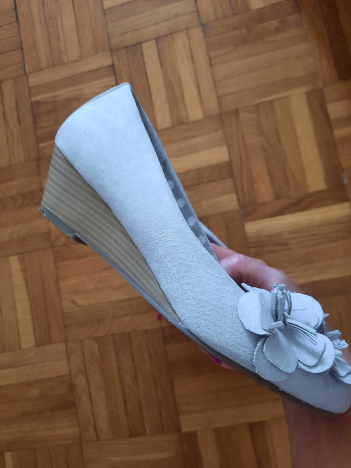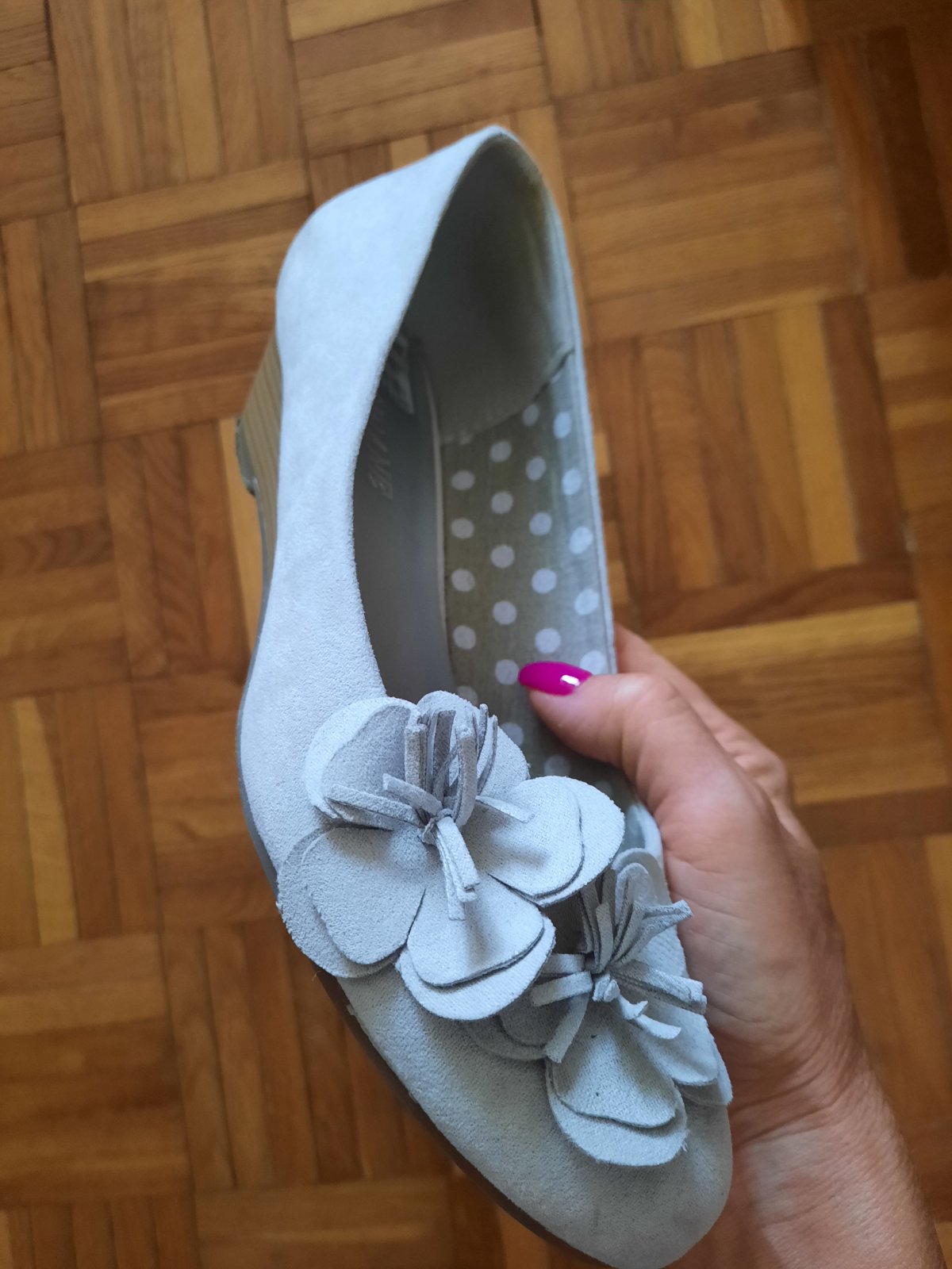 Krásne semišové poltopánky na nízkej platforme. Vpredu je ozdobná kvetina. Boli minimálne nosené, sú v top stave. Farba je úplne bledunko sivá. Mám aj originál krabicu.