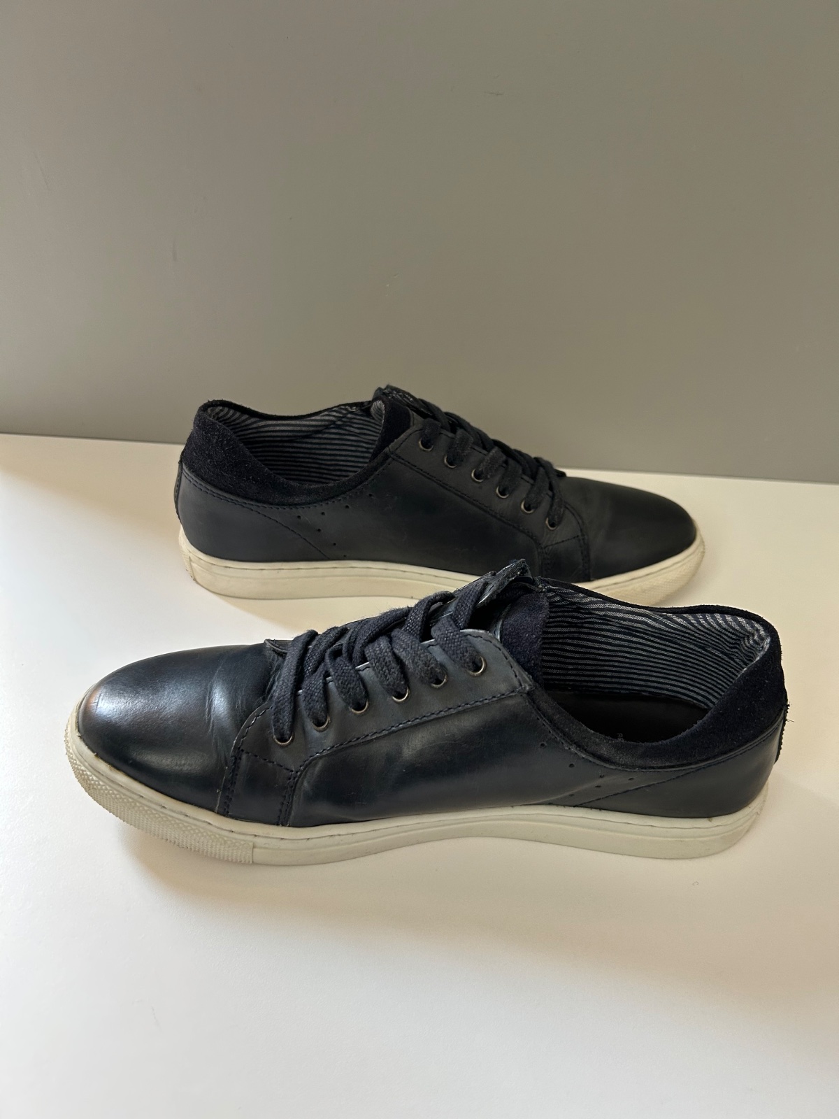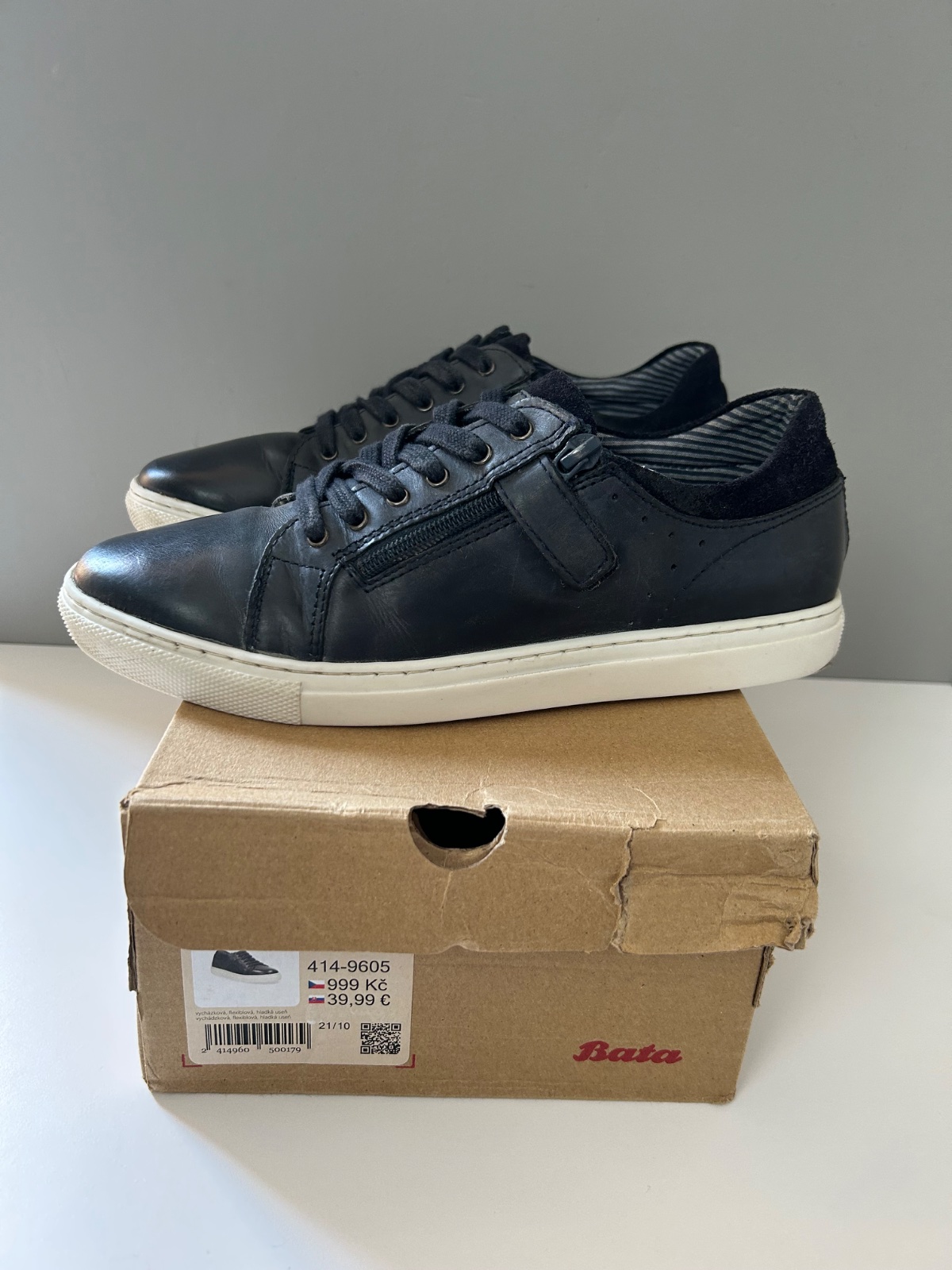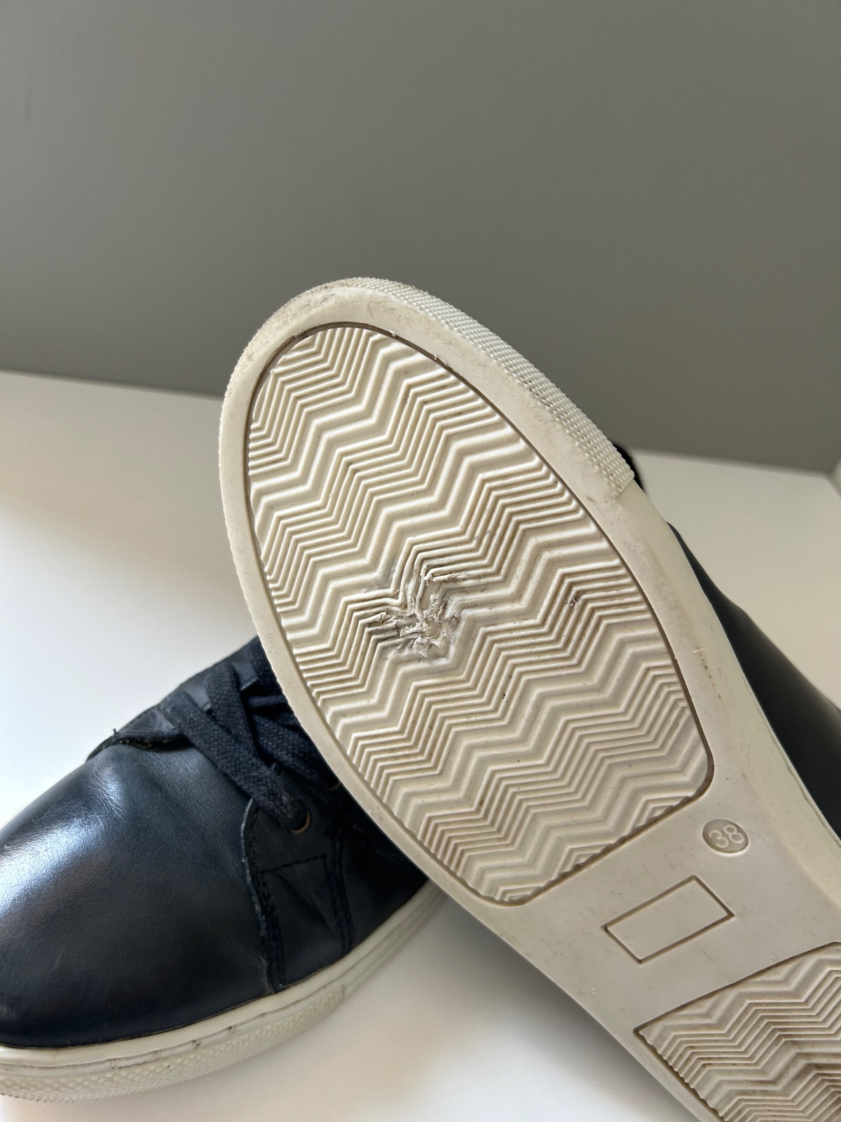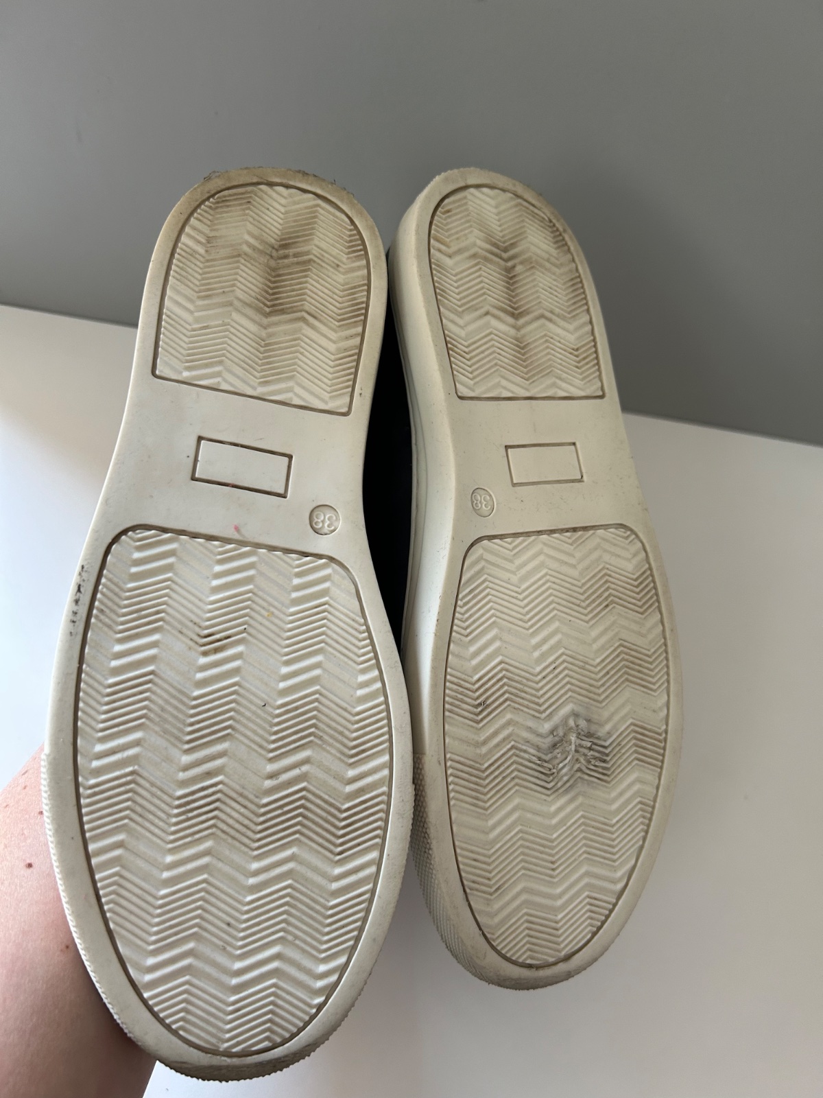 Sú v dobrom stave, jediná chyba je na ľavej podrážke v strednej časti majú stopu po žuvačke. Snažila som sa ju vyčistiť, ale ostalo tam menšie poškodenie vzoru (viď poslednú fotku). Pri nosení nie je vidieť.