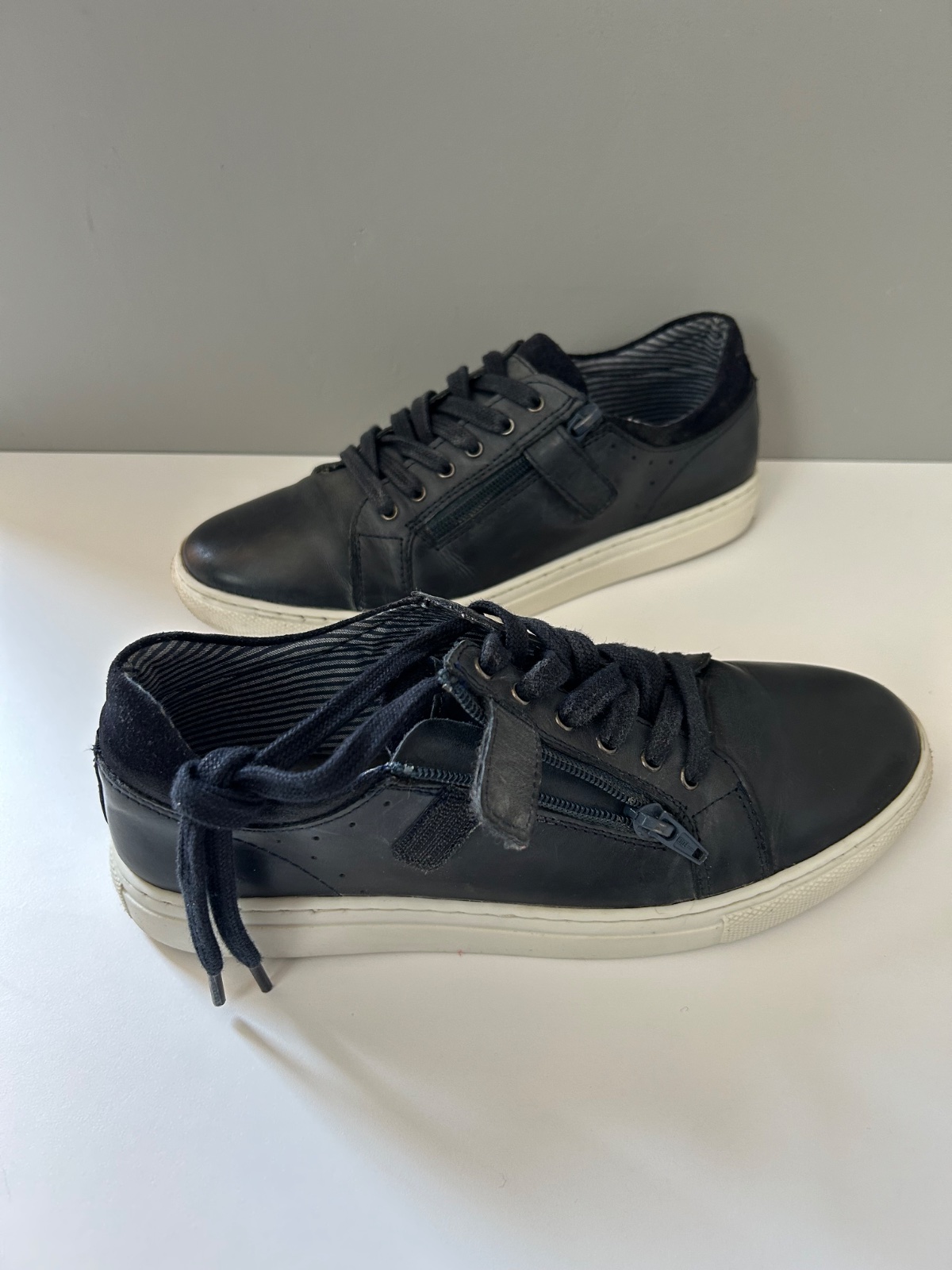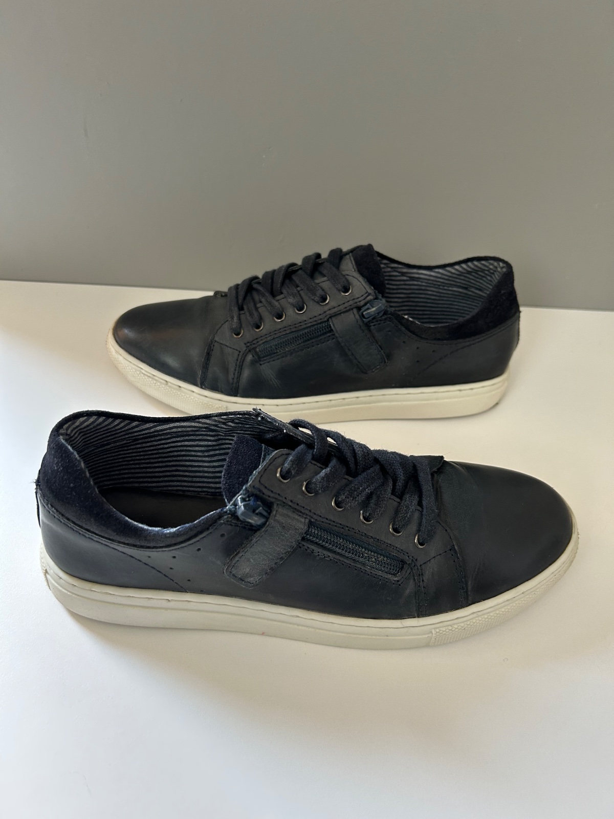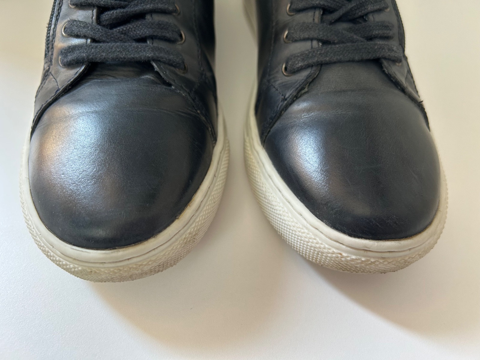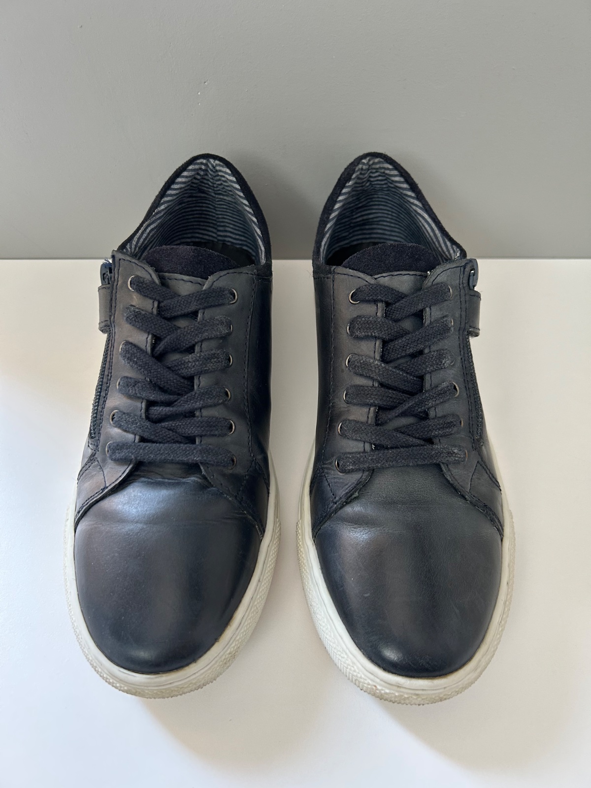 Sú v dobrom stave, jediná chyba je na ľavej podrážke v strednej časti majú stopu po žuvačke. Snažila som sa ju vyčistiť, ale ostalo tam menšie poškodenie vzoru (viď poslednú fotku). Pri nosení nie je vidieť.