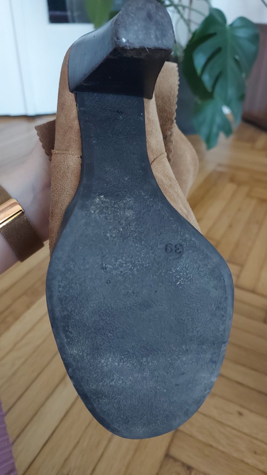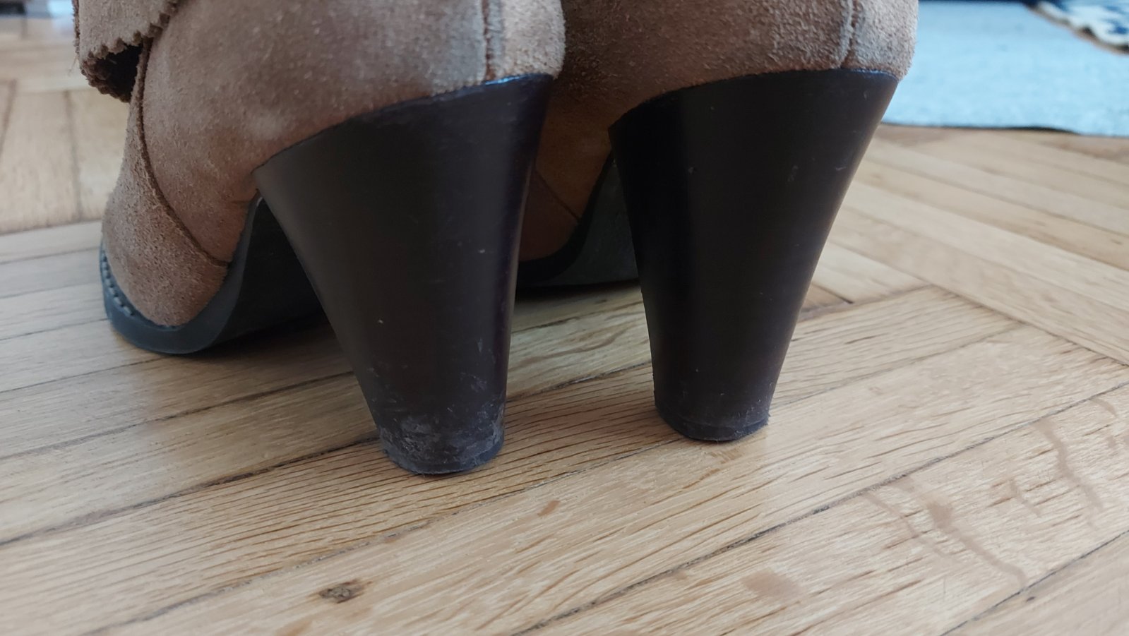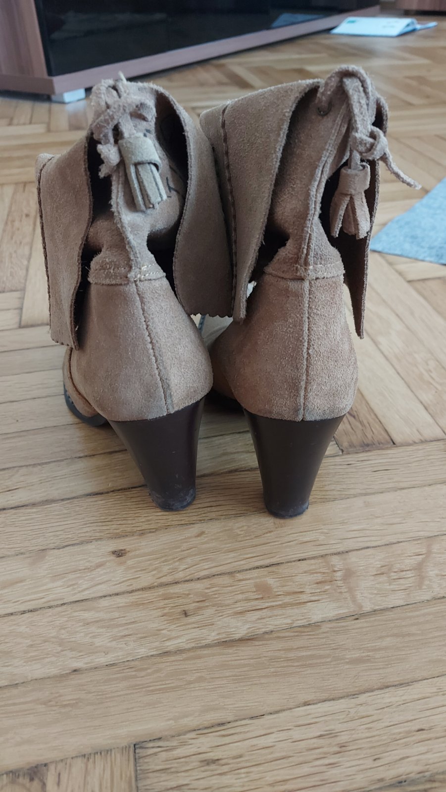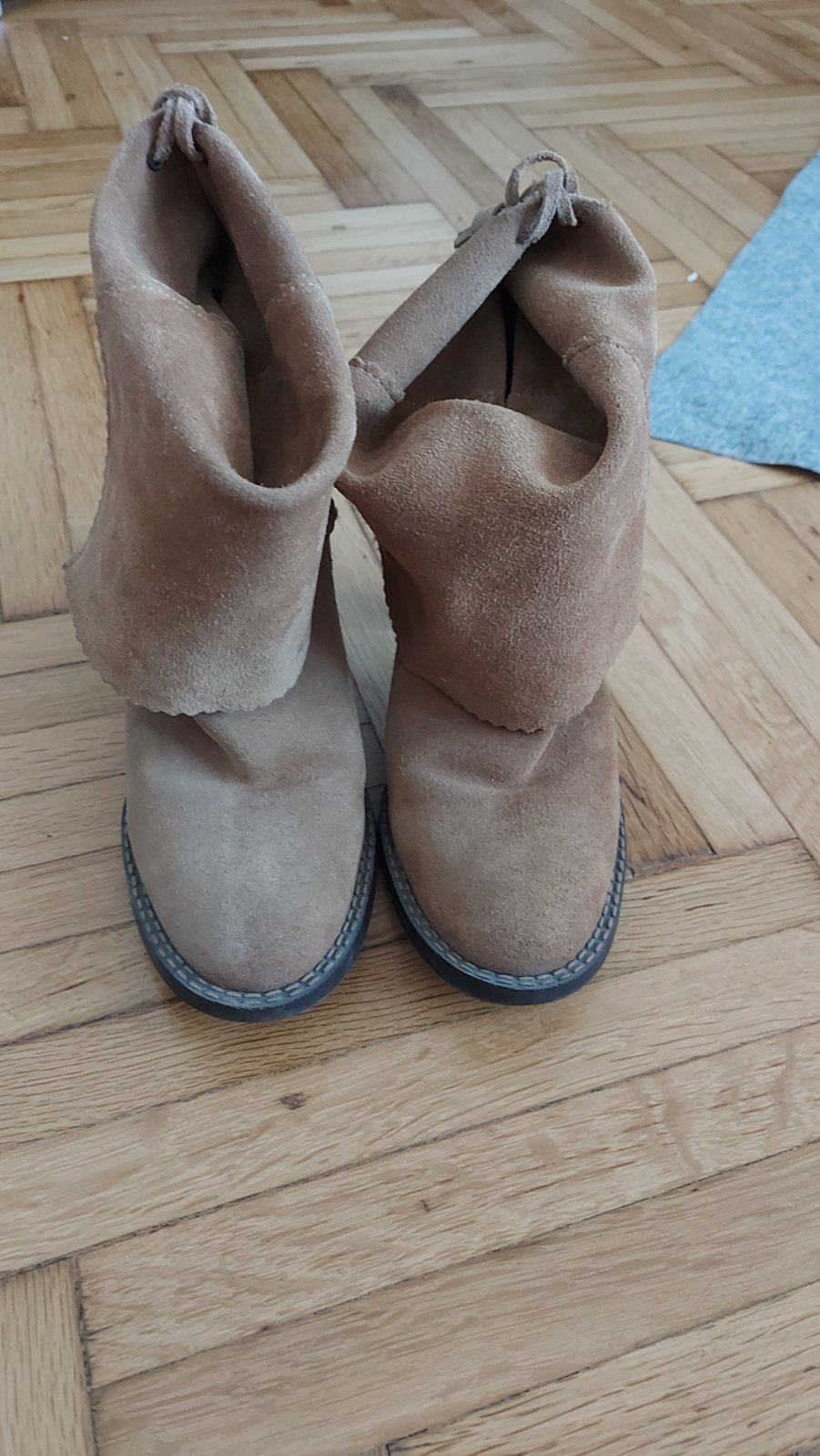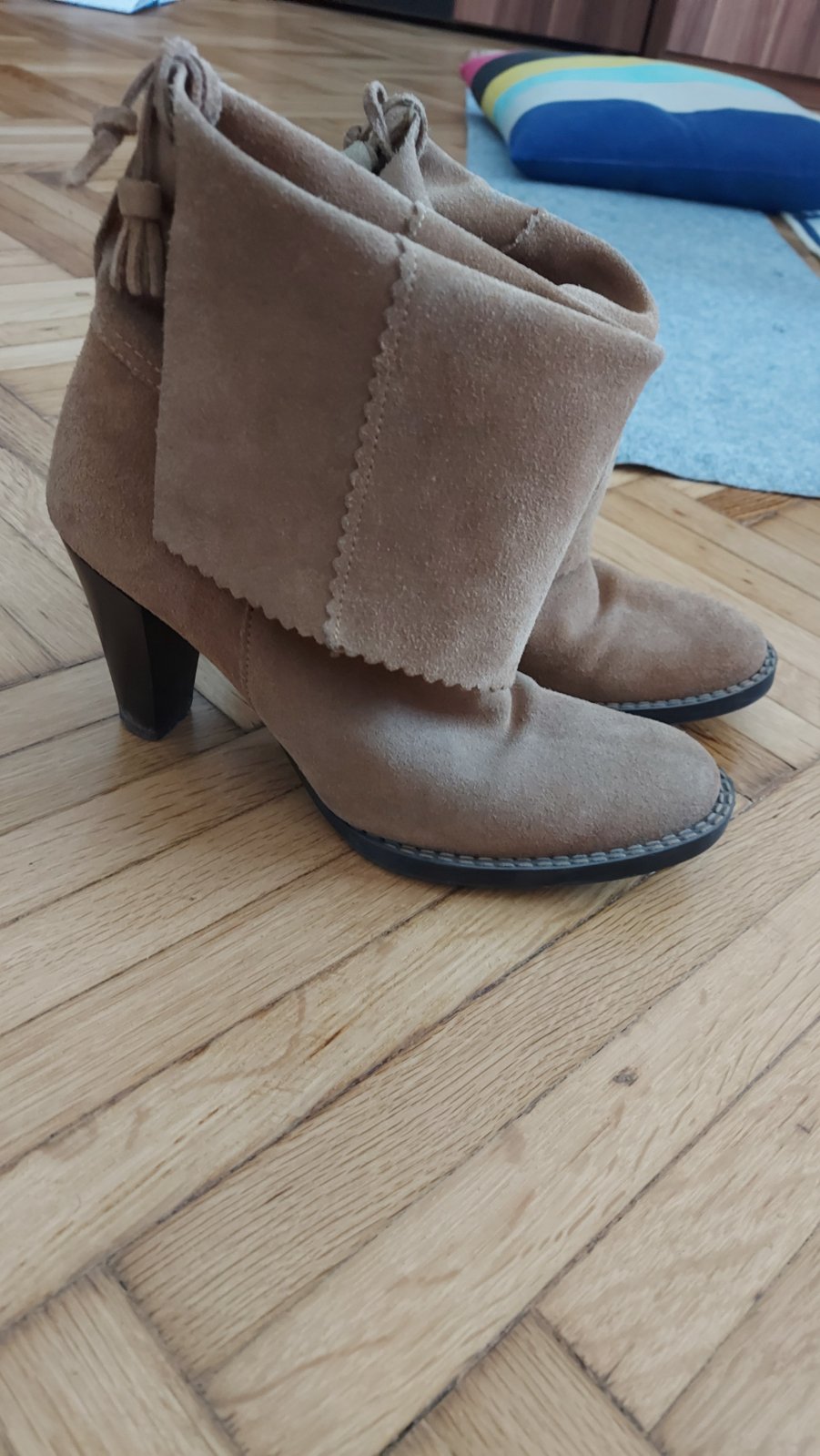 Talianske čižmy z mäkkej brúsenej kože. Cena prispôsobená stavu. Je nutné vymeniť vložky a chýba jedna ozdoba vzadu.