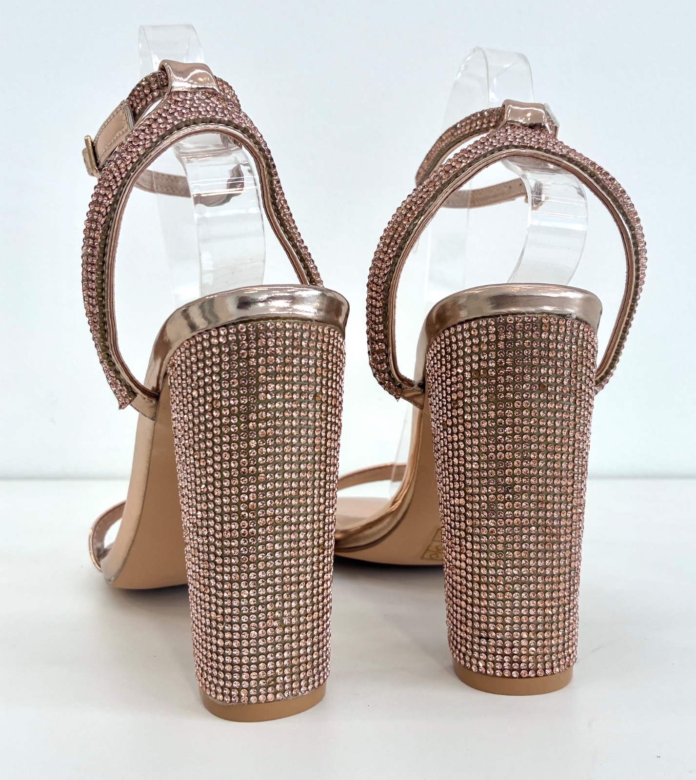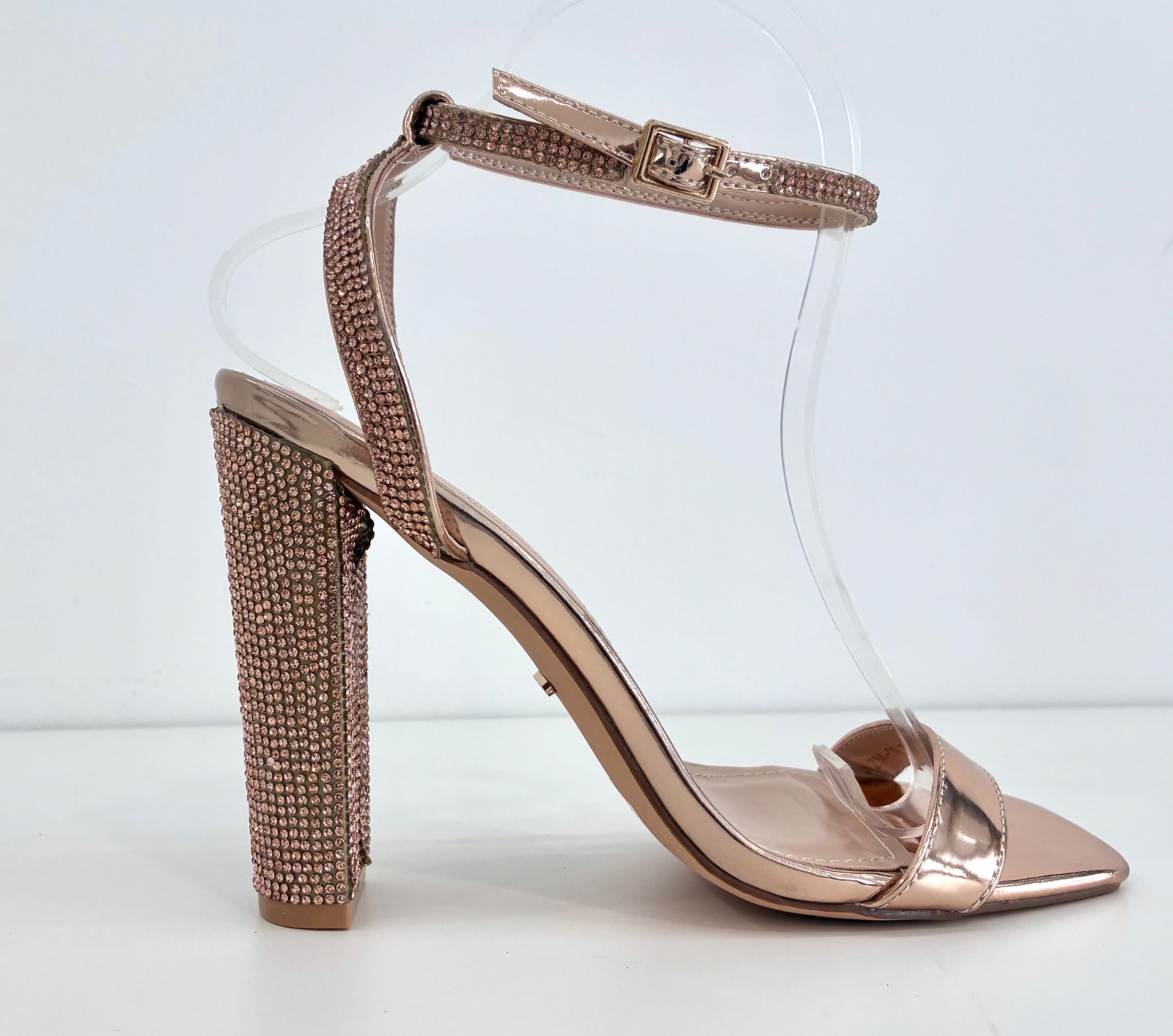 Sandále značky Deezee na podpätkoch s kamienkami v ružovozlatej farbe.