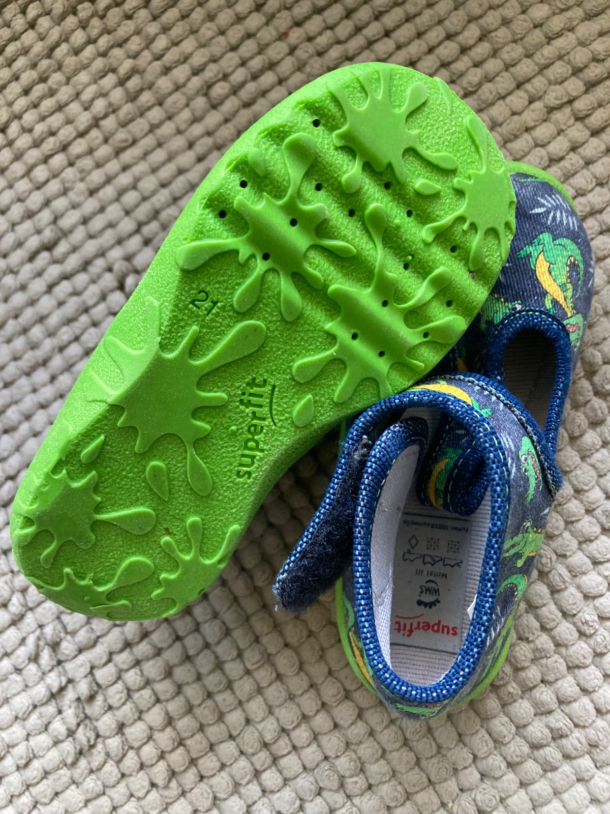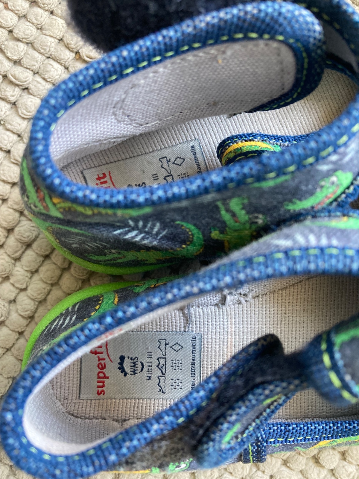 Ponukam nosene, ale v peknom zachovalom stave papučky Superfit, podrážka je výraznej zelenej farby, nefarbiaca. Zapínanie na suchý zips. Veľkosť 21, nepremeriavam. Na nosenie v interiéri ako aj v exteriéri. Ideálne do skolky/jasli. U nás boli malo nosene.