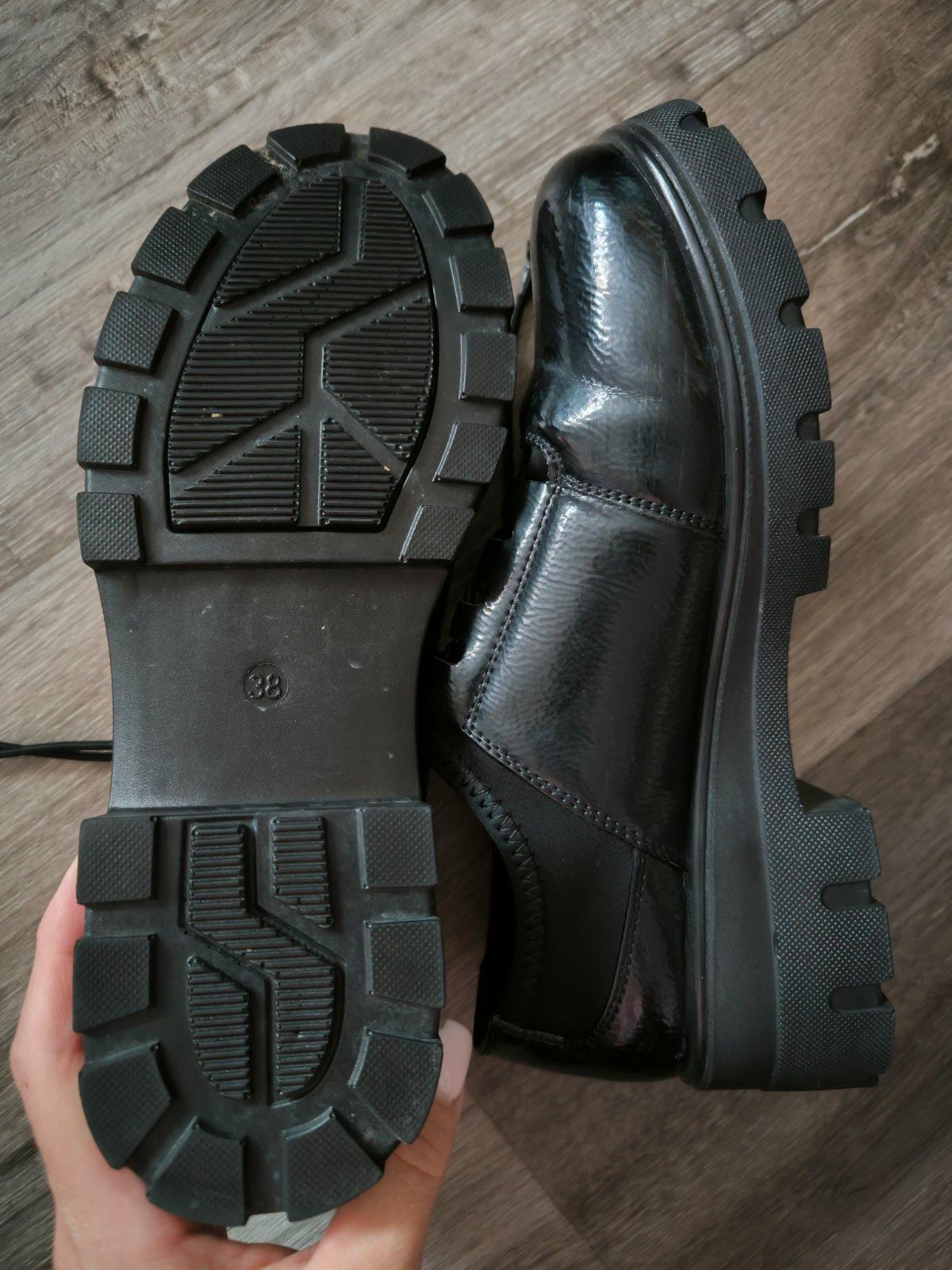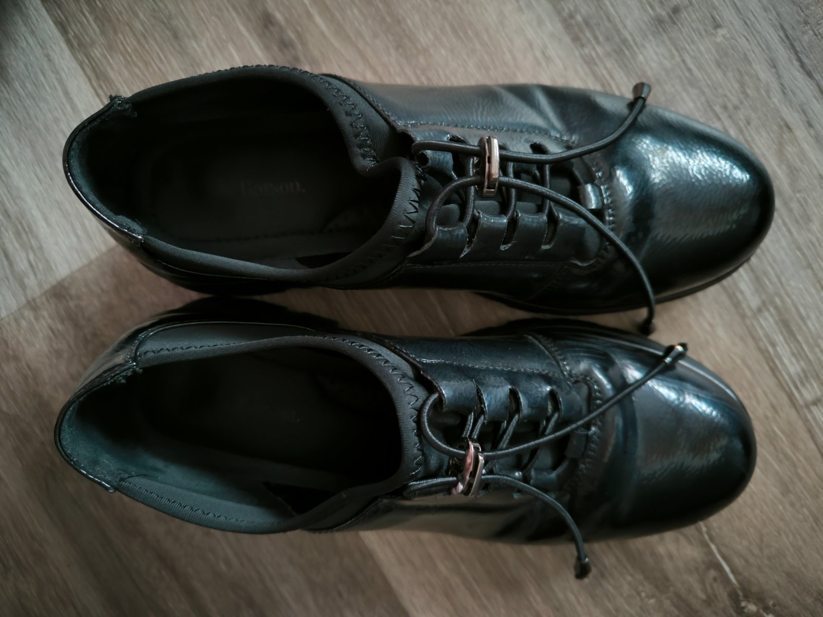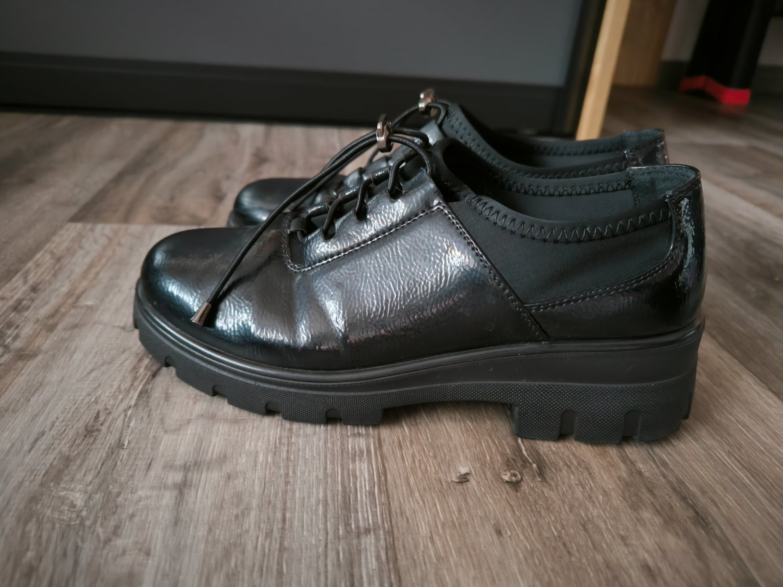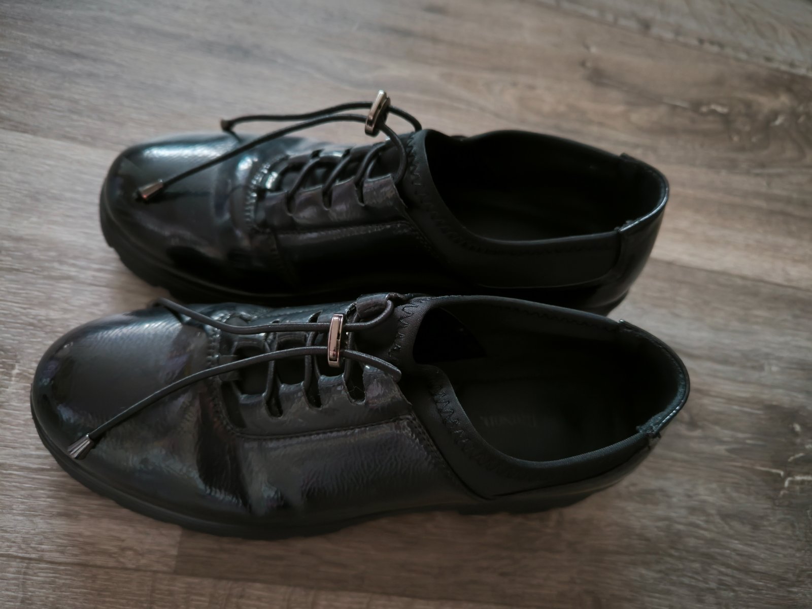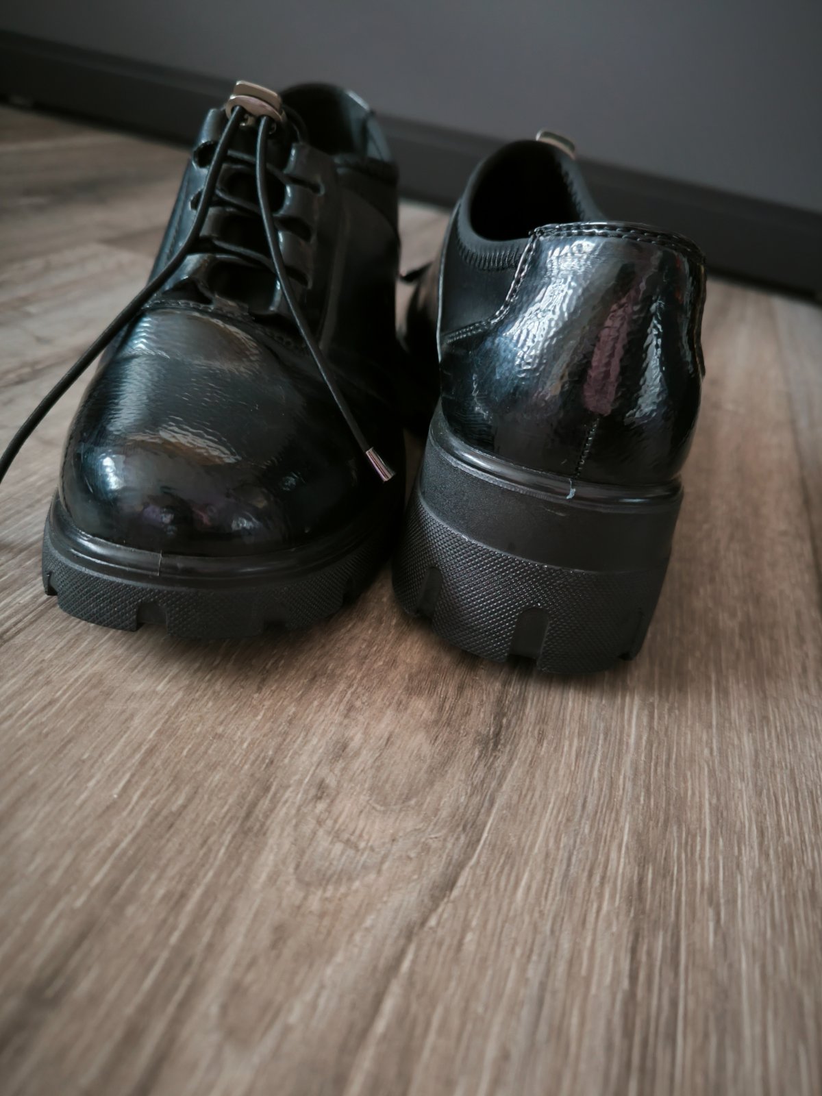 Kvalitné lesklé poltopánky, okolo členka pružia, uťahujú sa šnúrkami, vnútri mäkká vložka- veľmi pohodlné.