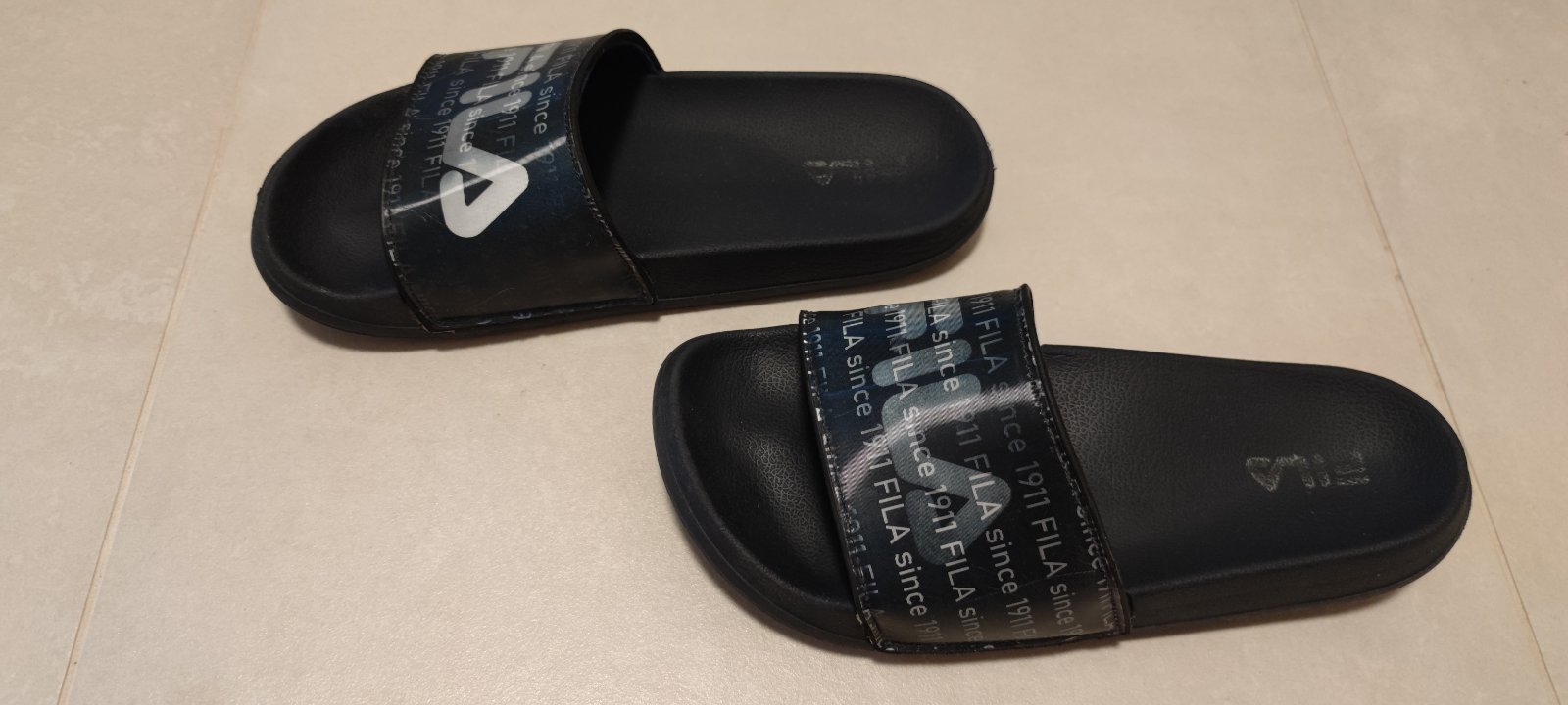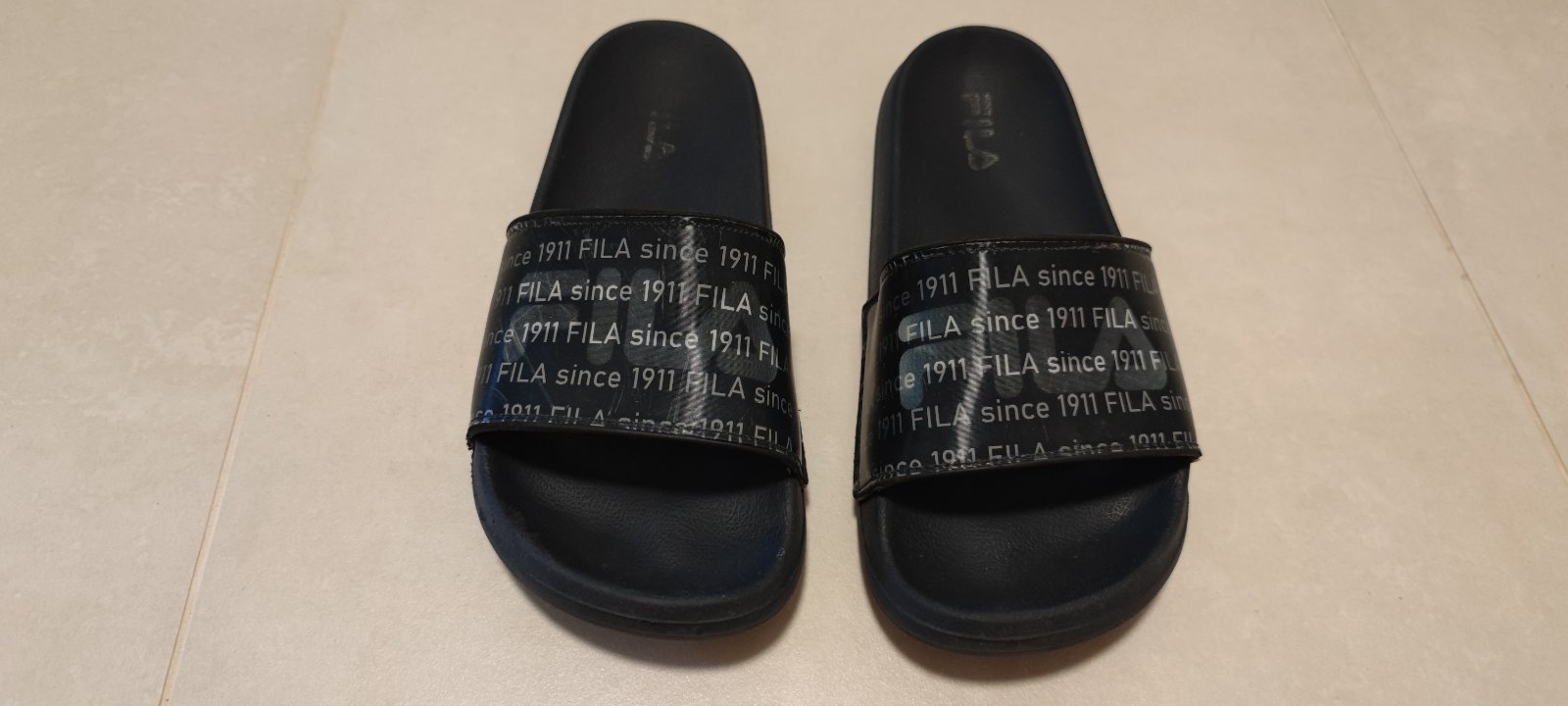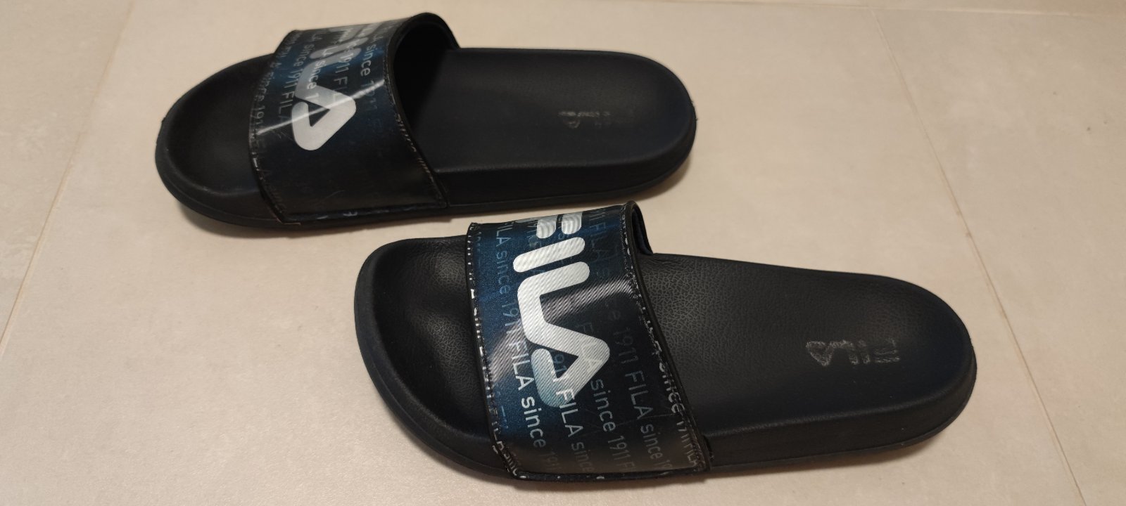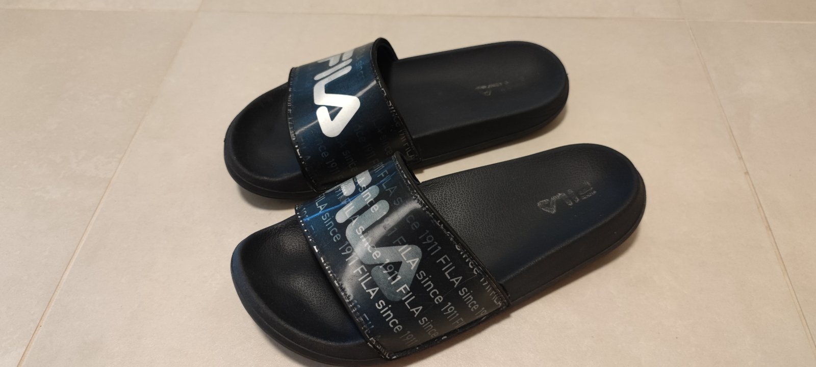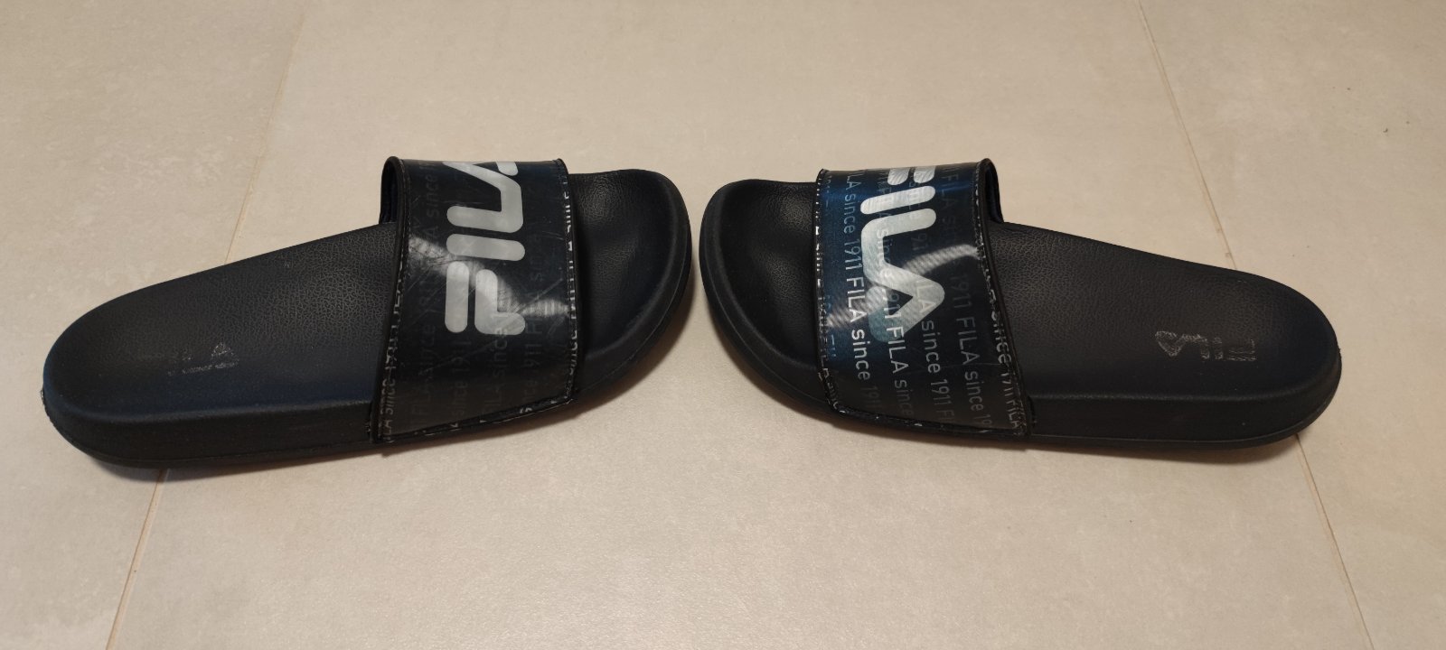 Názov FILA sa mení, podľa uhla, z ktorého sa na šľapky pozeráte. Máme na predaj dva páre. Cena za jeden pár 10€.