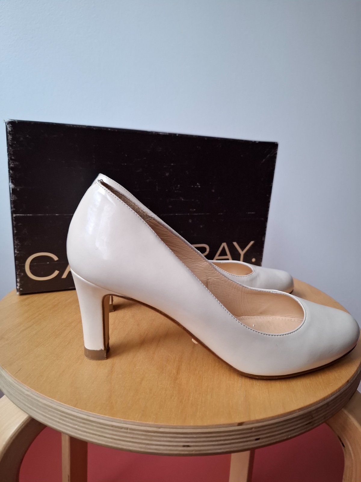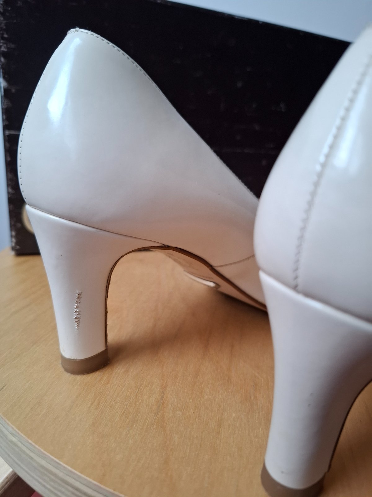 Predám biele lesklé lodičky na podpätku s otvorenou špičkou, veľkosť 36. Použité len raz... Vysoký úzky opätok - 7,5 cm. Tvarovaná vnútorná kožená stielka - 23,5 cm. Vonkajší materiál: ekologick...
