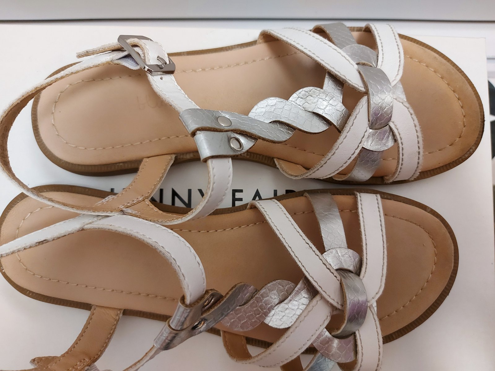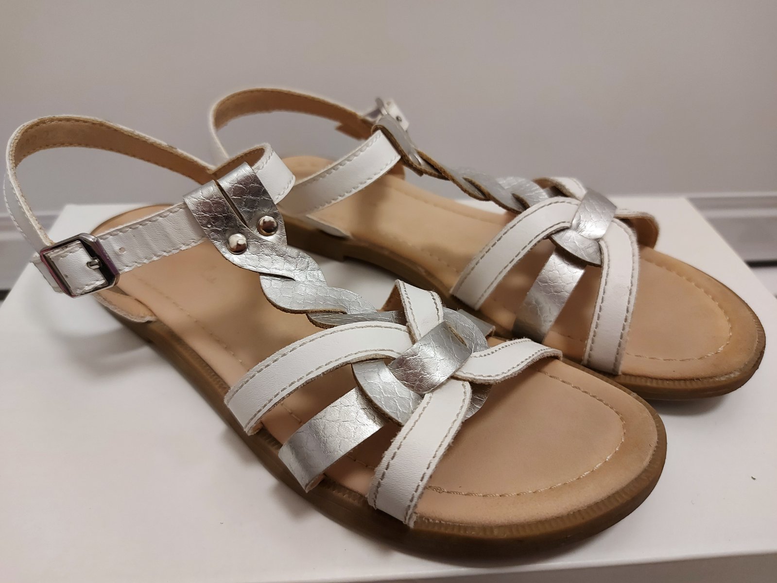 Bielo-strieborné sandálky, málo nosené, vo veľmi dobrom stave, bez výrazného poškodenia.