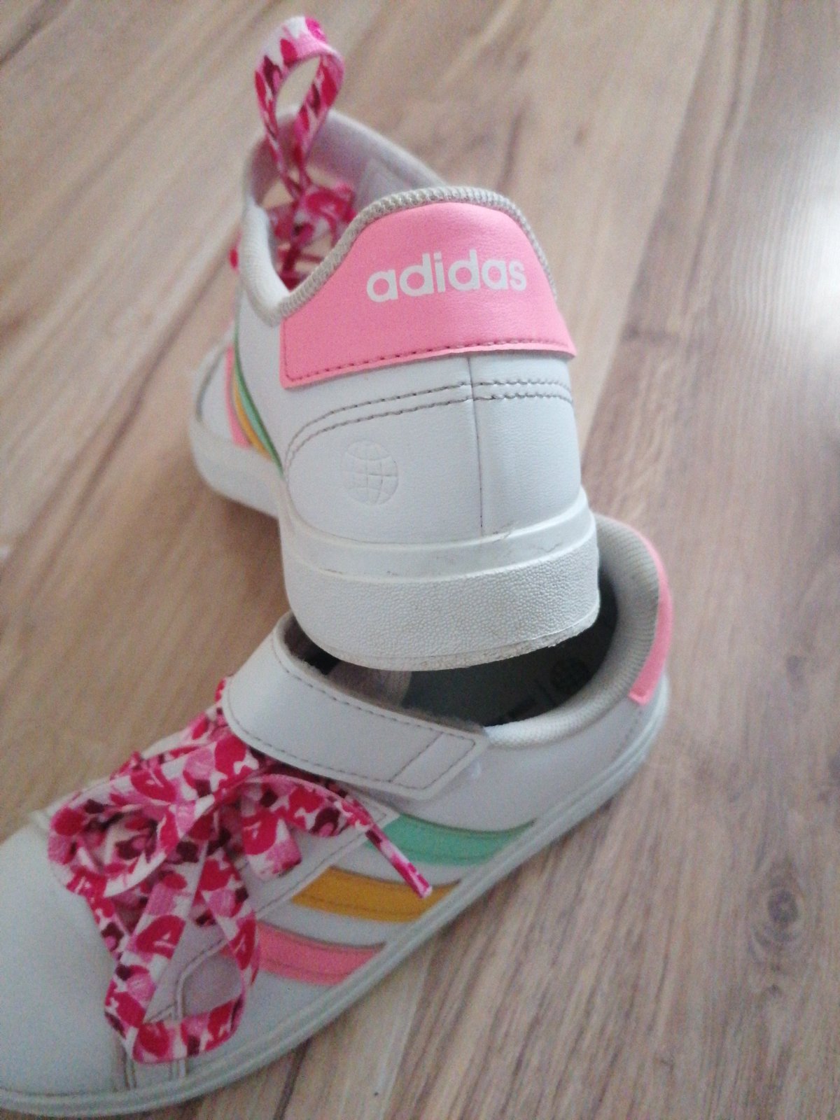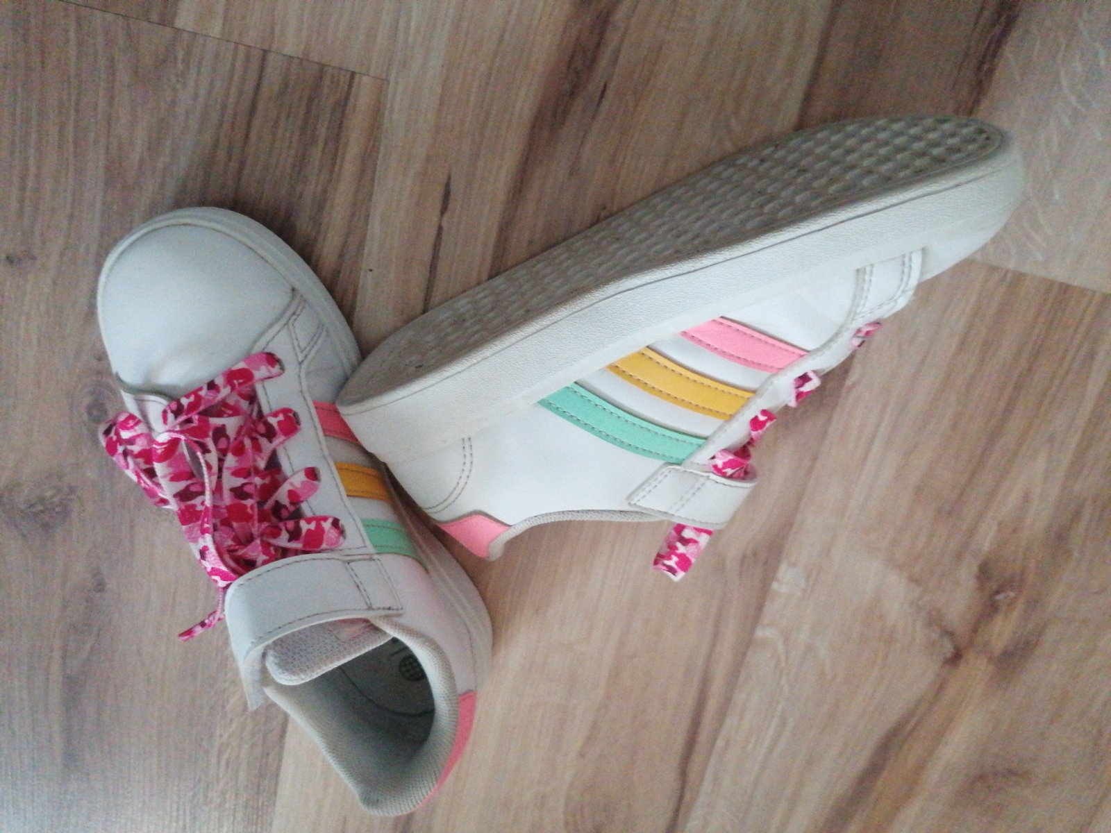 Tenisky na šnurovanie Adidas, s ružovými detailami. Veľkosť č. 33. Opotrebenie podľa fotografií.