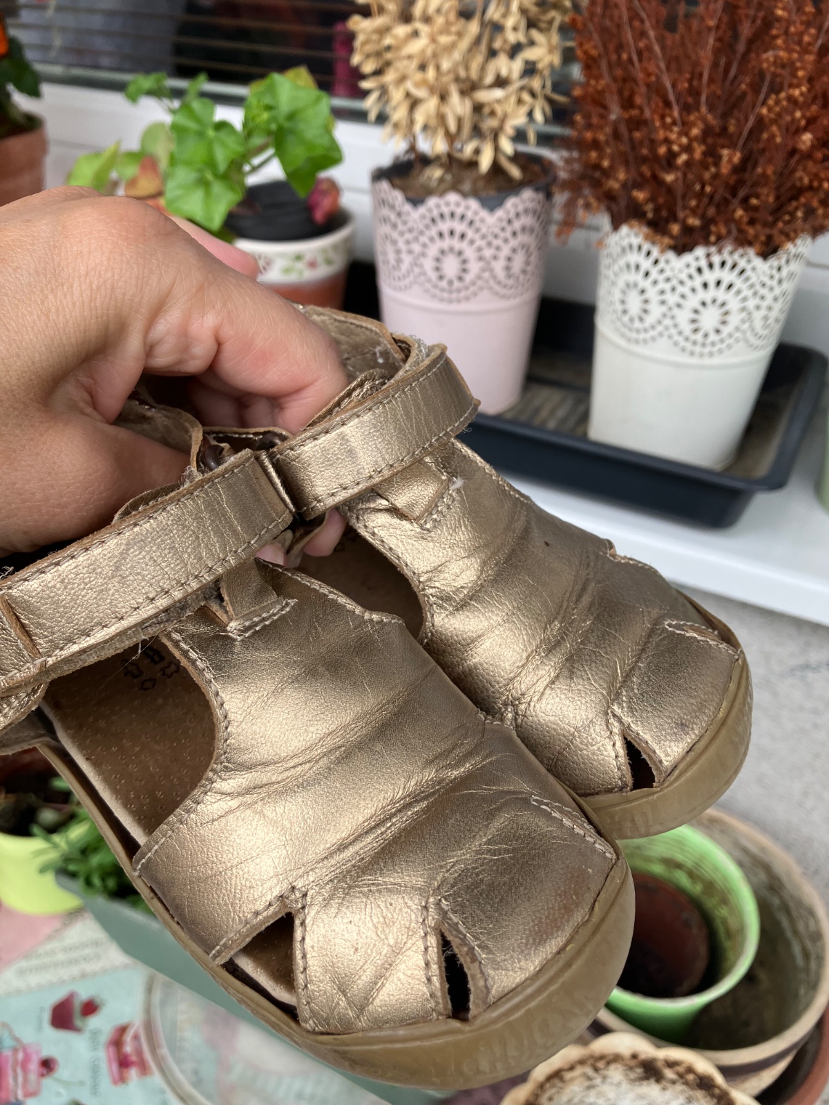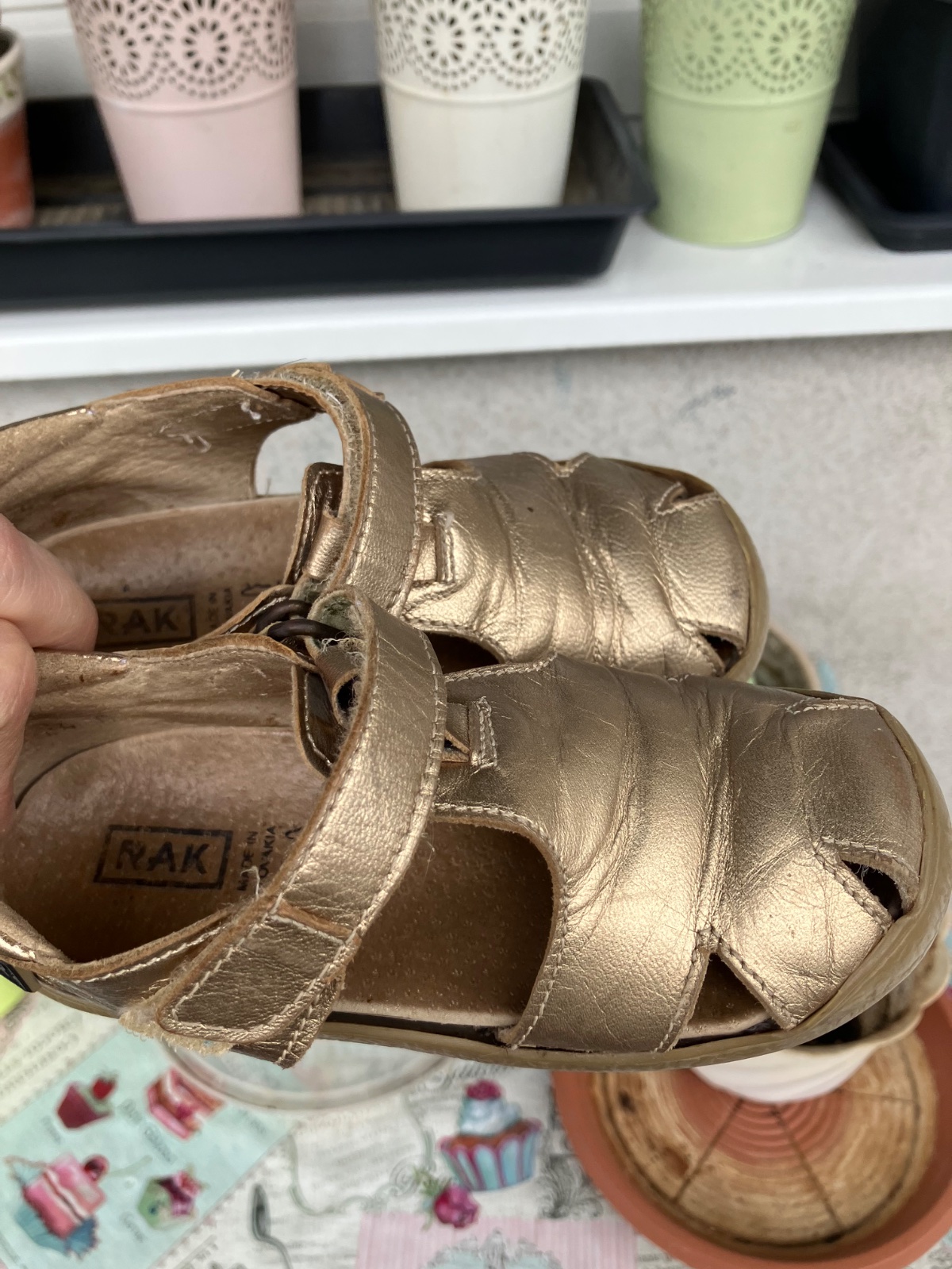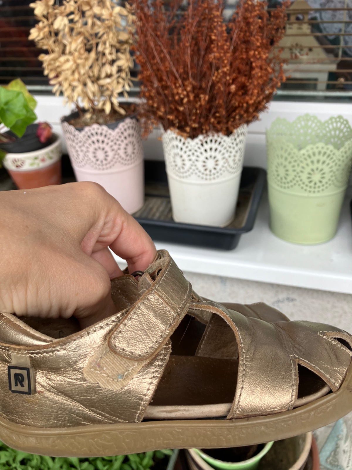 Nádherne sandálky v zlatej farbe. Medzi prst. Naše obľúbené. Kvalitne prevedenie na ktorom nie je vidieť vôbec opotrebovanie. Vnútorná dĺžka na nozku cca 16cm max.