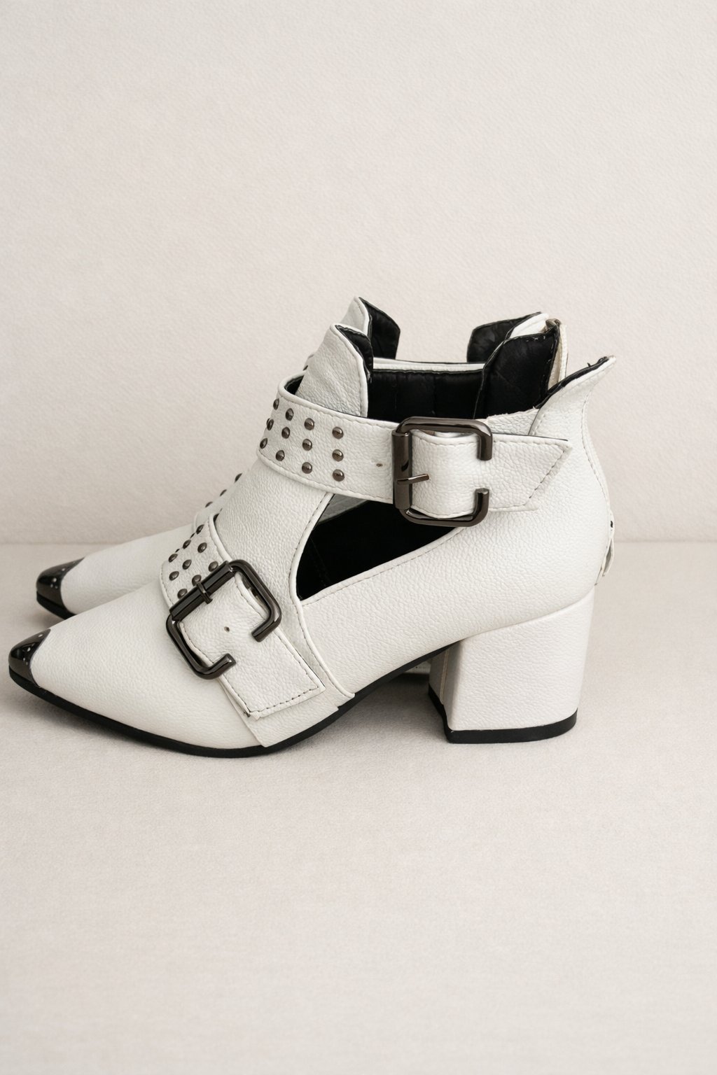 Štýlové biele členkové topánky s moderným dizajnom. Majú špicatú špičku s kovovým detailom, dekoratívne cvočky a dvojité pracky, ktoré im dodávajú výrazný, módny vzhľad. Stabilný blokový opätok zabezpečuje pohodlné nosenie. Bočné výrezy robia topánky ľahšími a ideálnymi aj na prechodné obdobie.