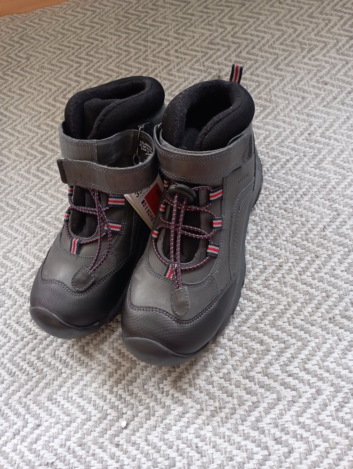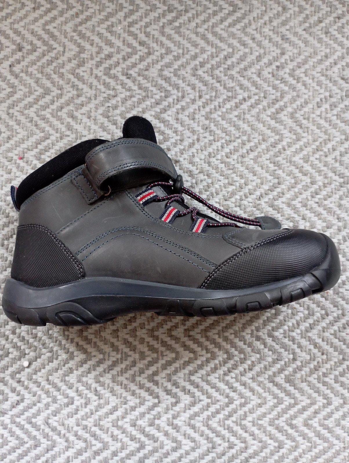 Úplne nové chlapčenské topánky, nestihli sme vynosiť. Mierne vyteplene zvnútra flisom. Materiál je uvedený koža. Nie je to goratex.