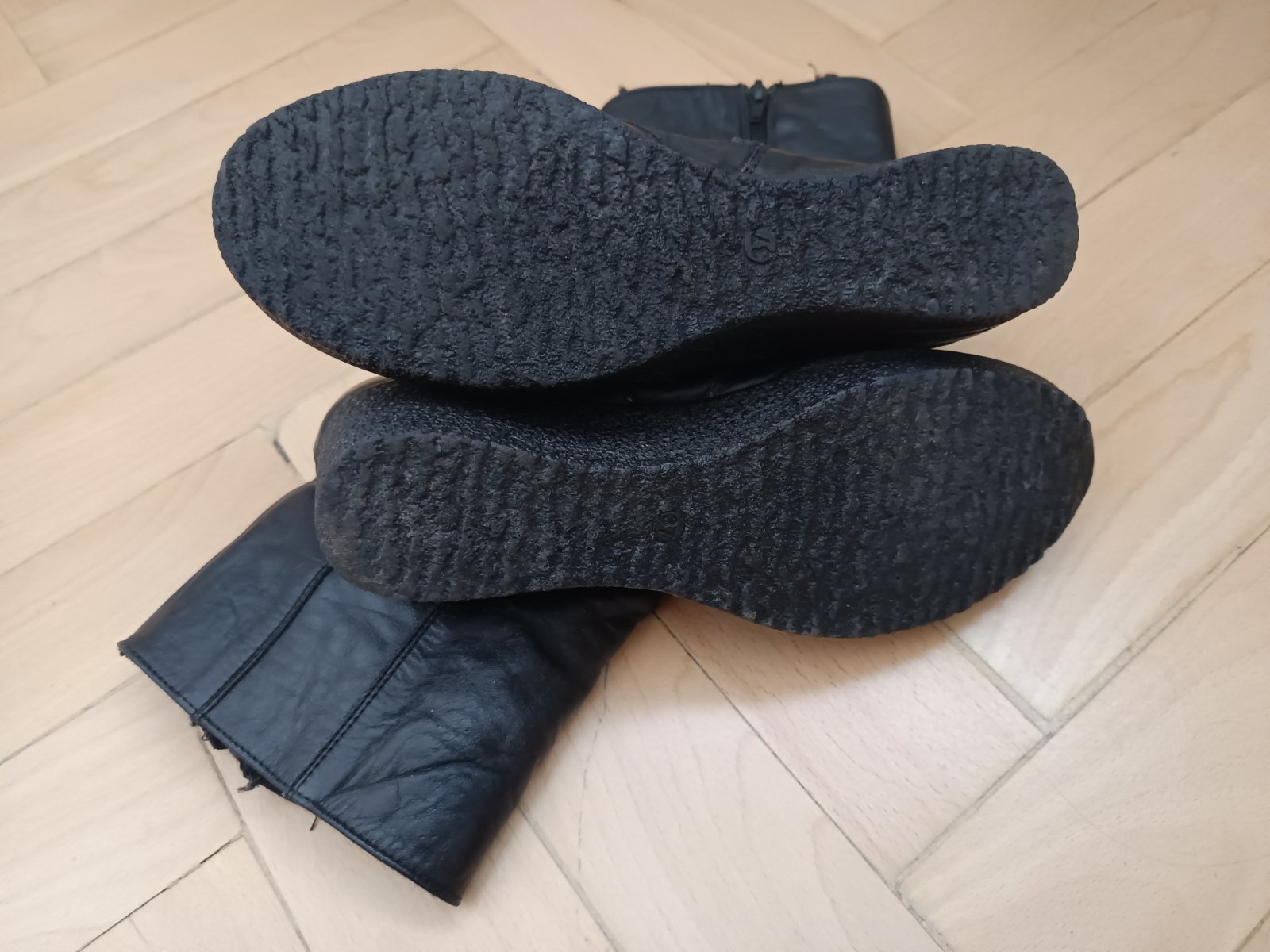 Kožené čižmy, pohodlné, vo veľmi dobrom stave, opätok 9cm, horný obvod sáry 39cm, a vd 23,8 cm. Na foto je priložená tabuľka rozmerov z krabice.