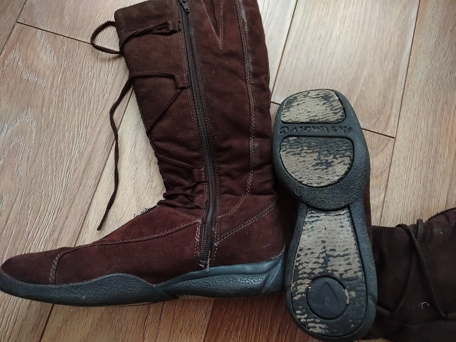 vysoké kožené čižmy na klinovom opätku, tmavohnedej farby, taliansky dizajn, vnútro kombinácia kože a synt. kože, nie sú oteplené, skôr na suchú zimu, alebo chladnejšiu jar, jeseň, bez poškodení