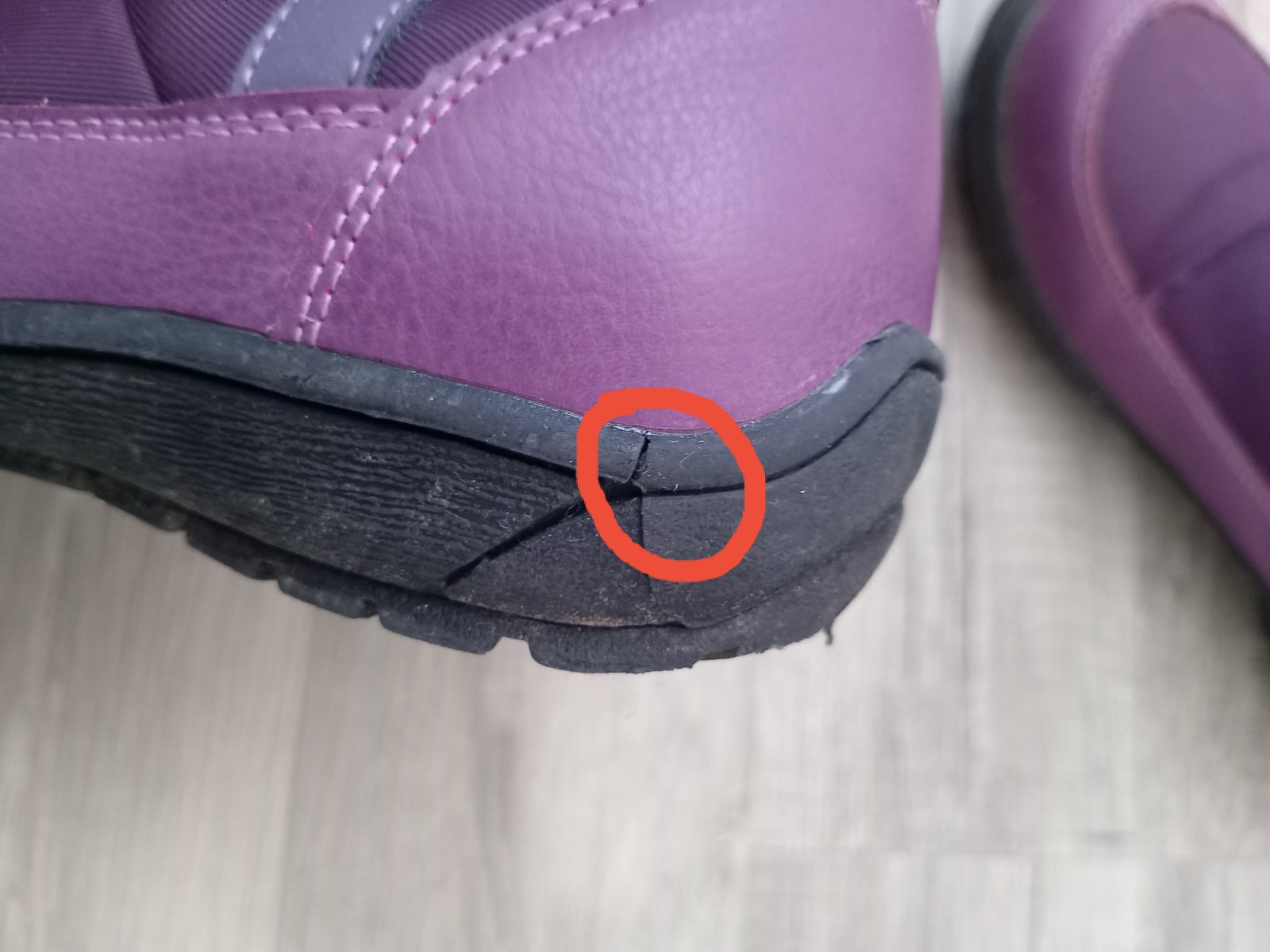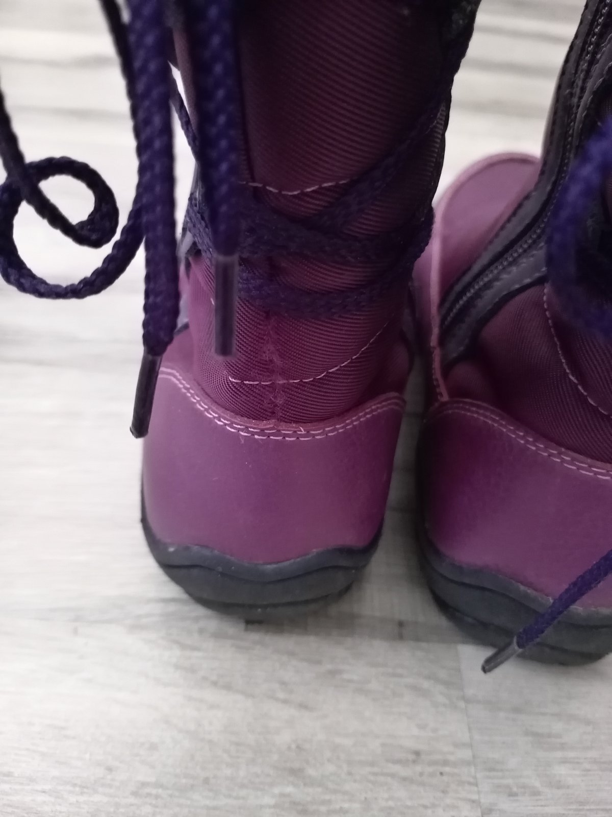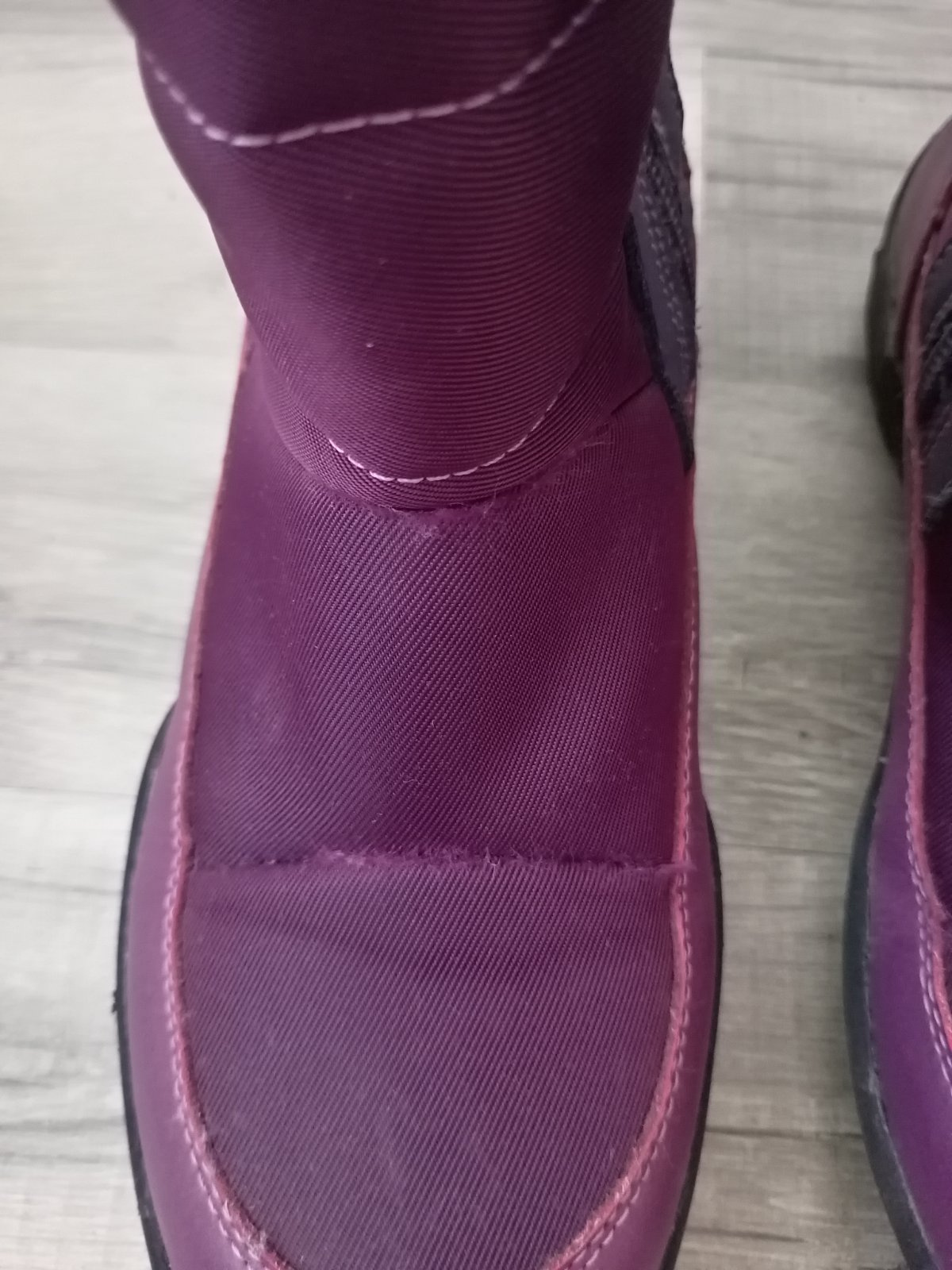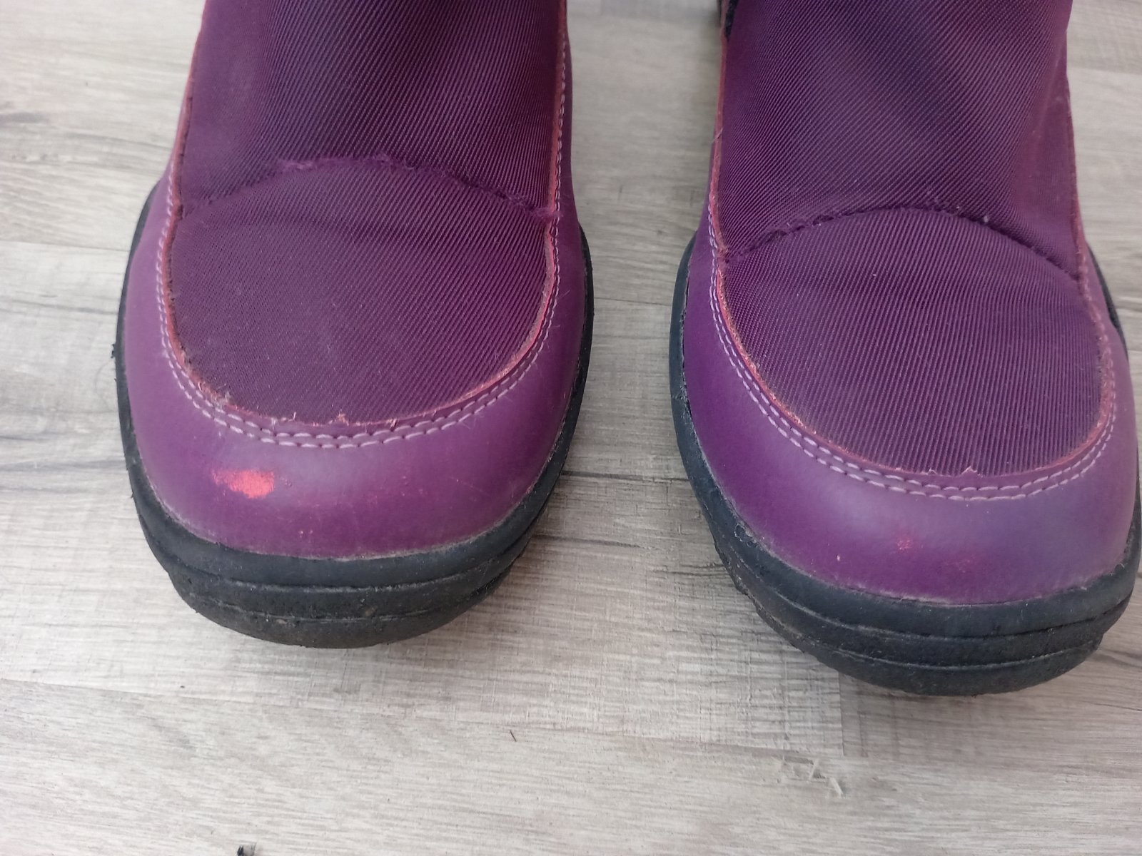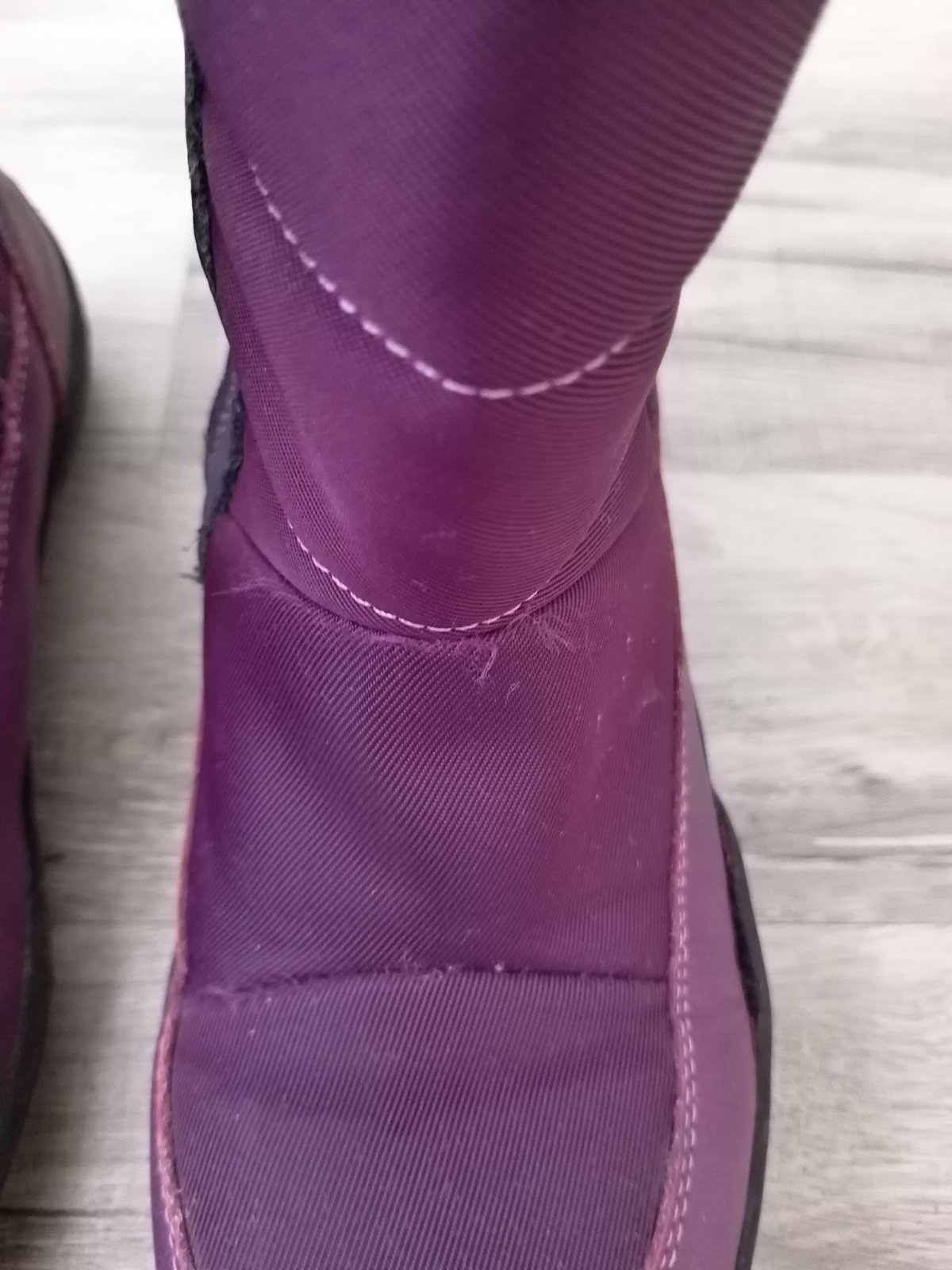 Na jednej čižme mierne odlepene od kraja podrážky, na druhej mierne odlepene na päte. V predu aj v zadu sú roztrapkane nitky, látka neviem to opísať. Diery niesu nikde. Všetko som pofotila. Aj pri nedostatkoch sú stále pekné.