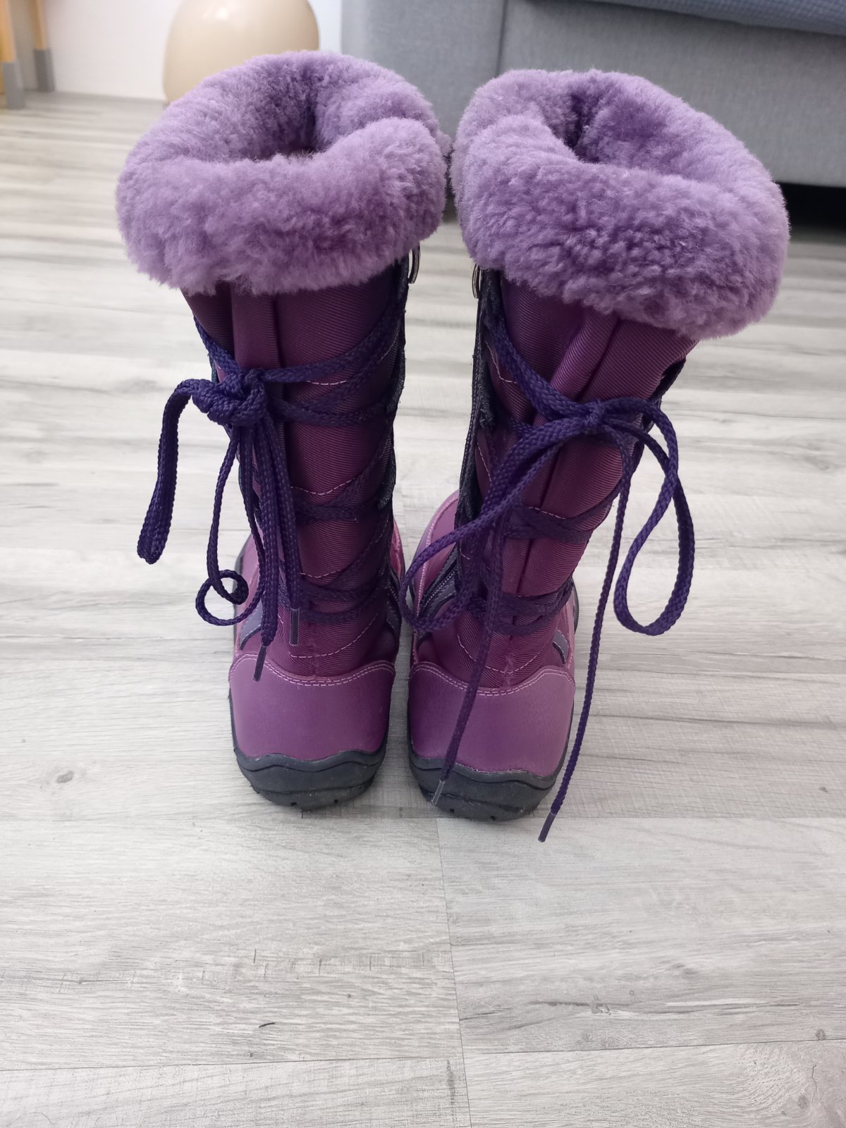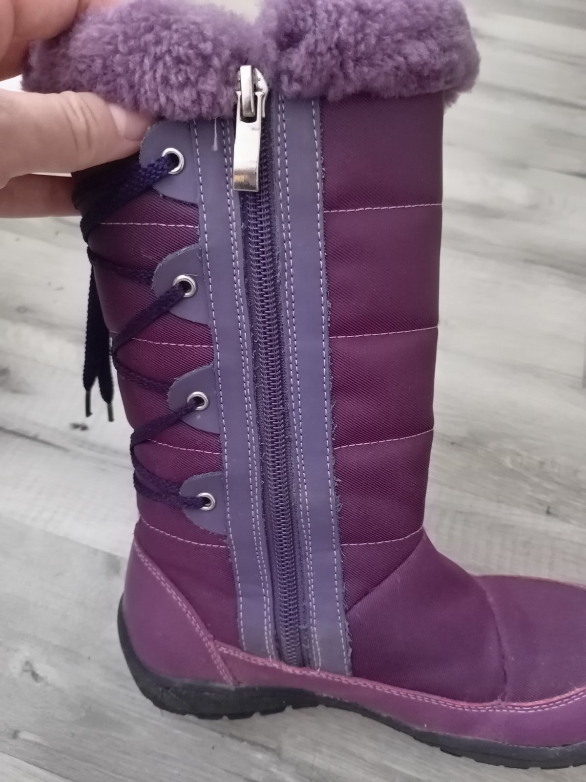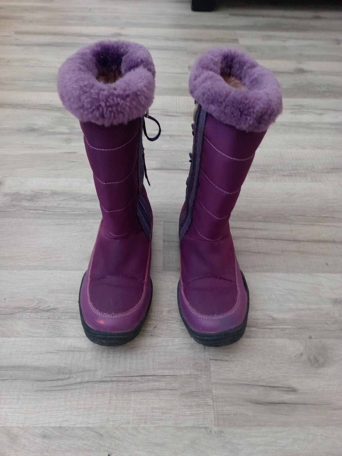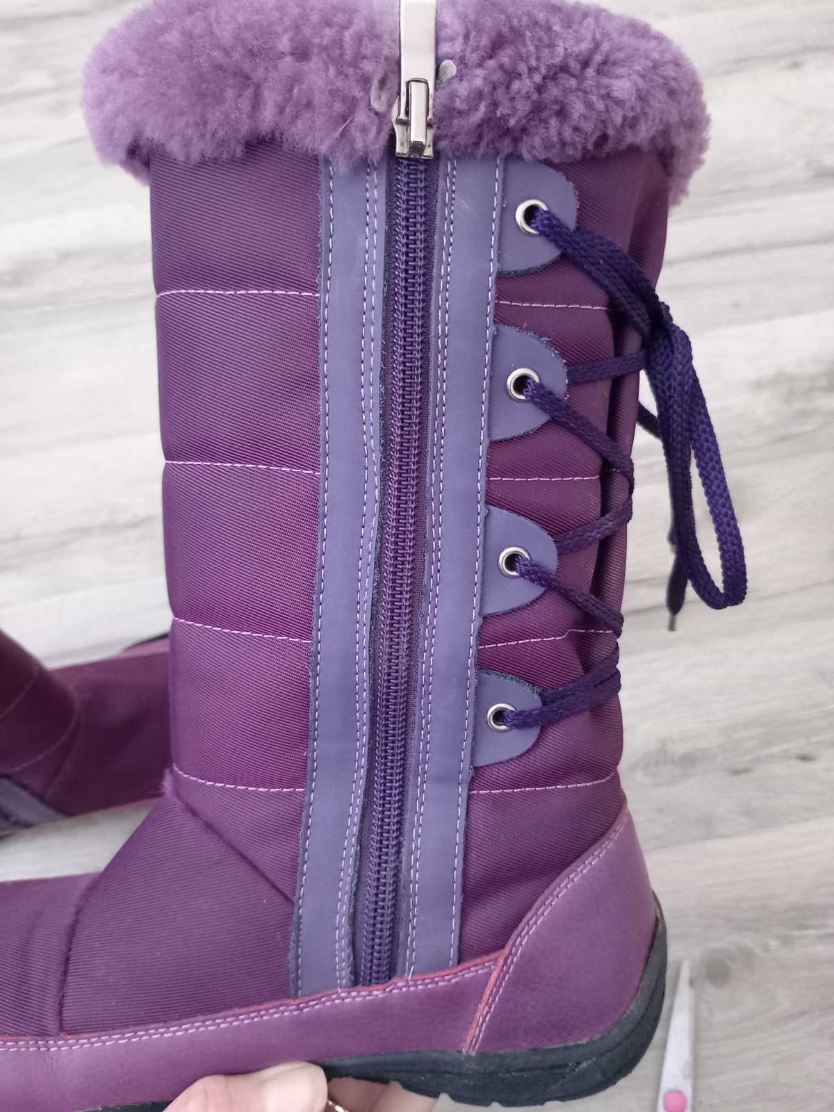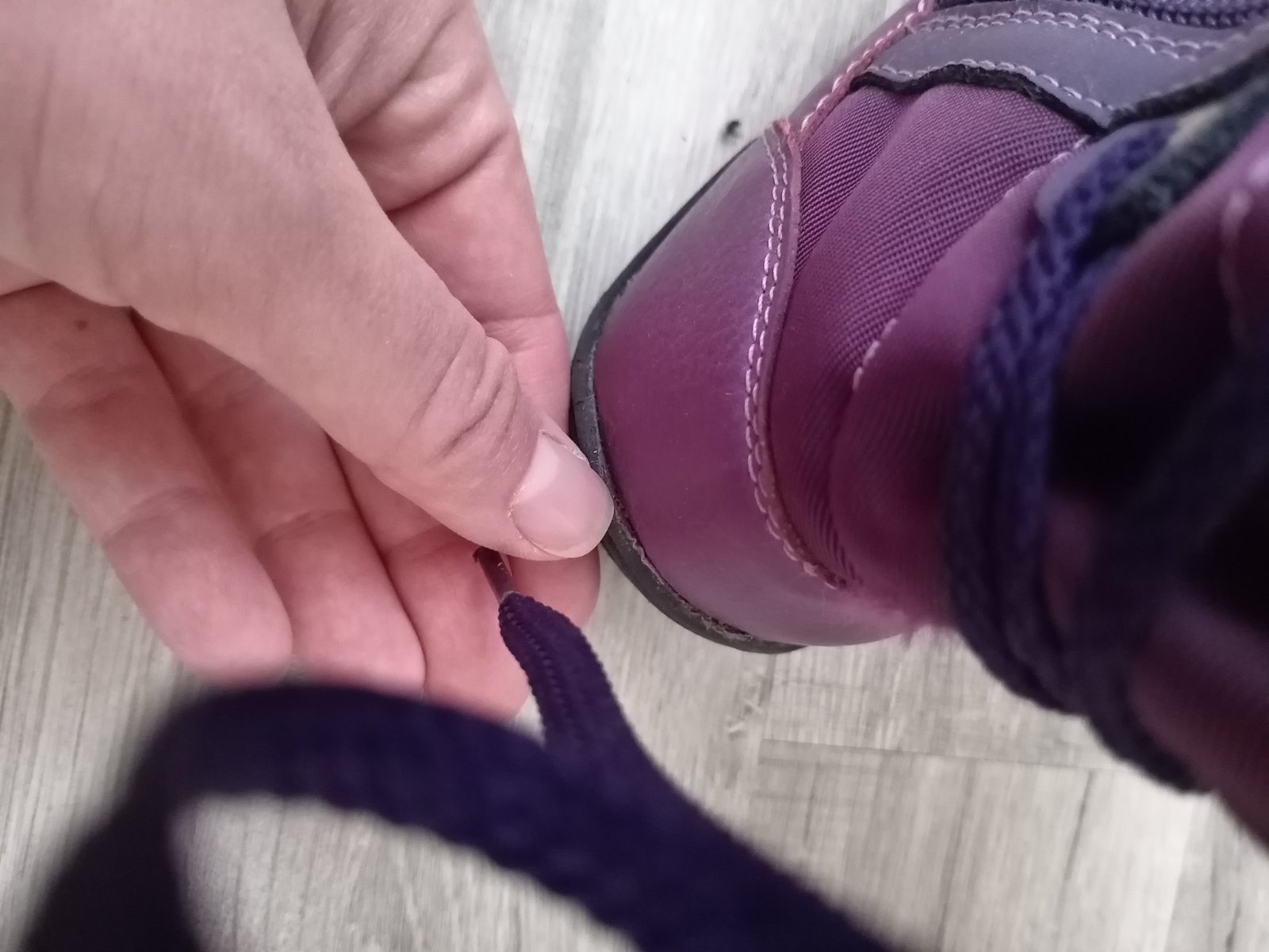 Na jednej čižme mierne odlepene od kraja podrážky, na druhej mierne odlepene na päte. V predu aj v zadu sú roztrapkane nitky, látka neviem to opísať. Diery niesu nikde. Všetko som pofotila. Aj pri nedostatkoch sú stále pekné.