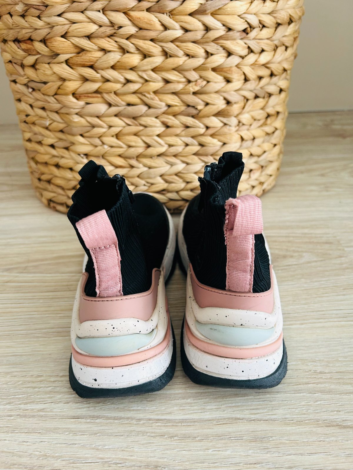 Predám tieto ponožkové tenisky značky ZARA vo veľkosti 34. Nosené boli na striedačku s inými teniskami. Sú veľmi pohodlné, majú miernu traktorovú podrážku, zapínajú sa na zips z vnútornej strany. Vnútorná dĺžka: 21,5cm.