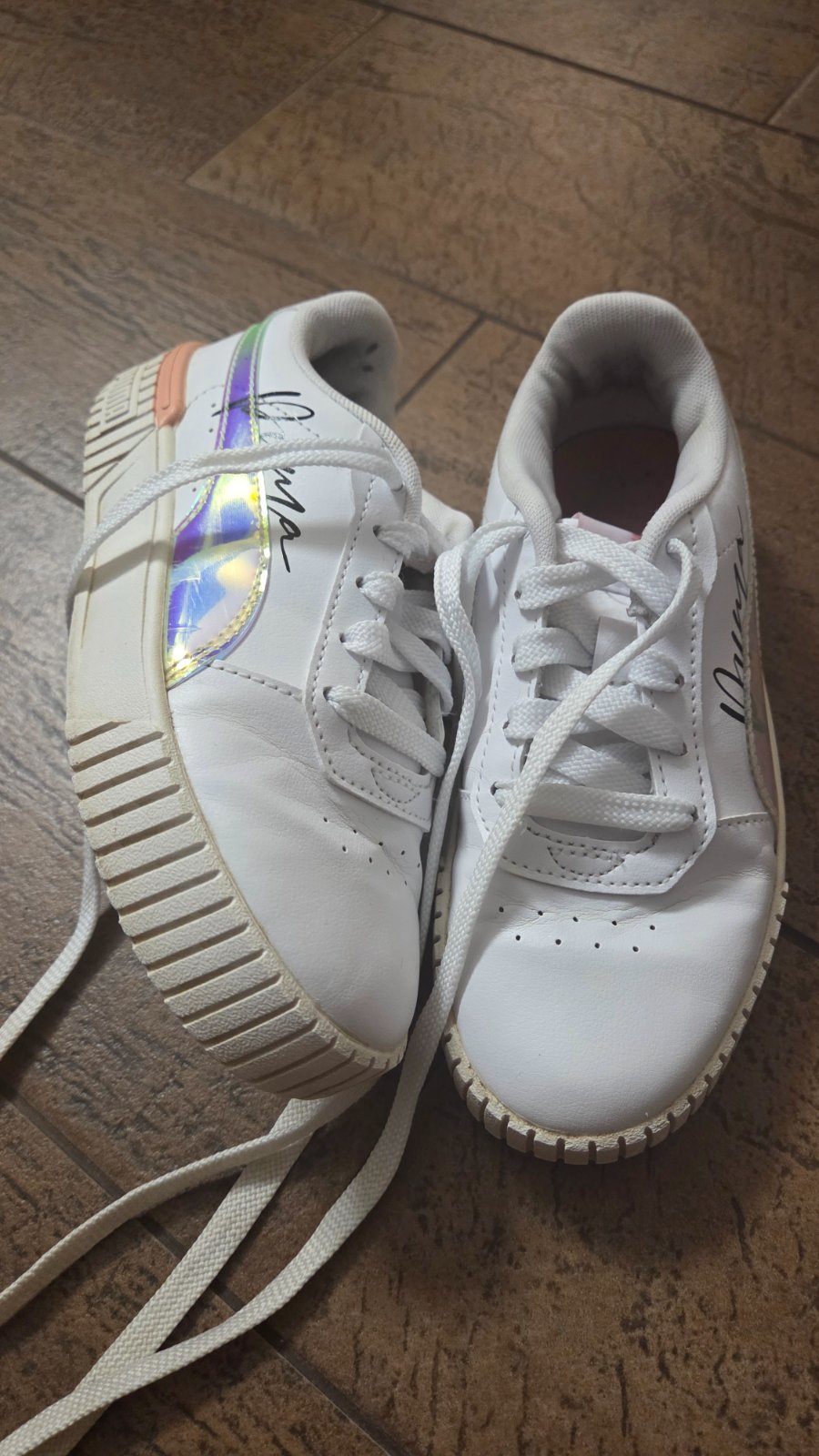Predám krásne tenisky PUMA v dobrom stave. Predky už niesú čisto biele a sú trošku ošúchané v mieste zošitia. A na jednej v zadu je trochu zošúchaná farba, inak bez poškodení. Vnútorná dĺžka je 19...