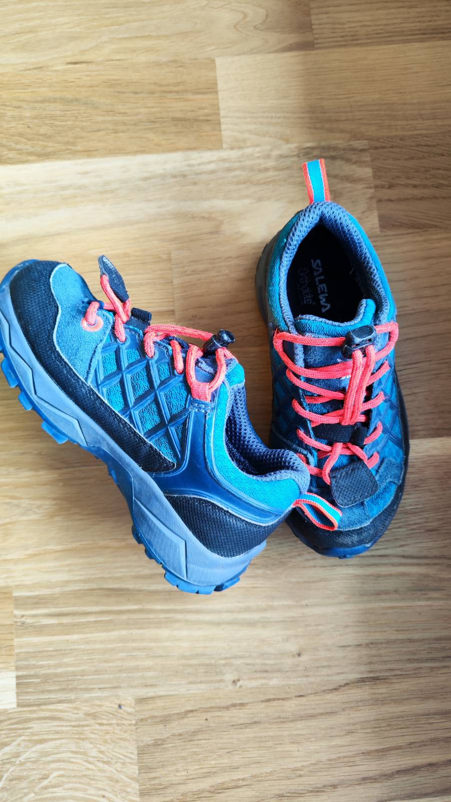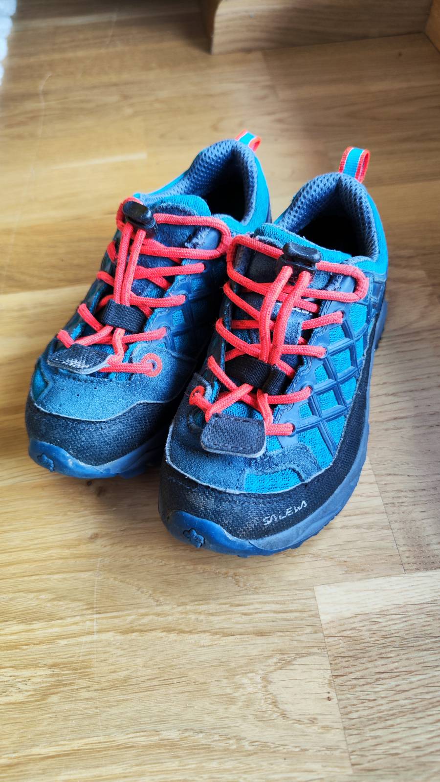 Pevné detské turistické topánky od značky Salewa (model Jr Wildfire) so zaťahovacou šnúrkou, vhodné na horskú turistiku.