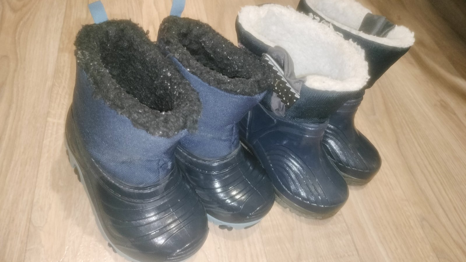 Predám dva krát oteplene čižmy jedne na suchý zips číslo 22 14cm vnútorná dĺžka,, druhé kde sa noha len zasune číslo 23.vnutorna dĺžka 14,5 cm