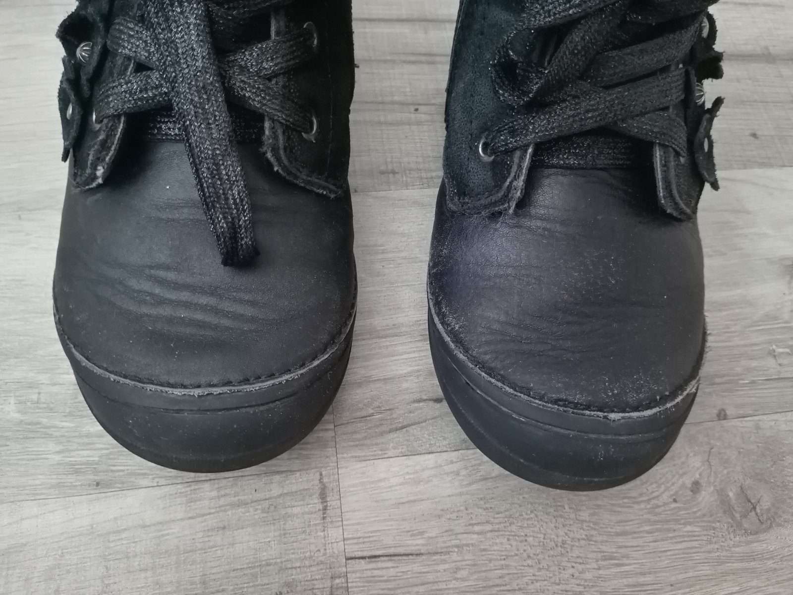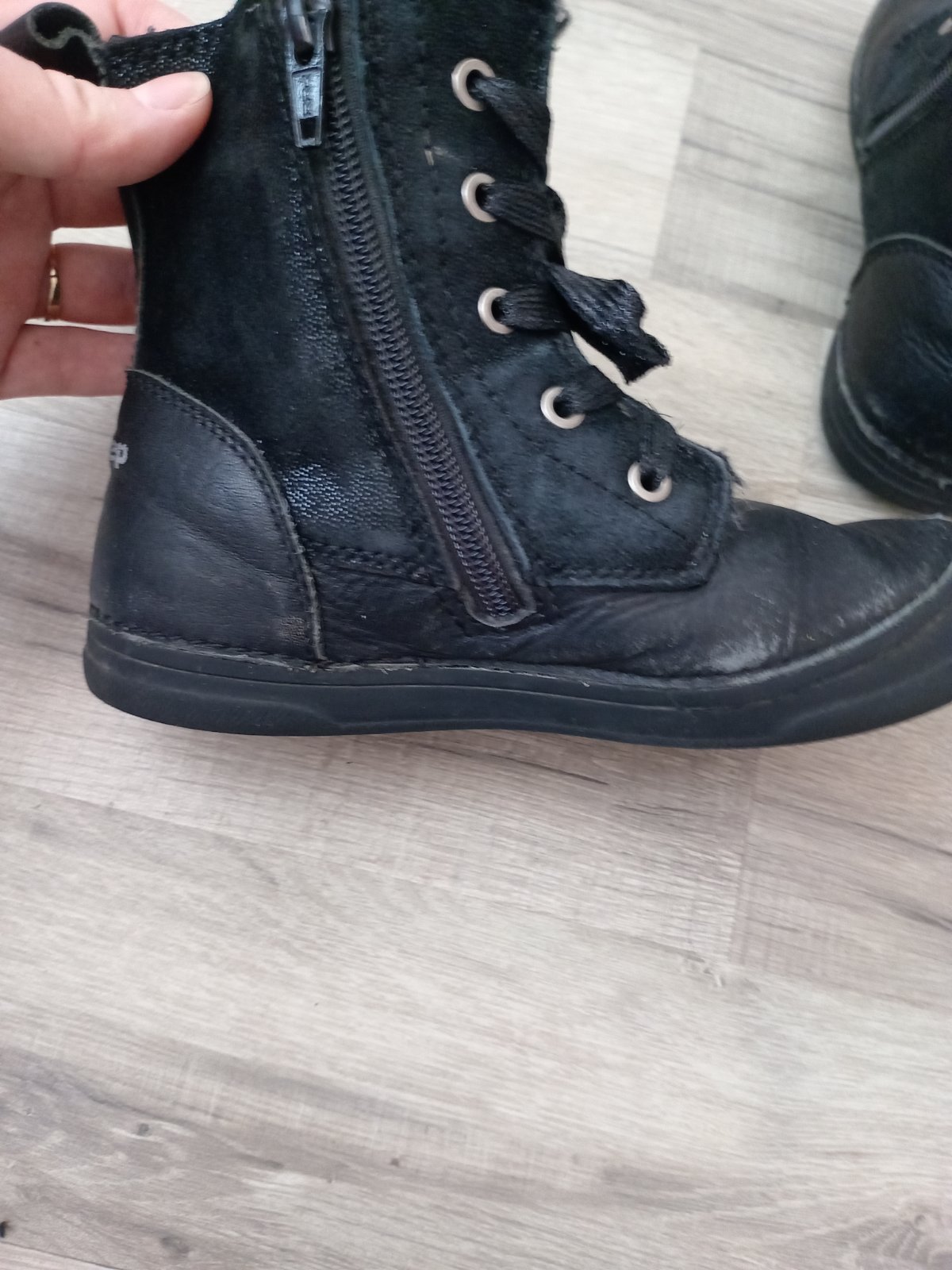 Nosené. Majú vyšuchane miesta na koži v predu, na bokoch a v zadu na päte. Päta - podrážka mierne vyšuchaná. Diery ani praskliny nemajú. Zips funguje