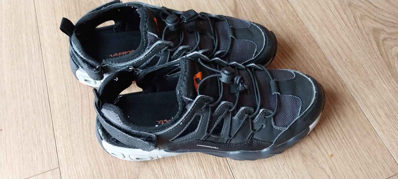 zn. DELKA, veľkosť 41, šírka H. Ako nové - 3 x obuté. Zapínanie na suchý zips, vpredu aj na remienku je gumička.