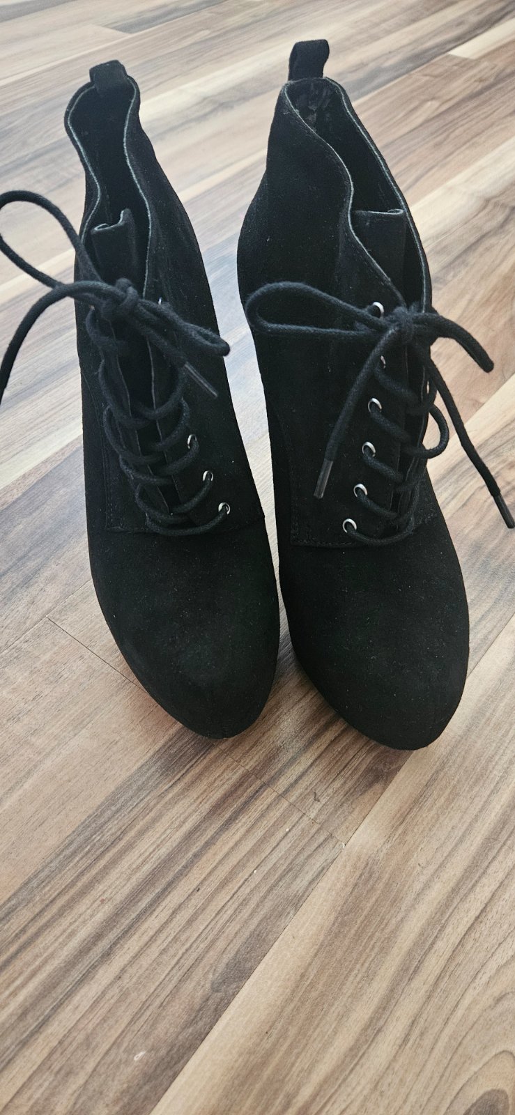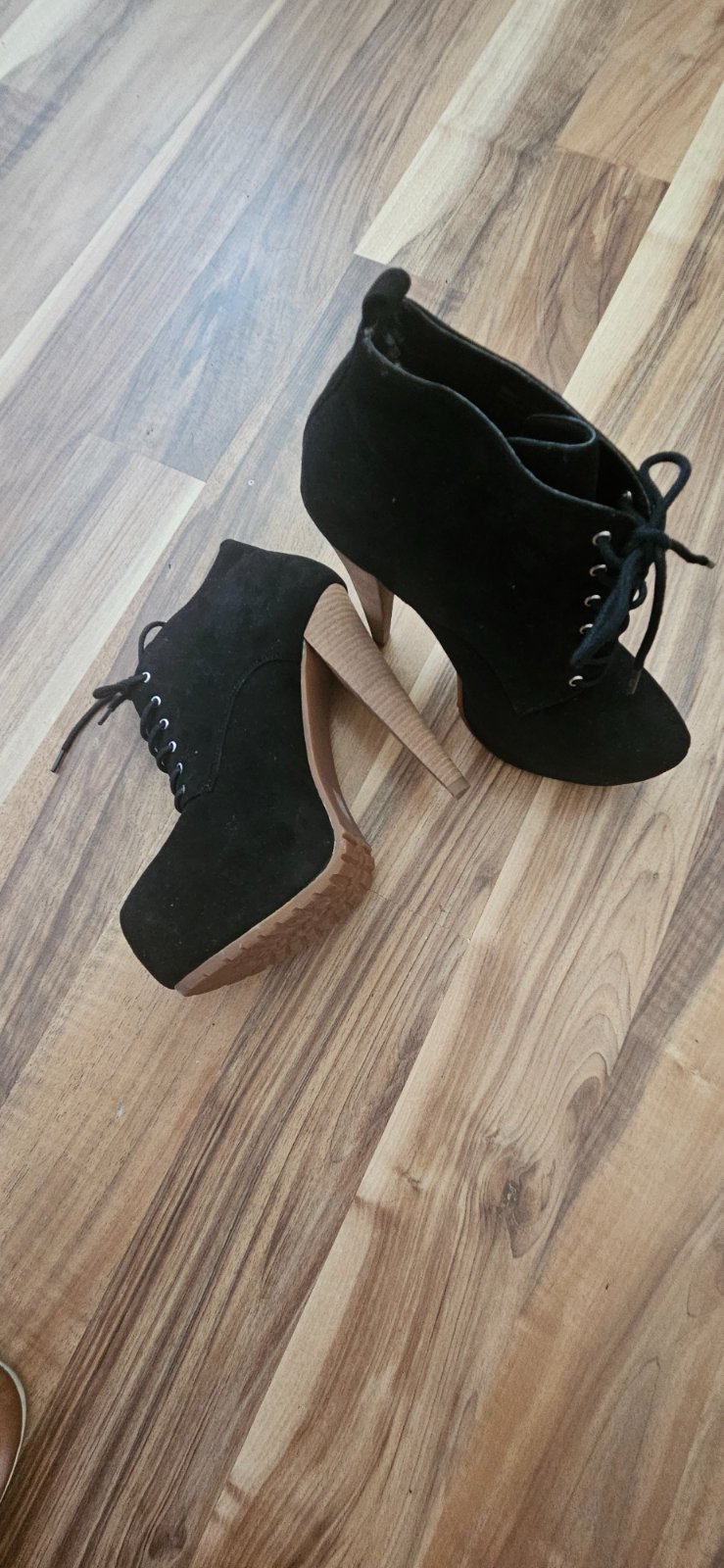 Extravagantné čierne členkové topánky na vysokom podpätku s dreveným efektom. Výrazné šnurovanie a hrubšia podrážka (traktorka) dodávajú topánkam šmrnc. Skvele sa hodia k úzkym džínsom alebo kožnej bunde.