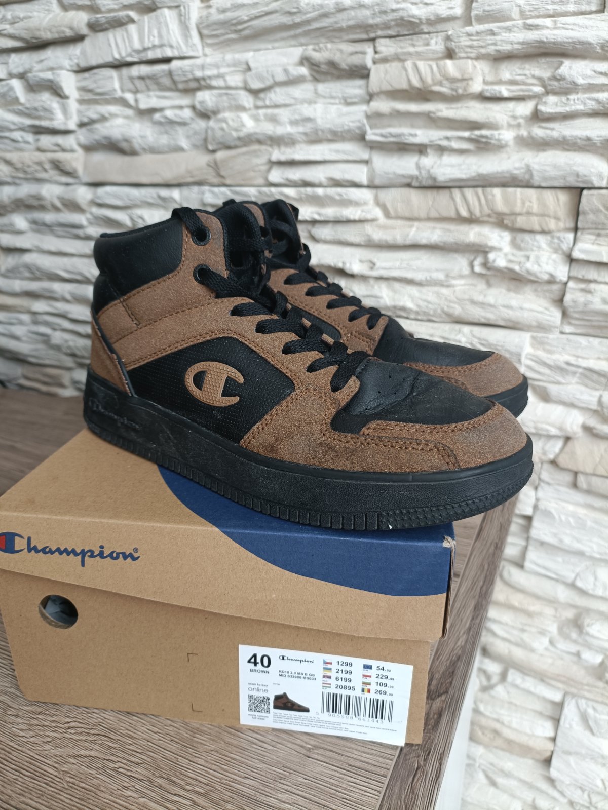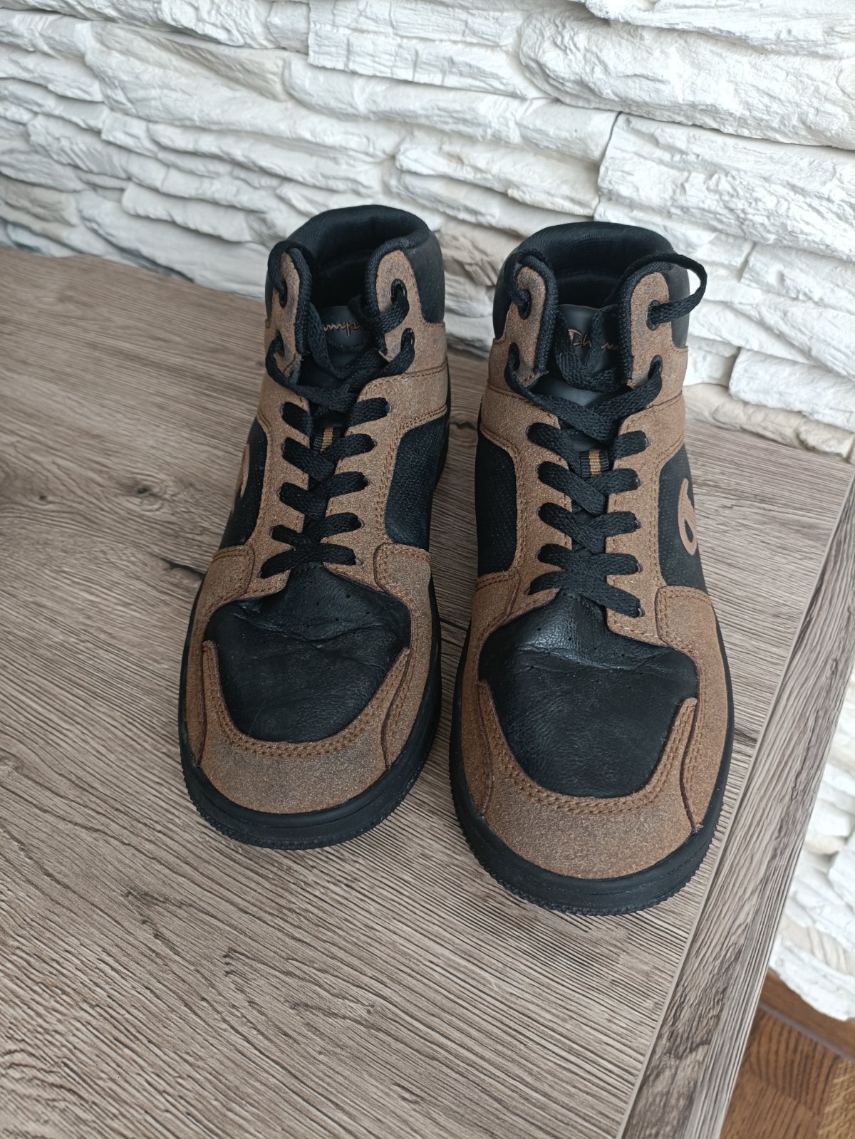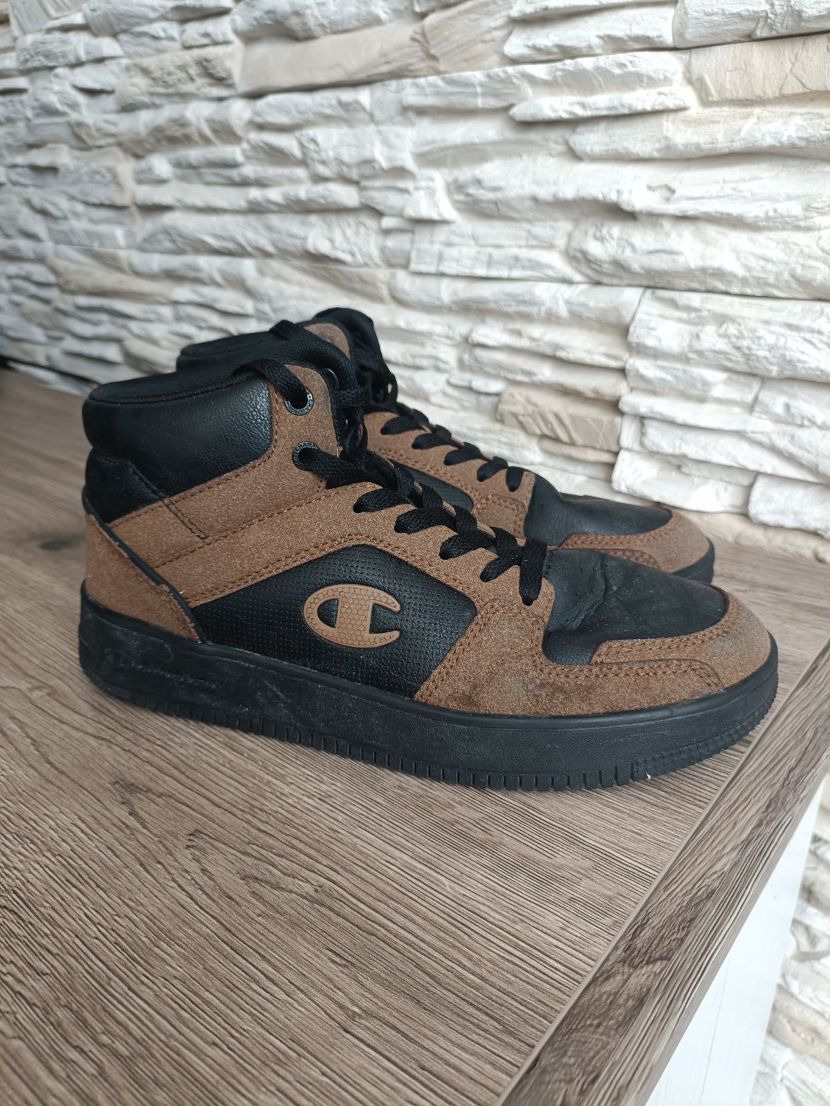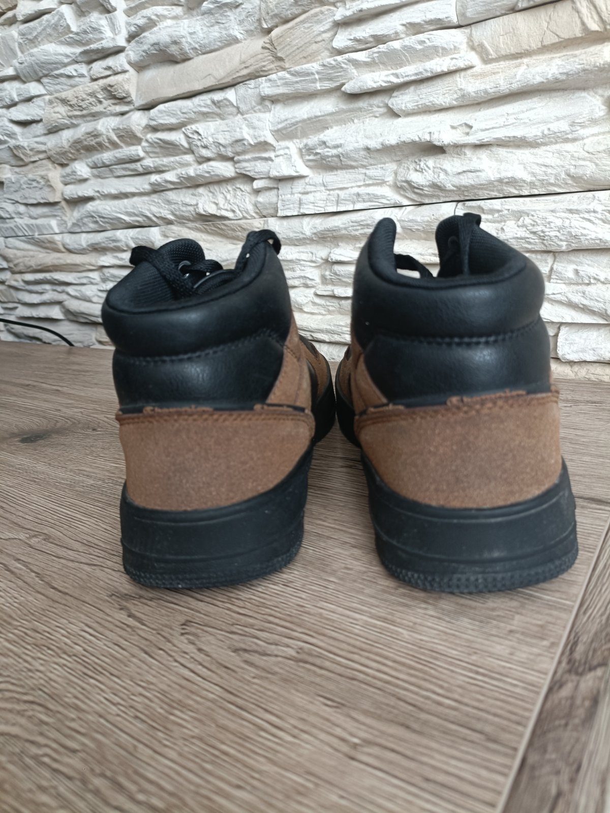 Vysoké členkové tenisky, pevnejší materiál. Syn ich nosil ako prechodnú obuv (nie sú zateplené) jednu sezónu. Veľkosť 40, VD je značená 25,5cm, ja som namerala 25cm. V časti, kde sa ohýbajú prsty, vidno z nosenia zlom, inak veľmi pekný stav. PC 55eur.