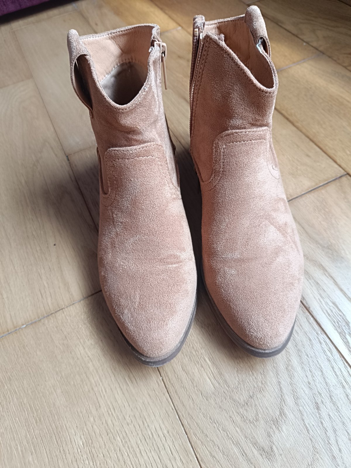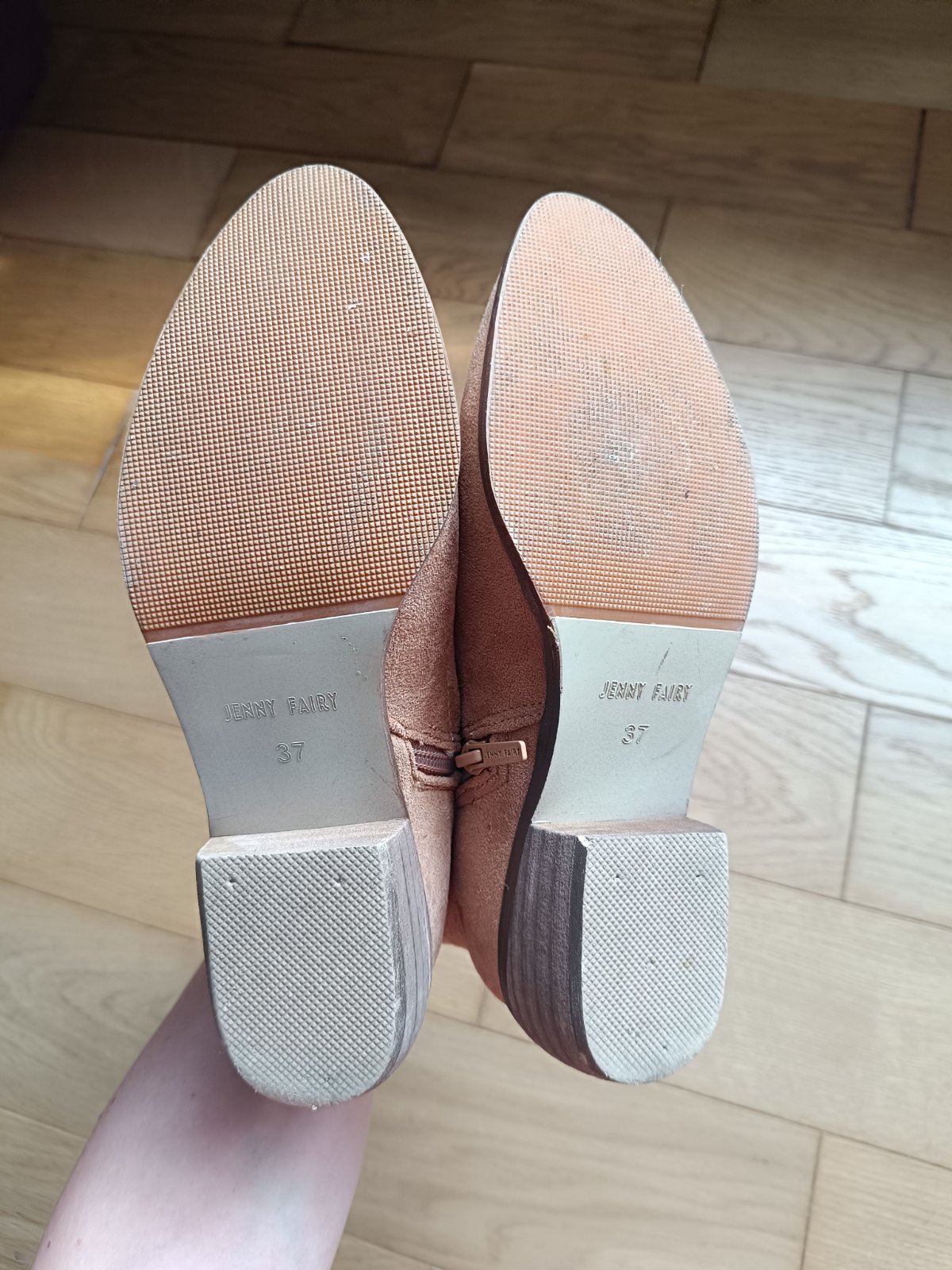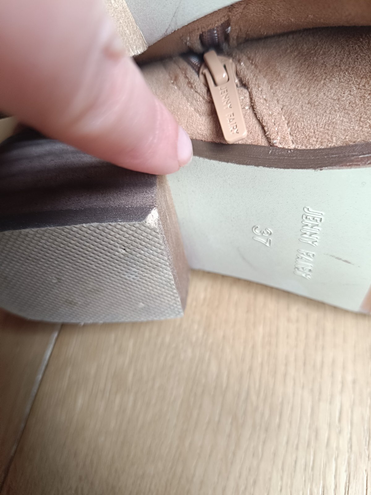 Farba skôr ťavia. Asi dvakrát obuté. Na 1 podpätku akoby kúsok odlupnute( viď foto). Ináč pekný stav bez poškodení.