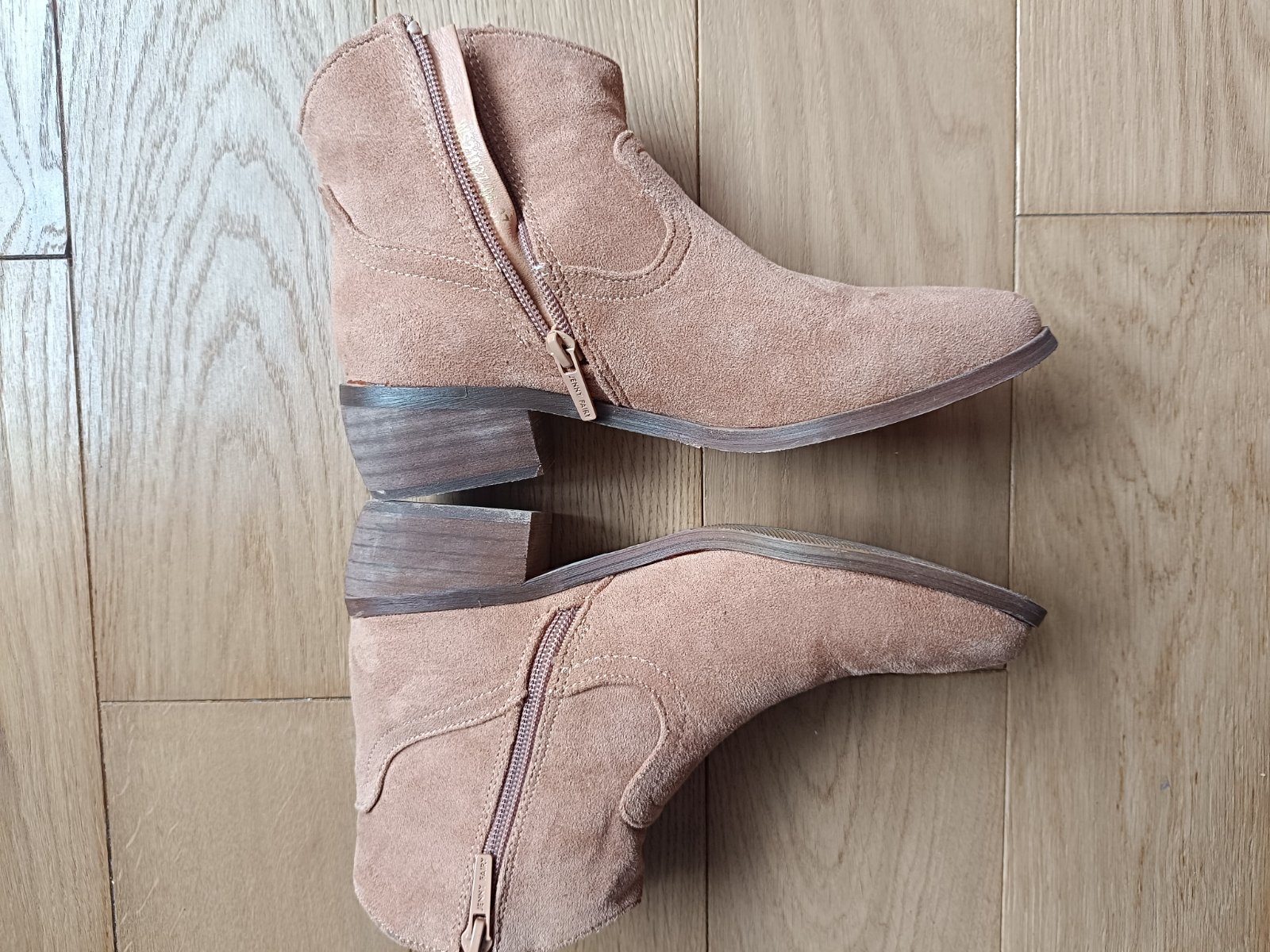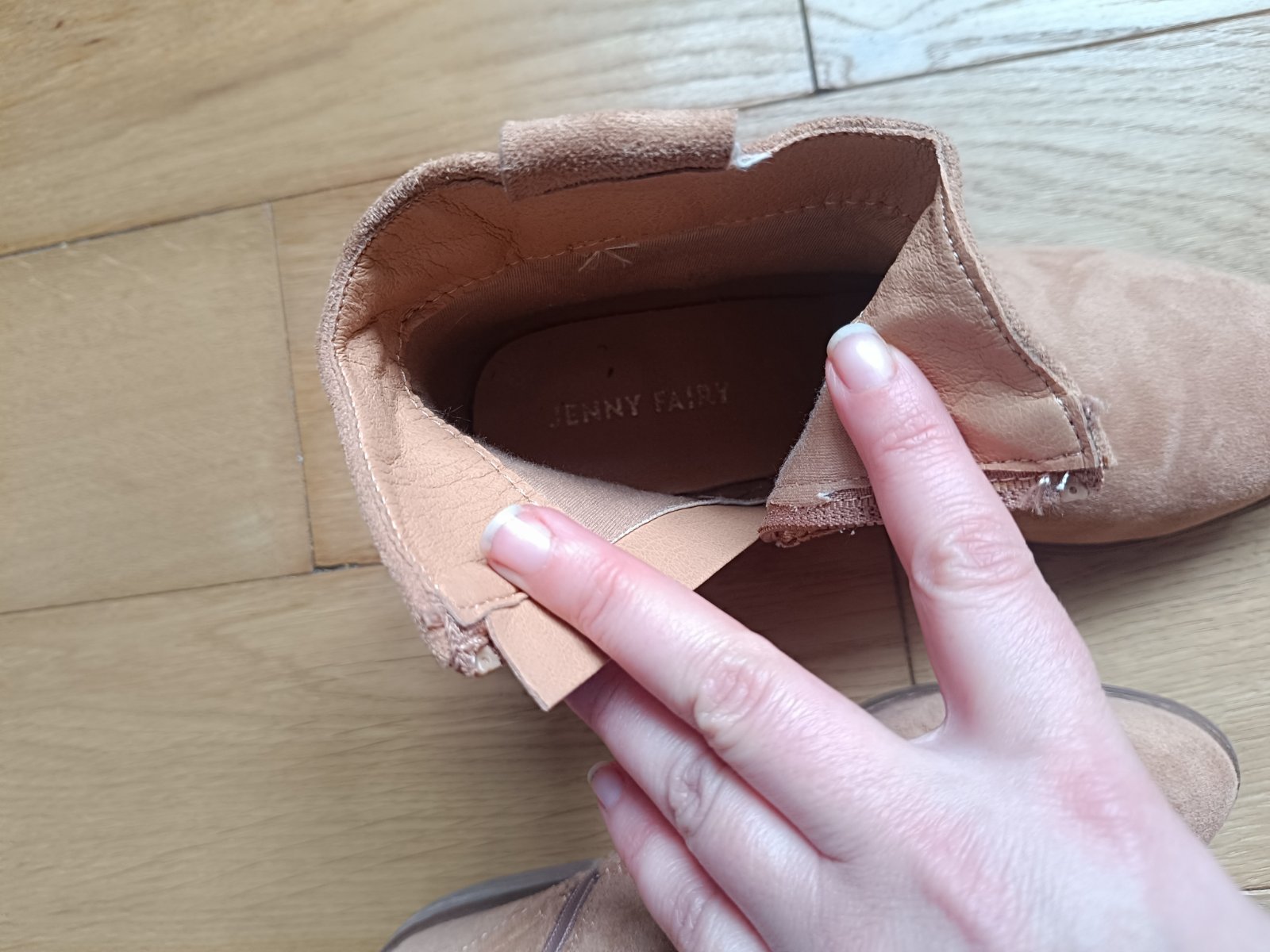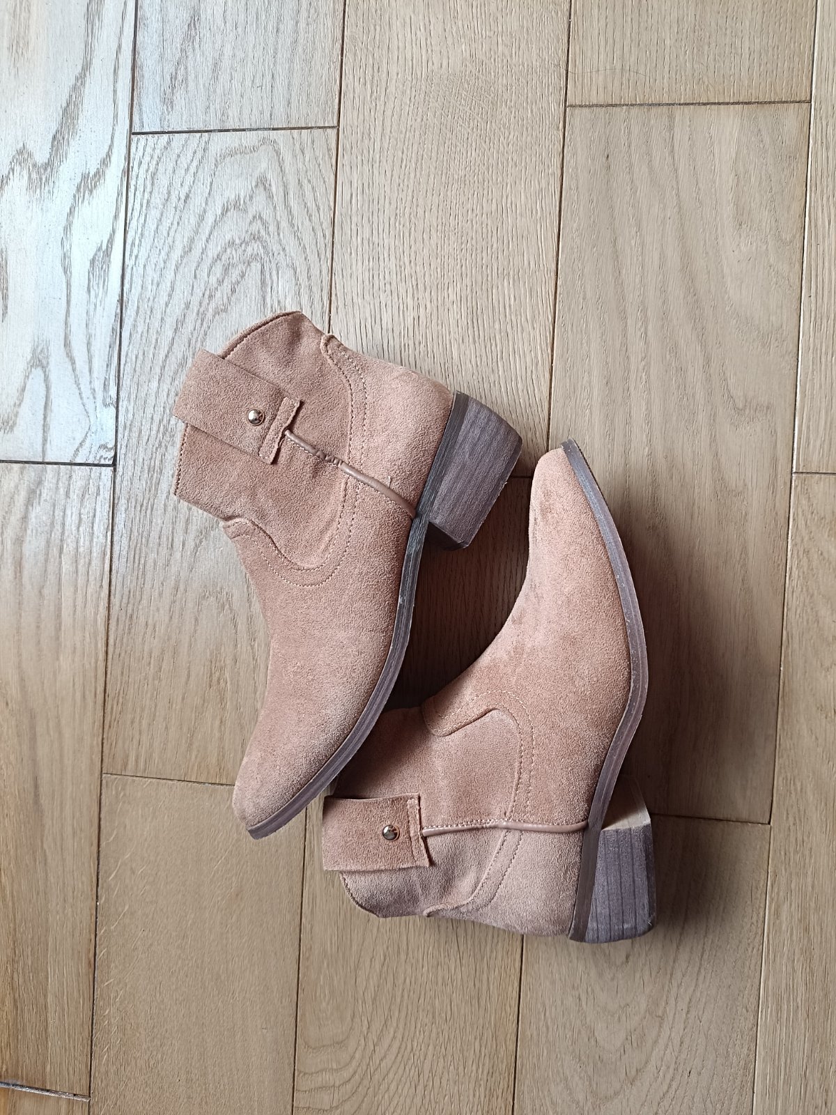 Farba skôr ťavia. Asi dvakrát obuté. Na 1 podpätku akoby kúsok odlupnute( viď foto). Ináč pekný stav bez poškodení.