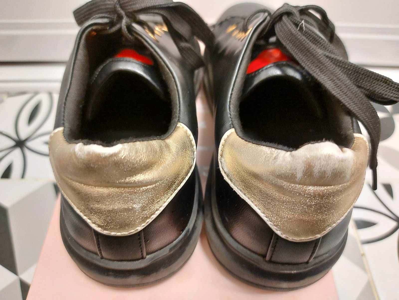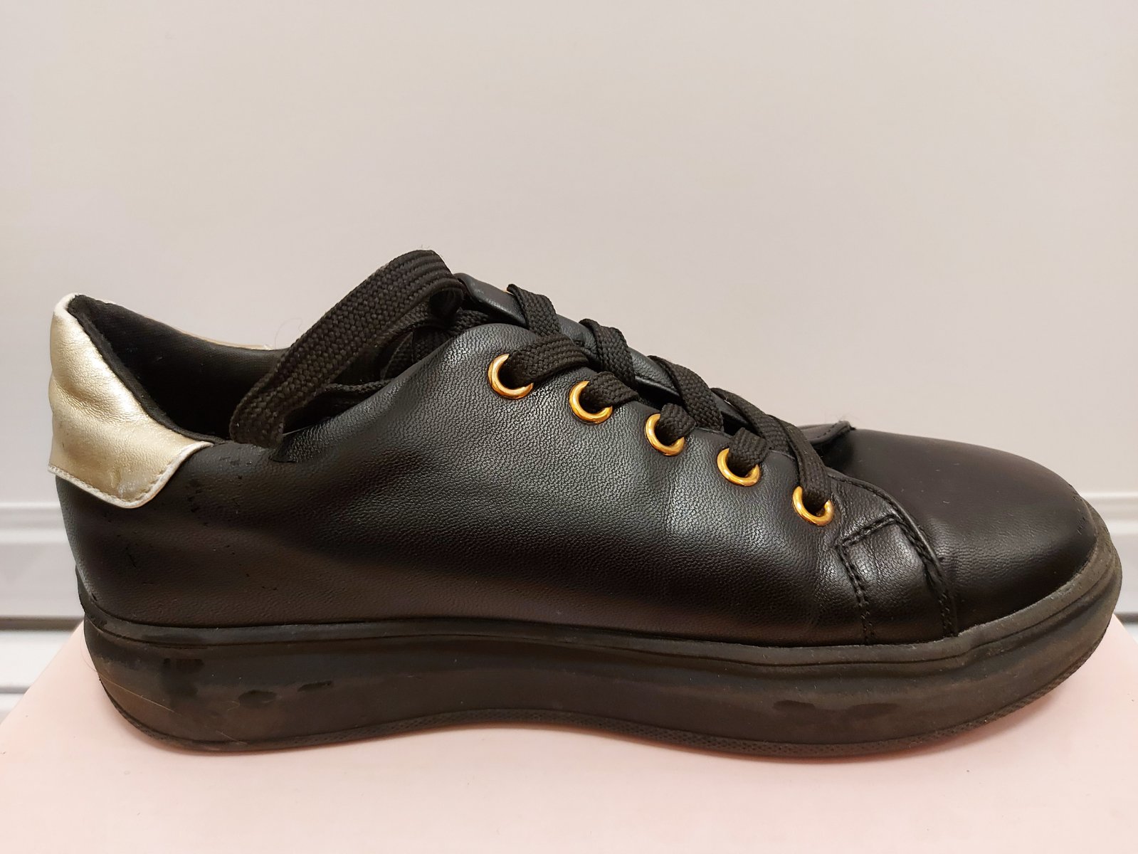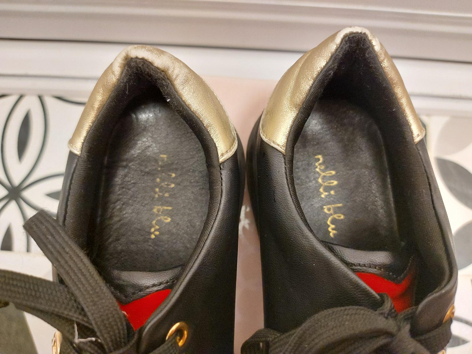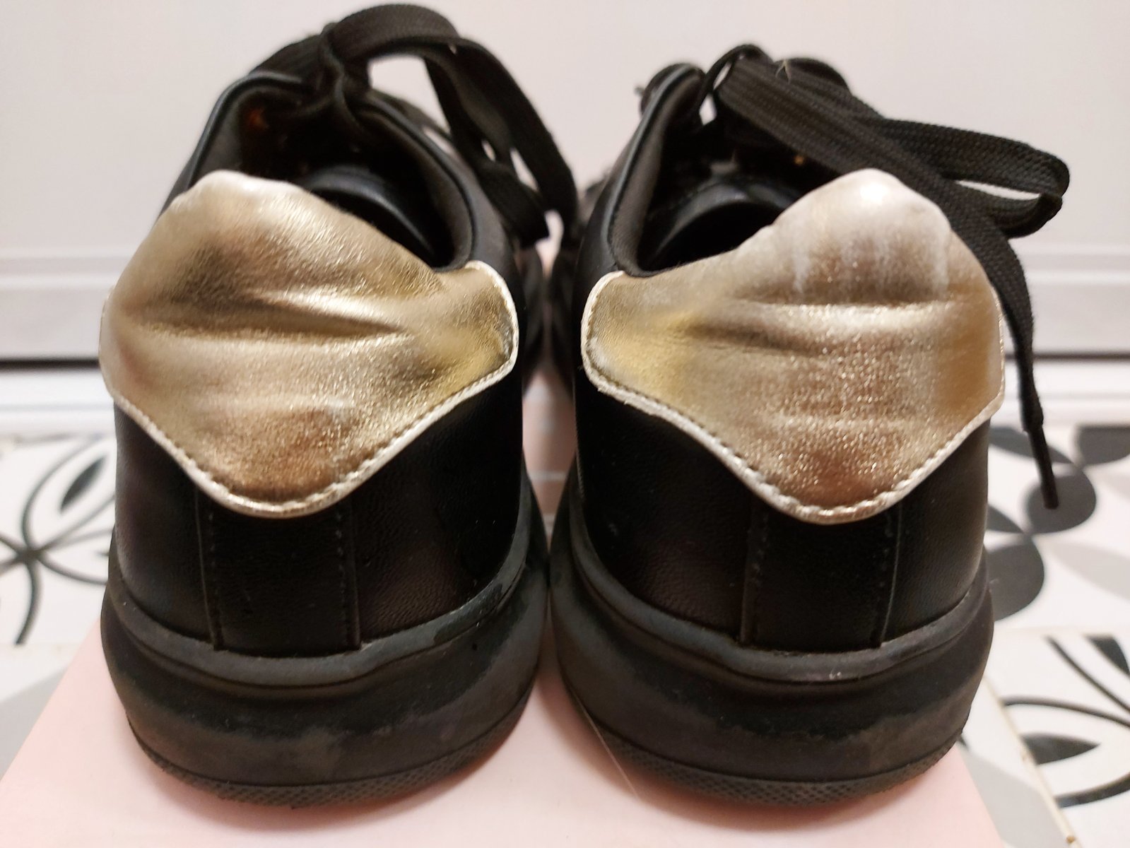 Koženeé prechodné topánky pre slečnu, so zlatými a ozdobnými detailami, na šnurovanie, bežne známky nosenia, viď foto. Drobné škrabance vyrieši krém na topánky, inak sú v naozaj dobrom stave a este posluzia.