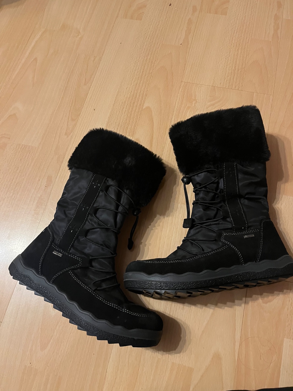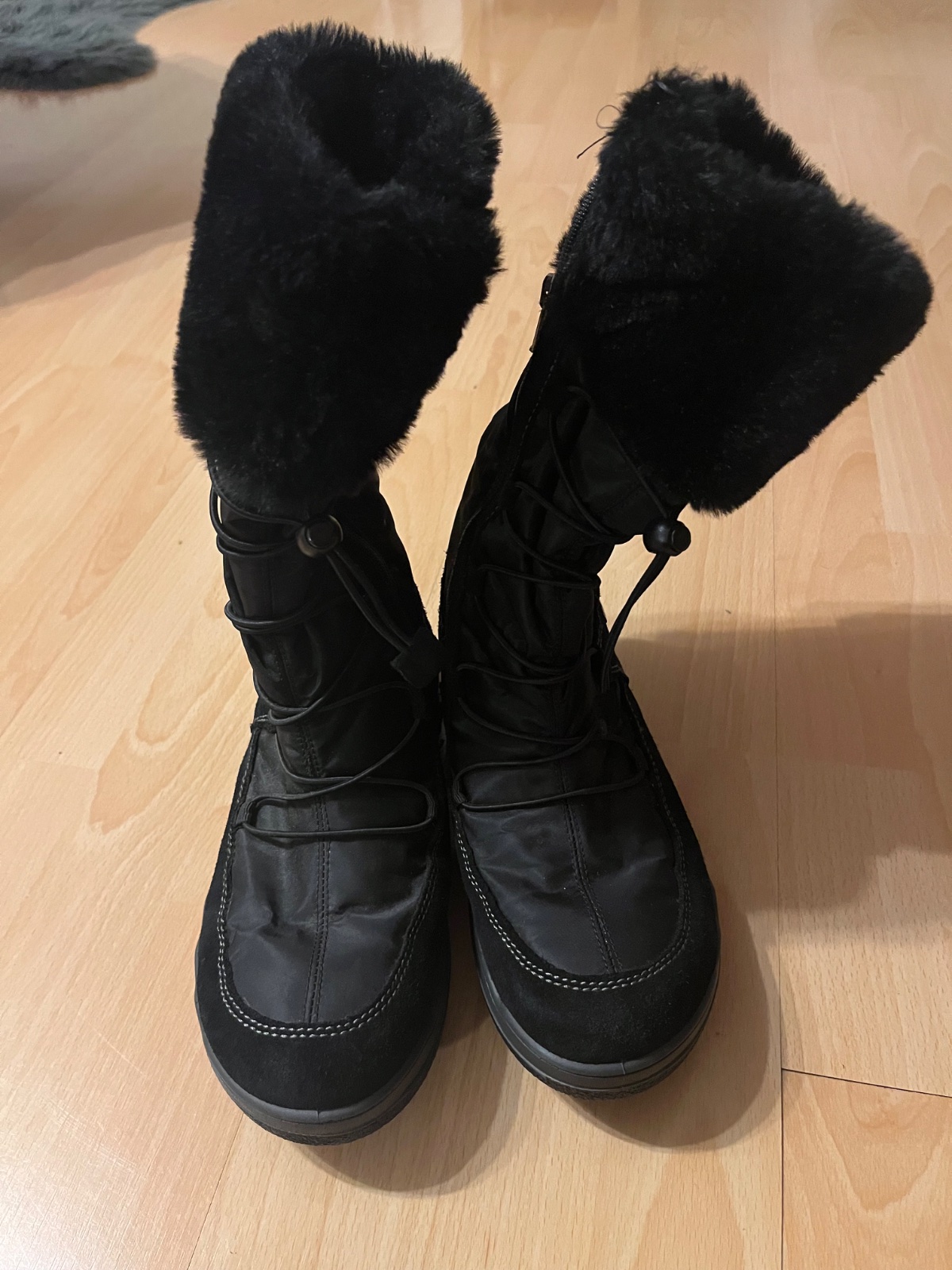 Úžasne vysoké teplucke čižmy na zimu, vnútri celé zateplené kozusinkou, top stav, boli obuté možno 2-3krat, a už boli malé, vel 38..vonkajšia dĺžka podrážky 26,5cm, vnútro žiaľ neviem odmerať..