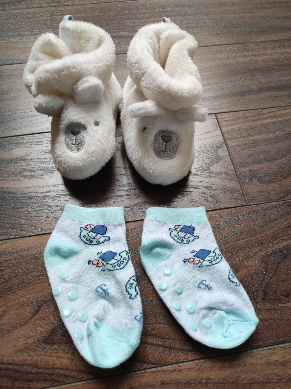 Predám capačky pre bábätko + protišmykové ponožky. Podľa mňa veľkosť 3-6 mesiacov, môžem ešte detailnejšie premerat. Veľmi ľahké obúvanie vďaka suchému zipsu na zadnej strane