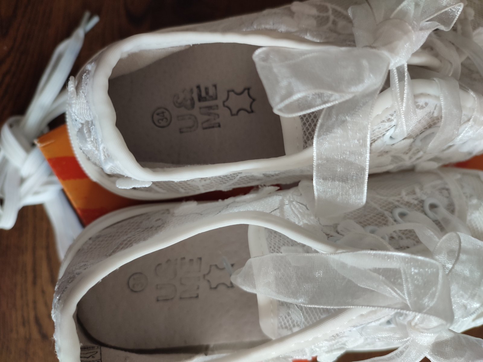 Krásne čipkované dievčenské topánky, veľkosť 34, vnútorná dĺžka 21,5 cm, obuté len raz na 1.sv.prijimani. Bez poškodenia.