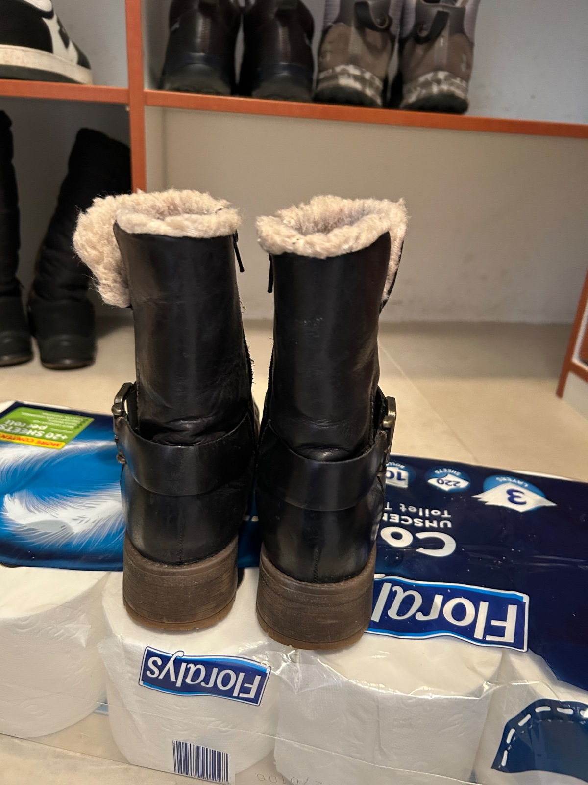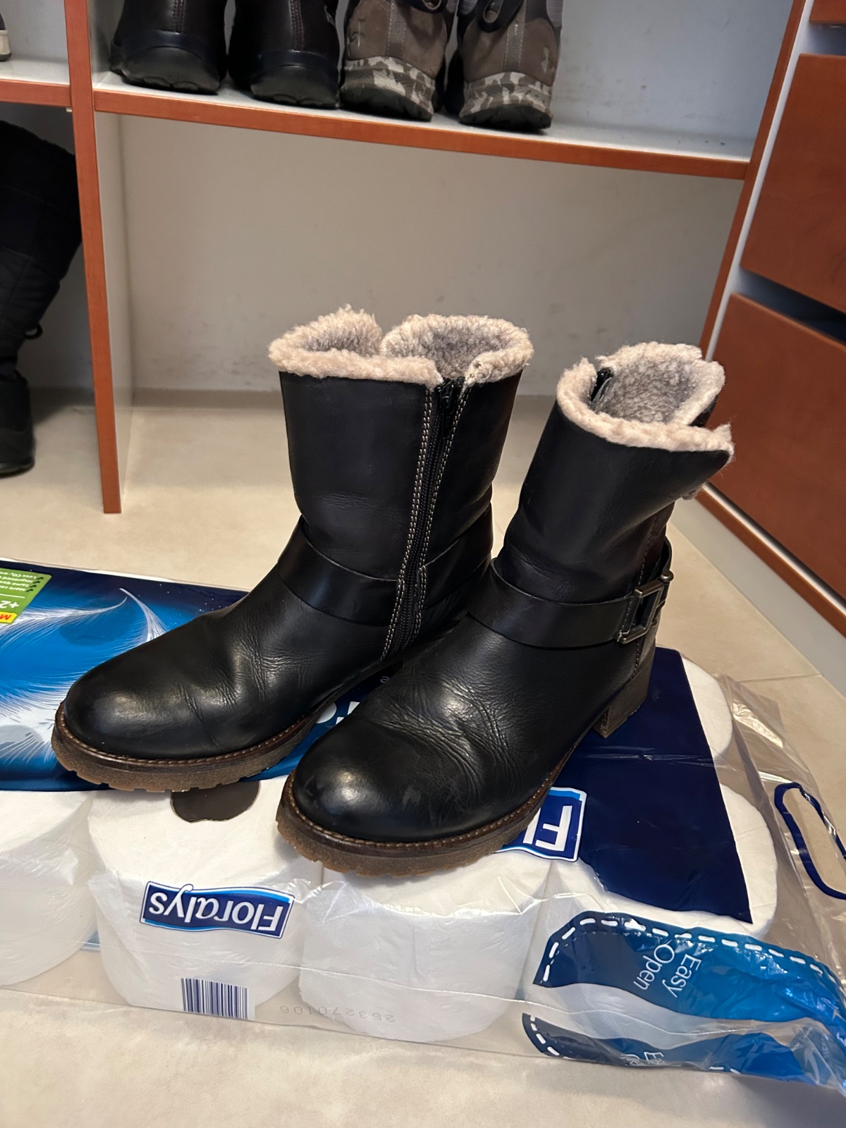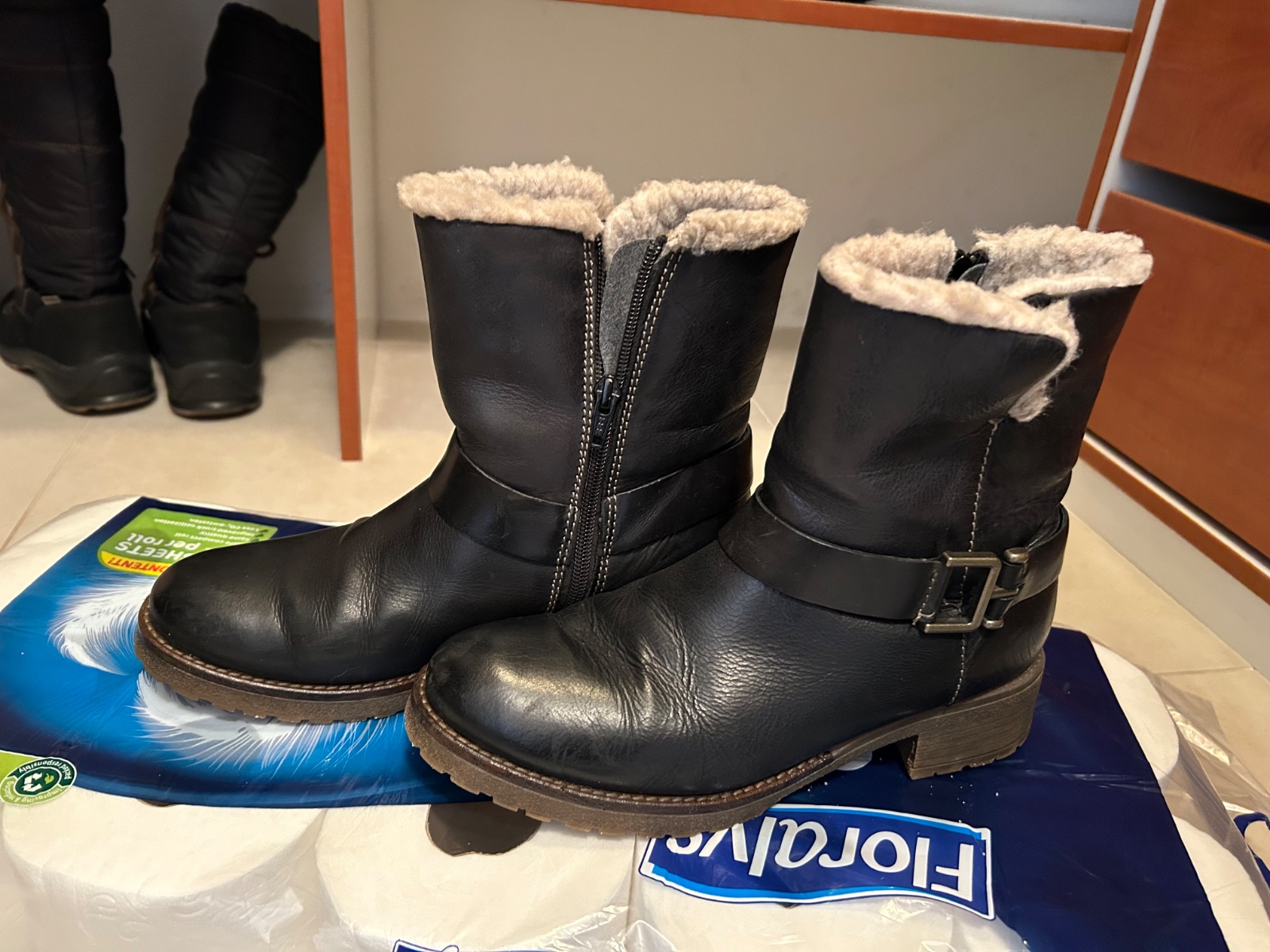 V nosenom stave. Sú kožené dnu kožušinka, zips z vnútornej strany.