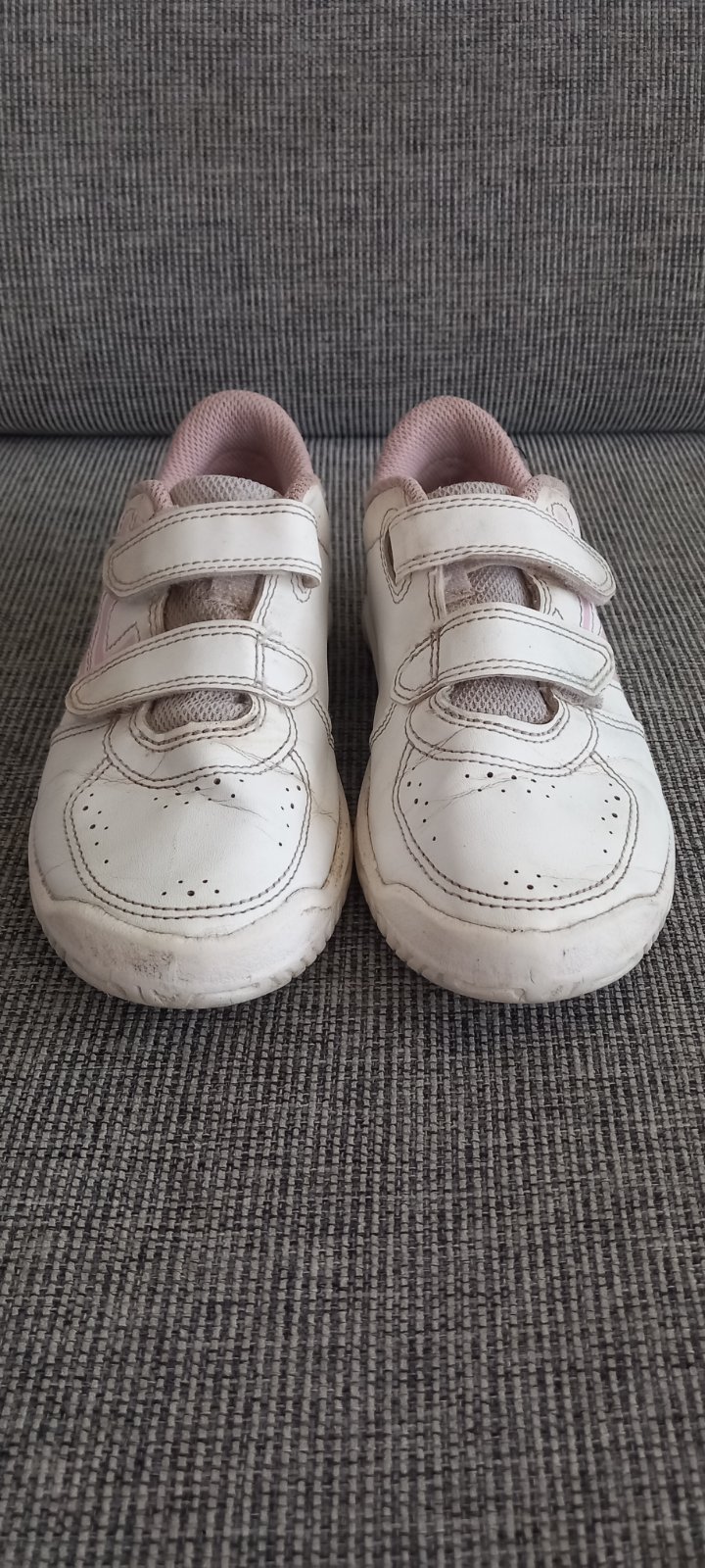 Jeden pár bielych tenisiek kúpených v decathlone. Veľkosť 33, 20,6 cm. Tenisky sú dosť nosené, ale nemajú žiadne diery, vyzerajú tak ako sú nafotené. V bazáriku mám aj viacero iných vecí pri kúpe v...