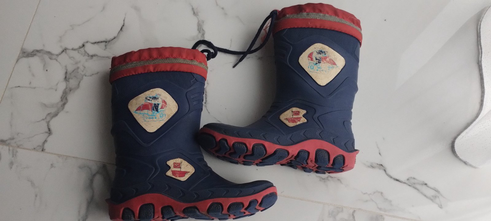 Dvoje zateplené gumáky, kúpené v Lidl. Veľkosť 30/31, vnútorná dĺžka je cca 19 -19,5 cm (ťažko sa to meria). Zvonku tá modrá časť podrážky je 21,5 cm. Gumáky sú nosené, ale nemajú žiadne diery ani ...