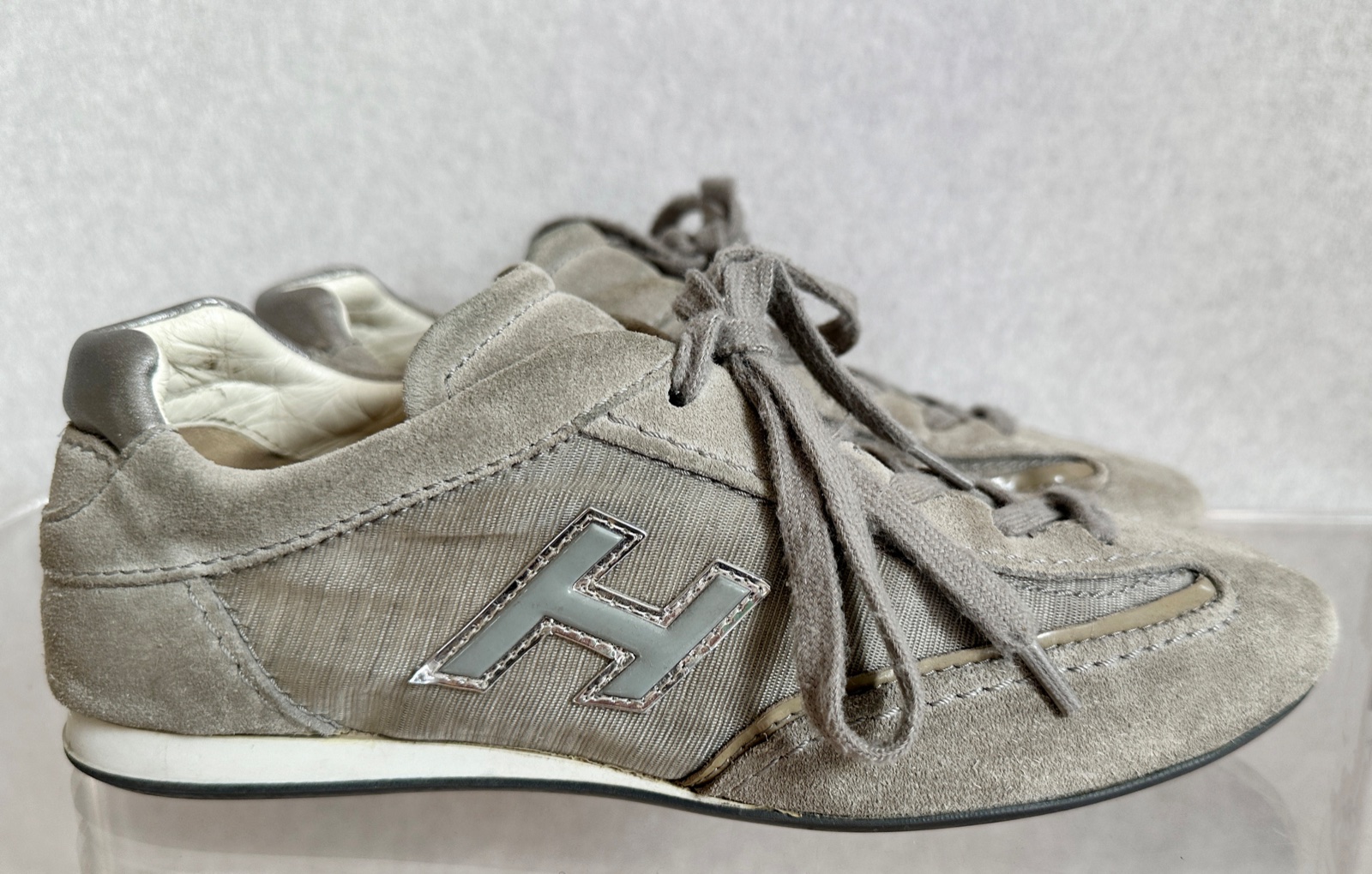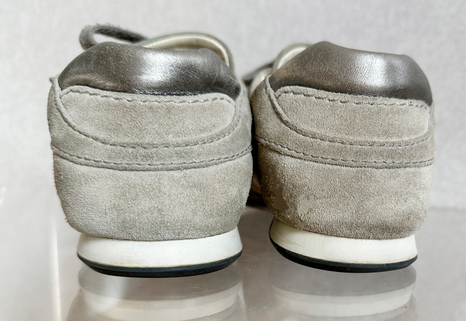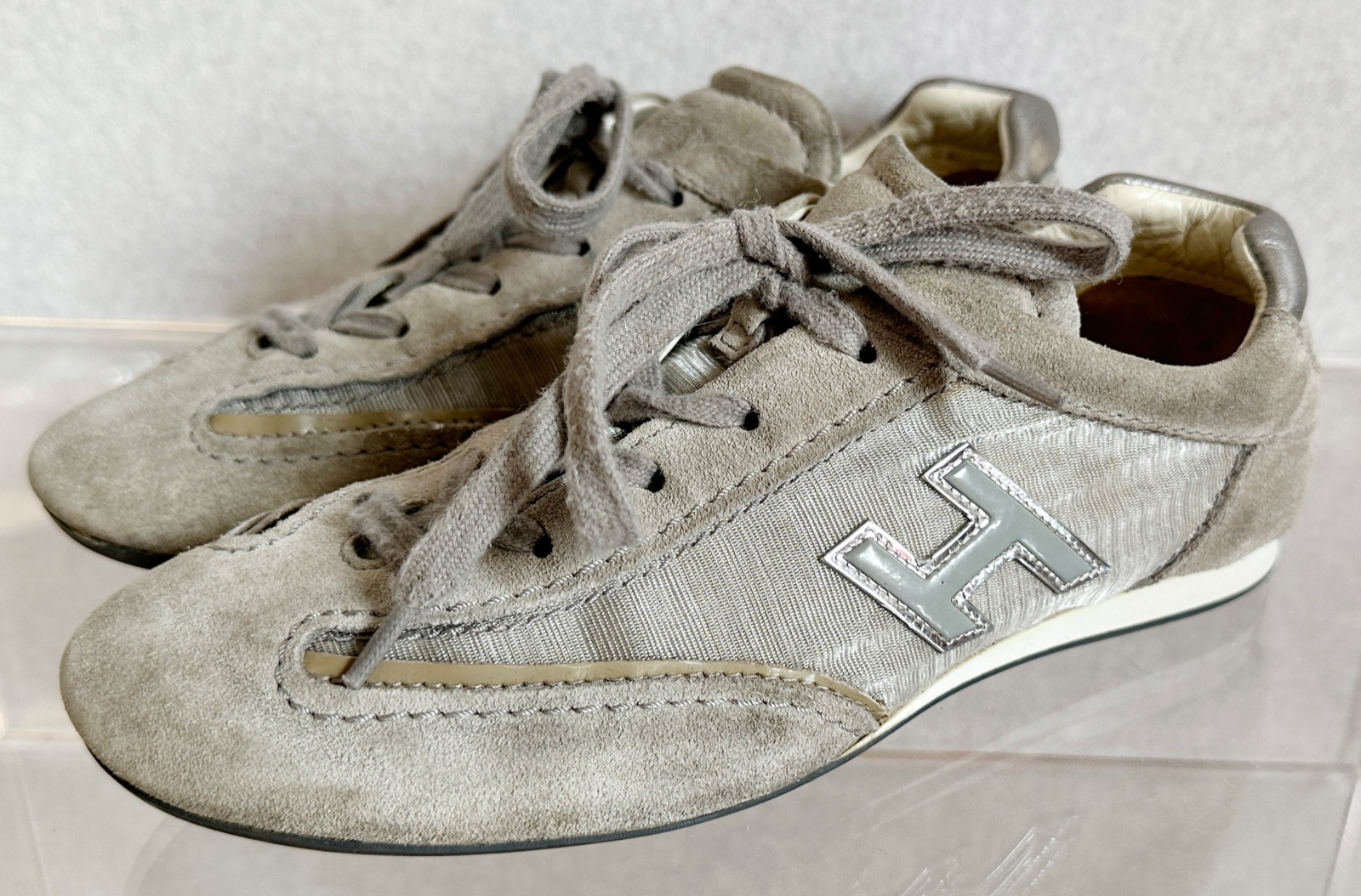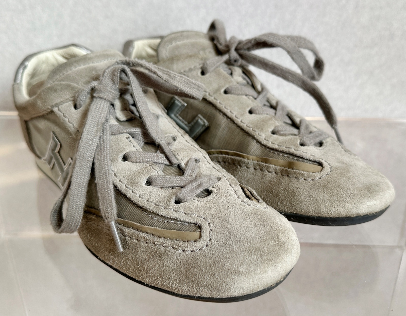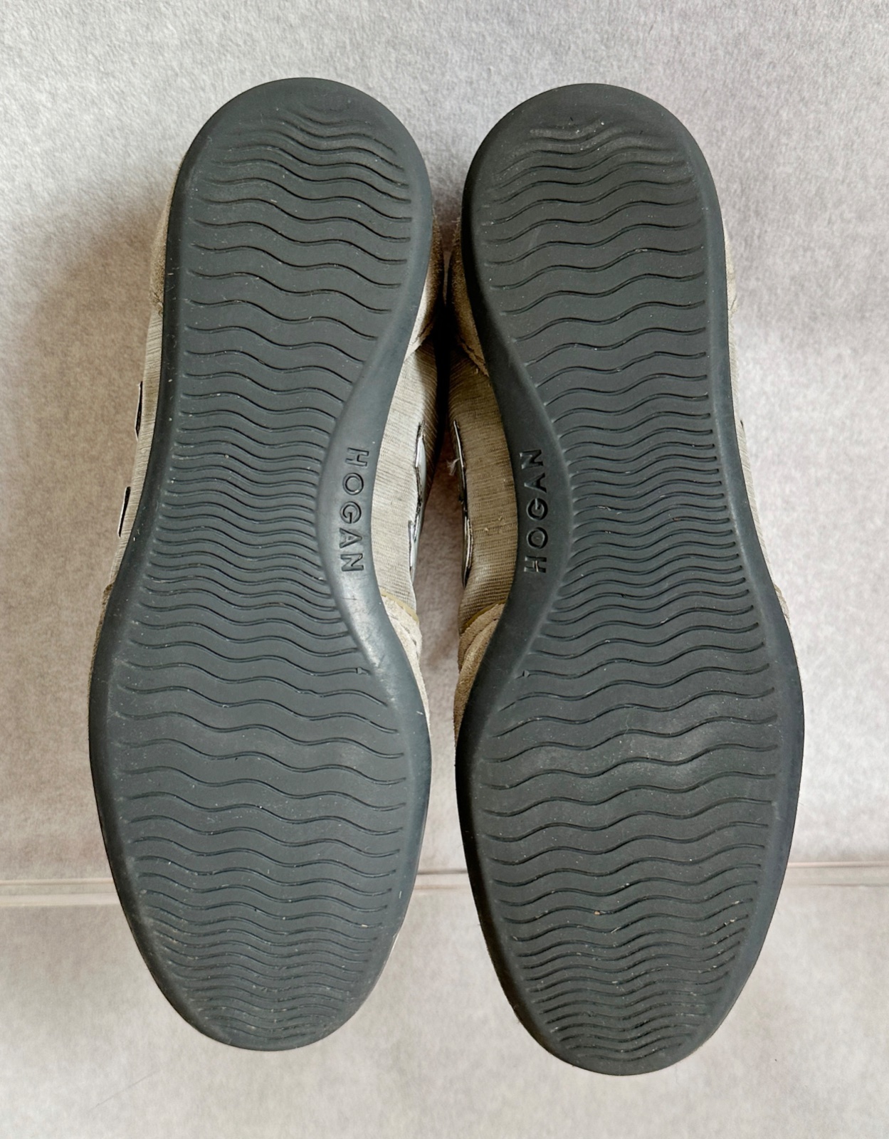 Kvalitné pohodlné štýlové tenisky značky Hogan. Hlavná osnova tenisiek je semišová, vnútorné vložky sú kožené, anatomicky tvarované - dajú sa vyberať. Tenisky majú pružné gumené podrážky. Vo veľmi peknom zachovalom stave. Bez viditeľných poškodení.