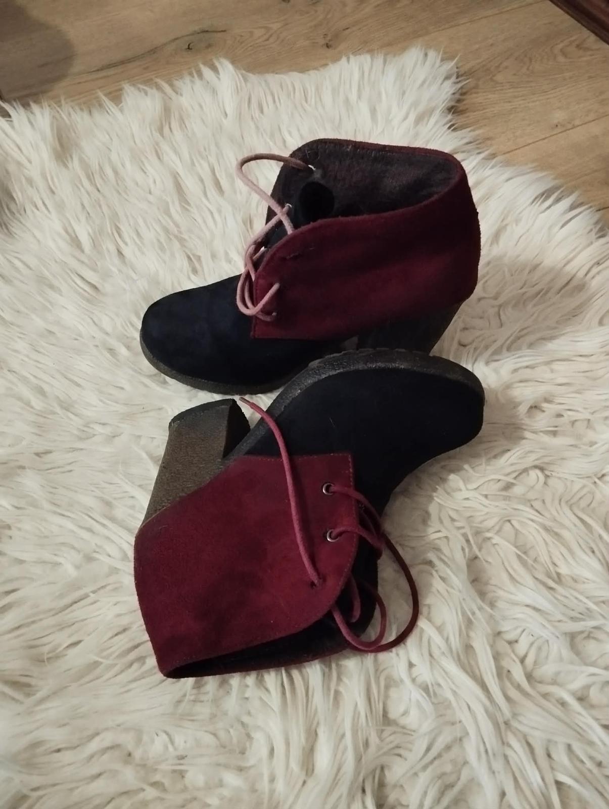 Elegantné dámske členkové čižmy vo dvoch odtieňoch – čierna + bordová, s pohodlným stabilným podpätkom pre každodenné nosenie aj výnimočné príležitosti.