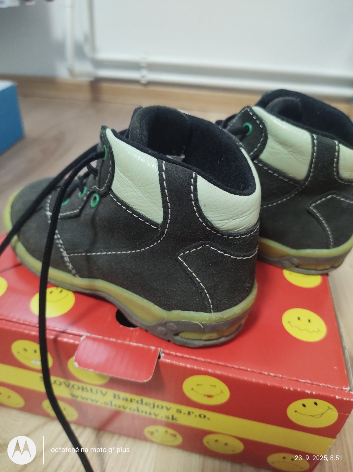 Kožené jarné - jesenné topánočky. Obuté jeden krát. Ľahké a ohybné . Slovenský výrobca Slovobuv Vyrobené z prírodnej kože, veľmi príjemné na dotyk, mäkké a vysoko odolné. Gumená, mäkká podrážka s ...