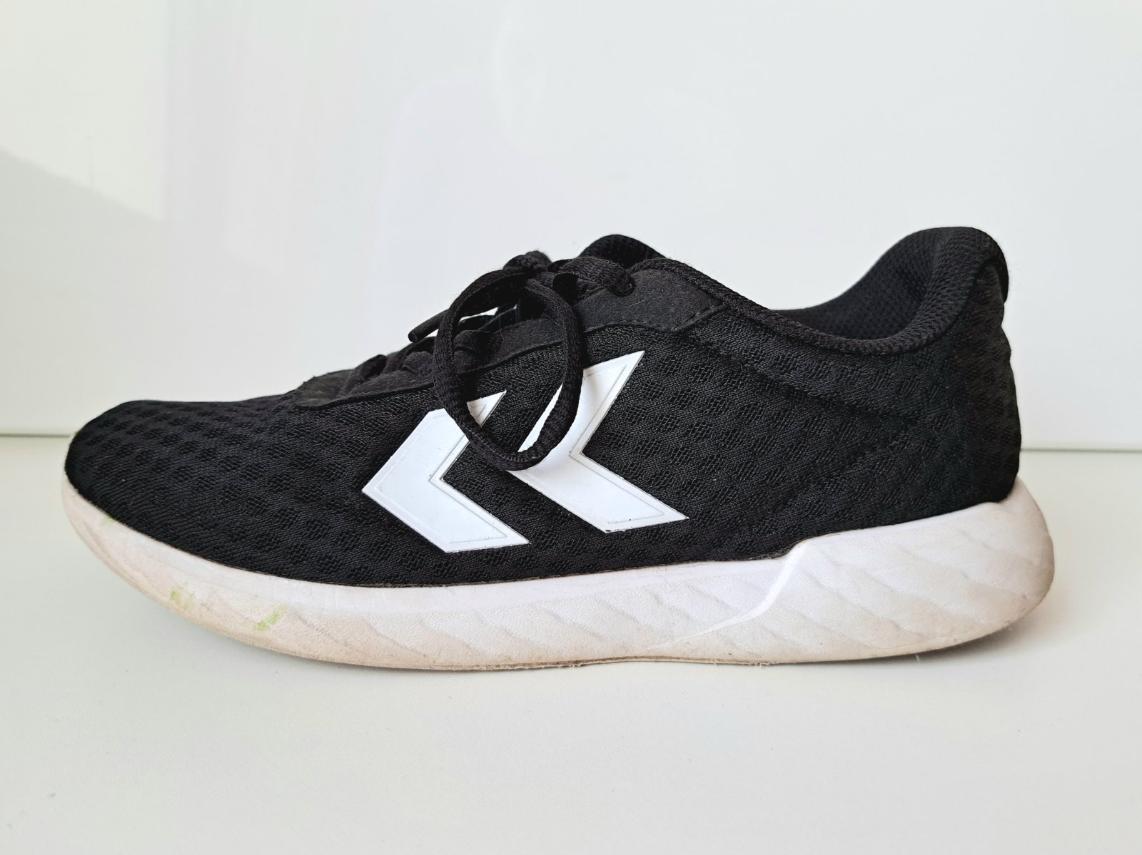 Zn. Hummel. Ľahučké, priedušné, pohodlné. Biela gumenná podrážka vpredu na okraji ošúchaná (premietnuté do ceny), inak vo výbornom nosenom stave bez poškodení. Vhodné na telesnú výchovu. VD = 23,5 cm