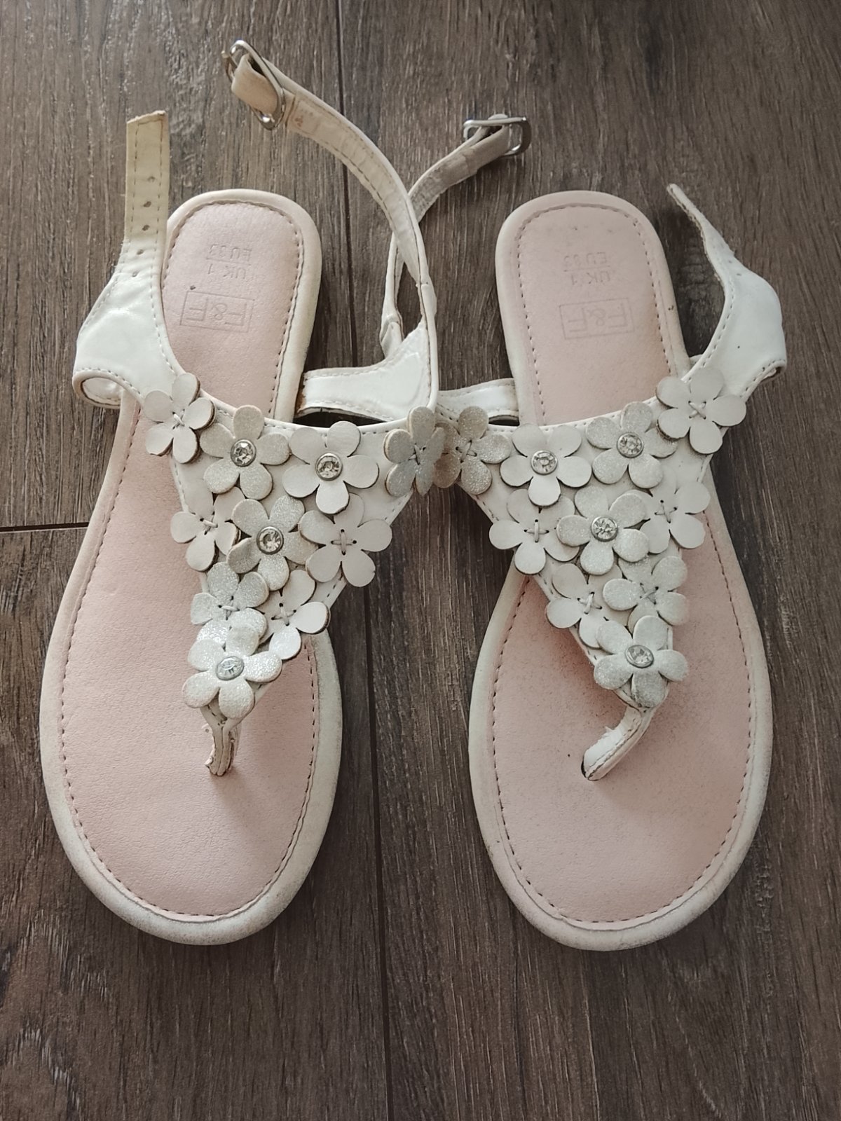 Remienkové sandálky krémovej farby s leskom Zn.F&F, vel.33, vnútorná dĺžka 20,8cm Asi len raz obuté, no vpredu sa stihli mierne okopať Stav ako na foto Zohľadnené v cene